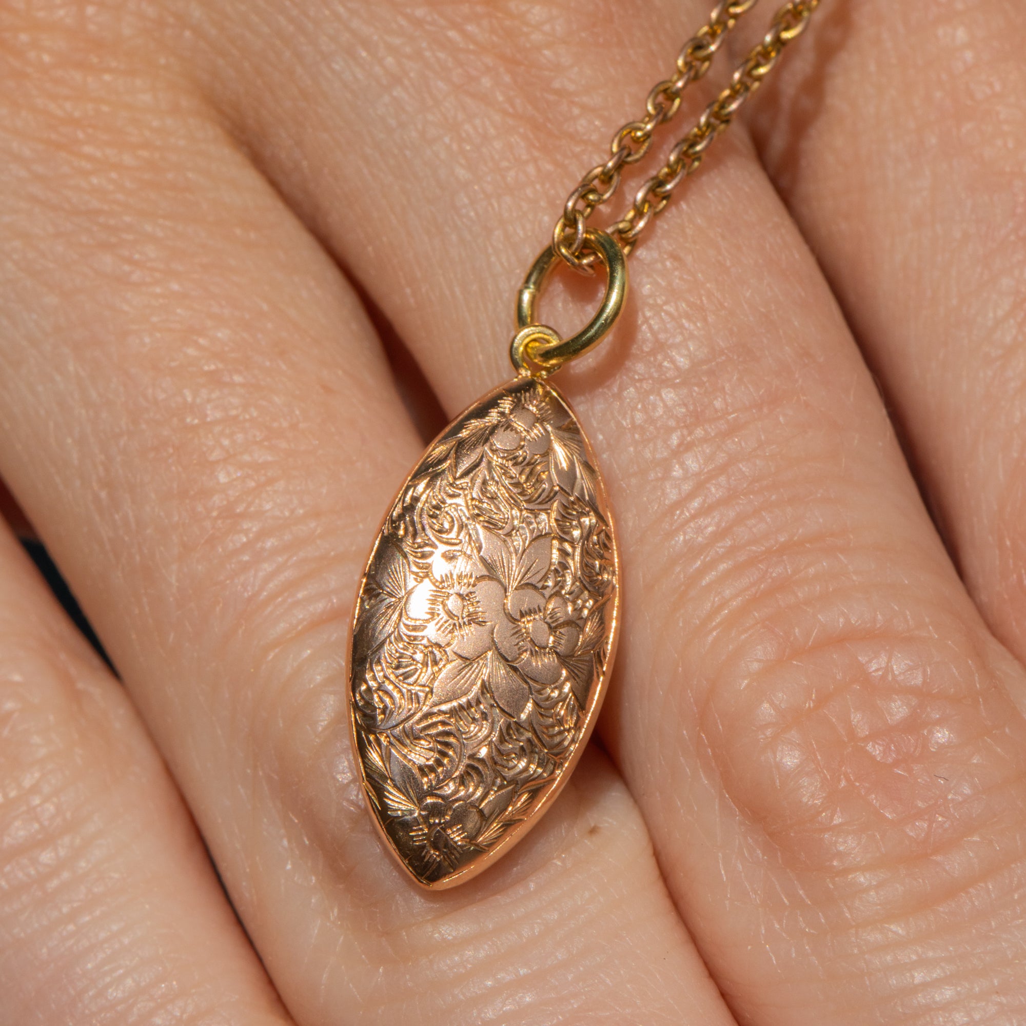 EXCELLENT. We are pleased to present this Edwardian 15ct Gold floral engraved pendant in excellent condition. The engravings are sharp and her form has held up well throughout the years. You won't be able to keep your hands off this antique pendant from the moment she is in your possession!