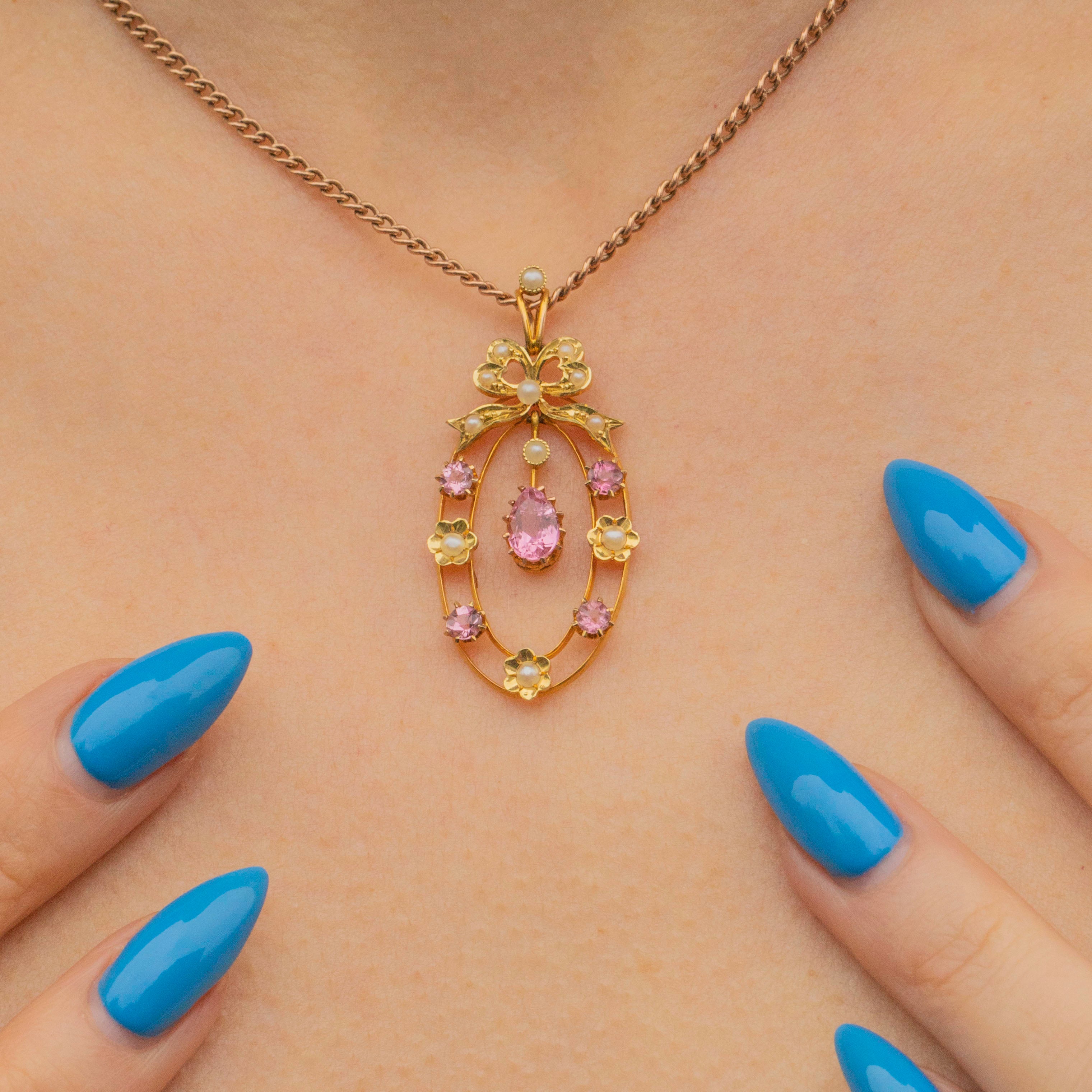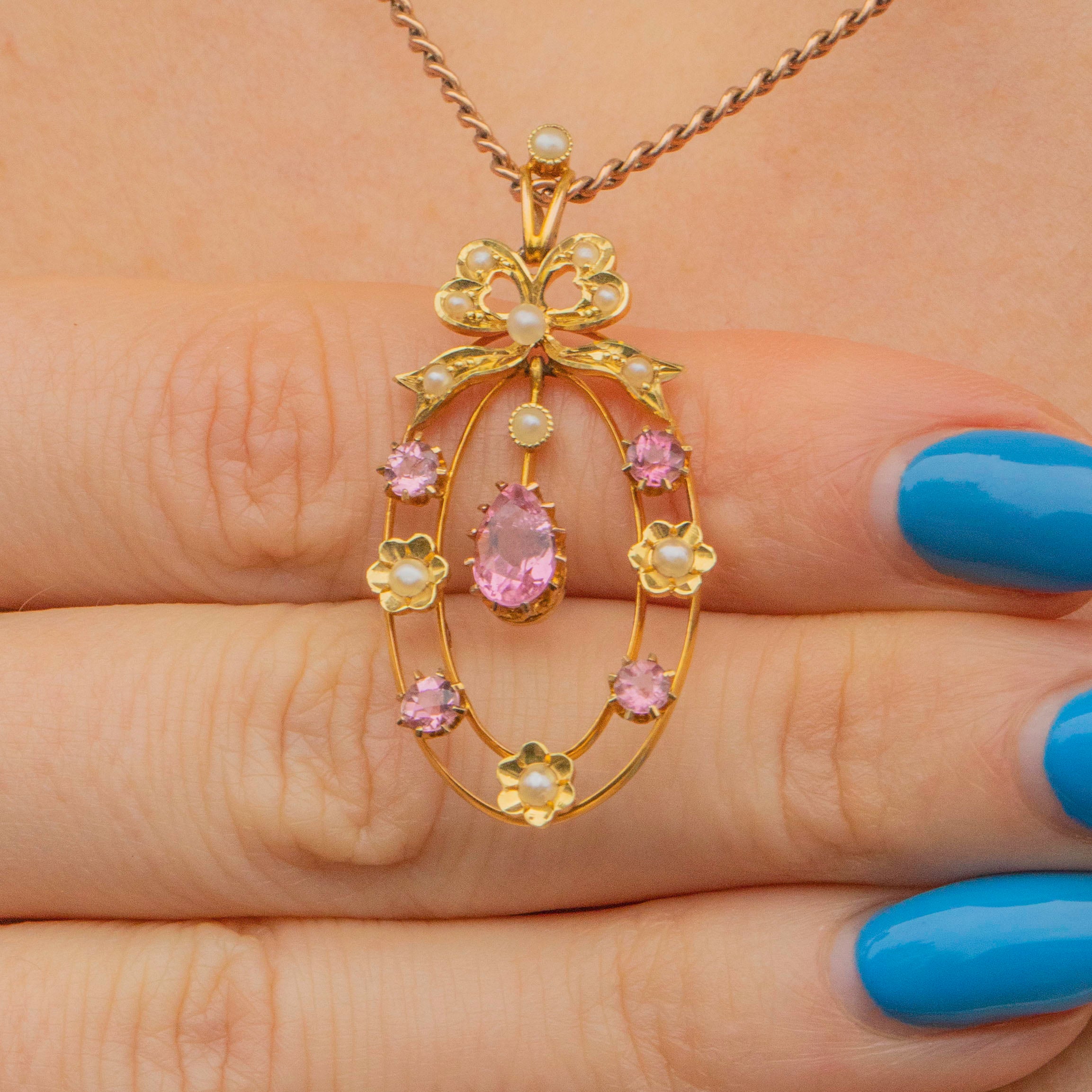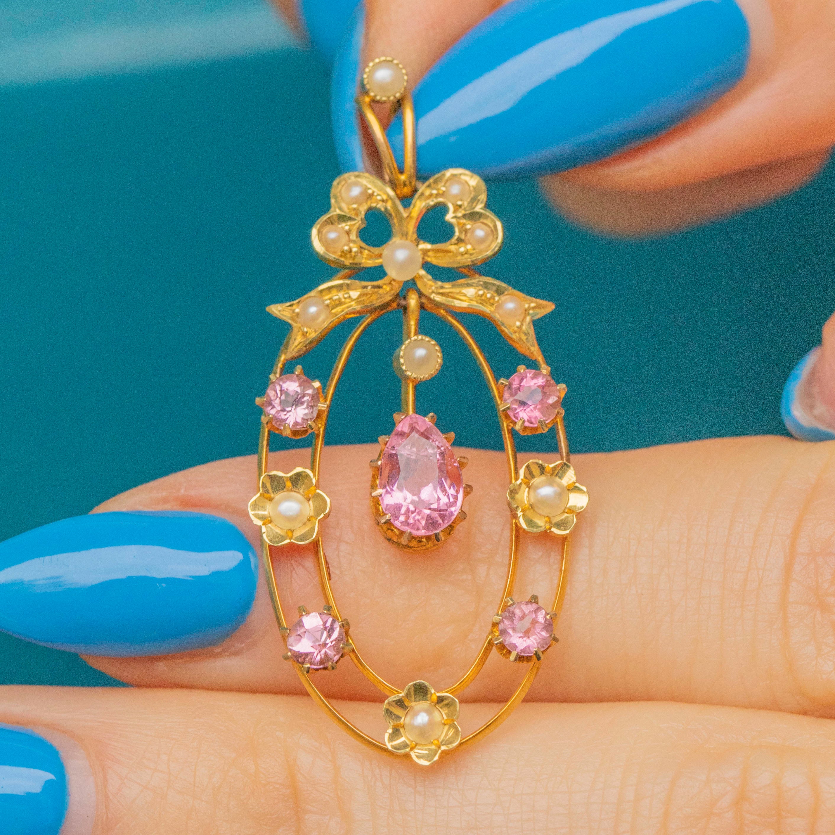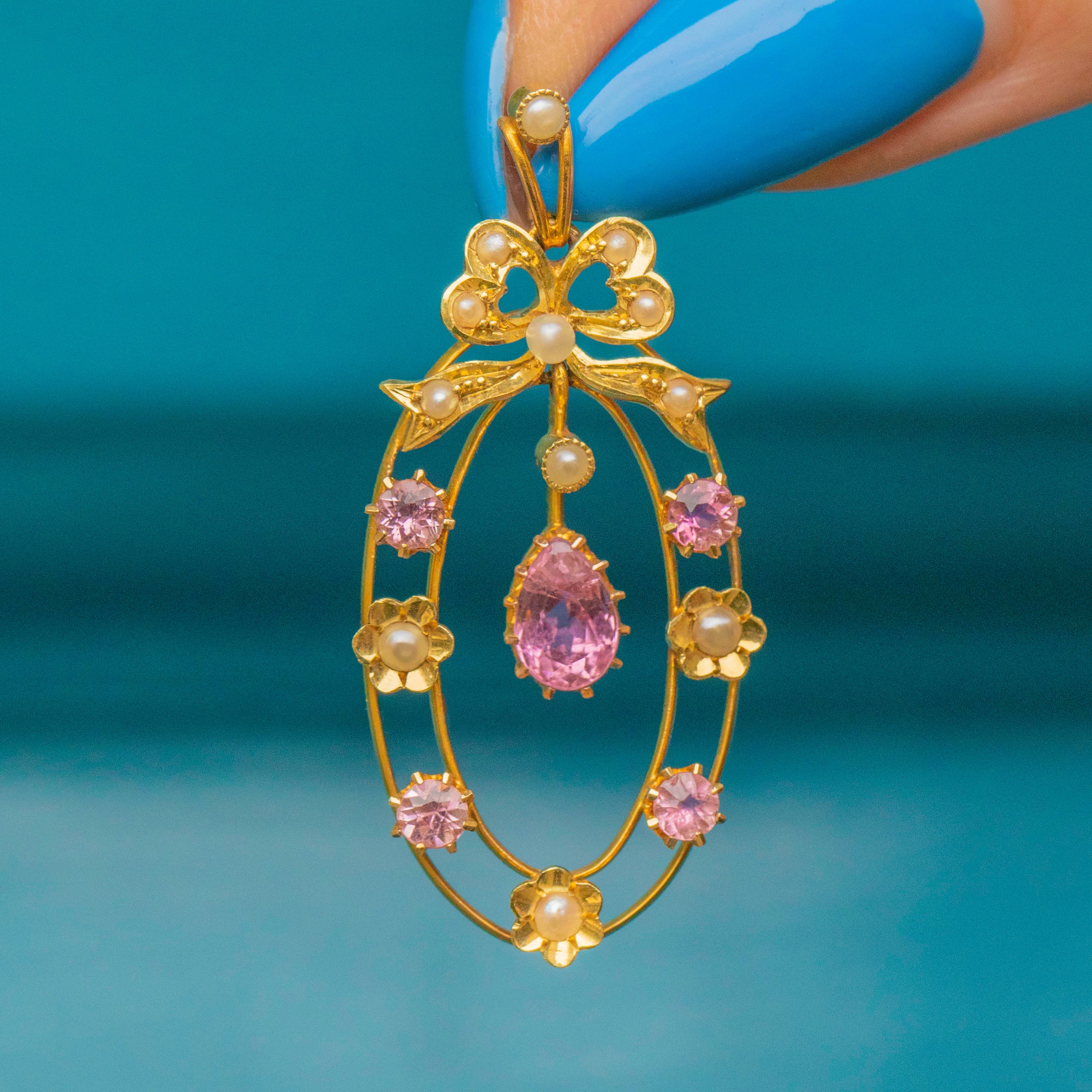Edwardian 15ct Gold Pink Tourmaline Pearl Pendant, Ribbon Top