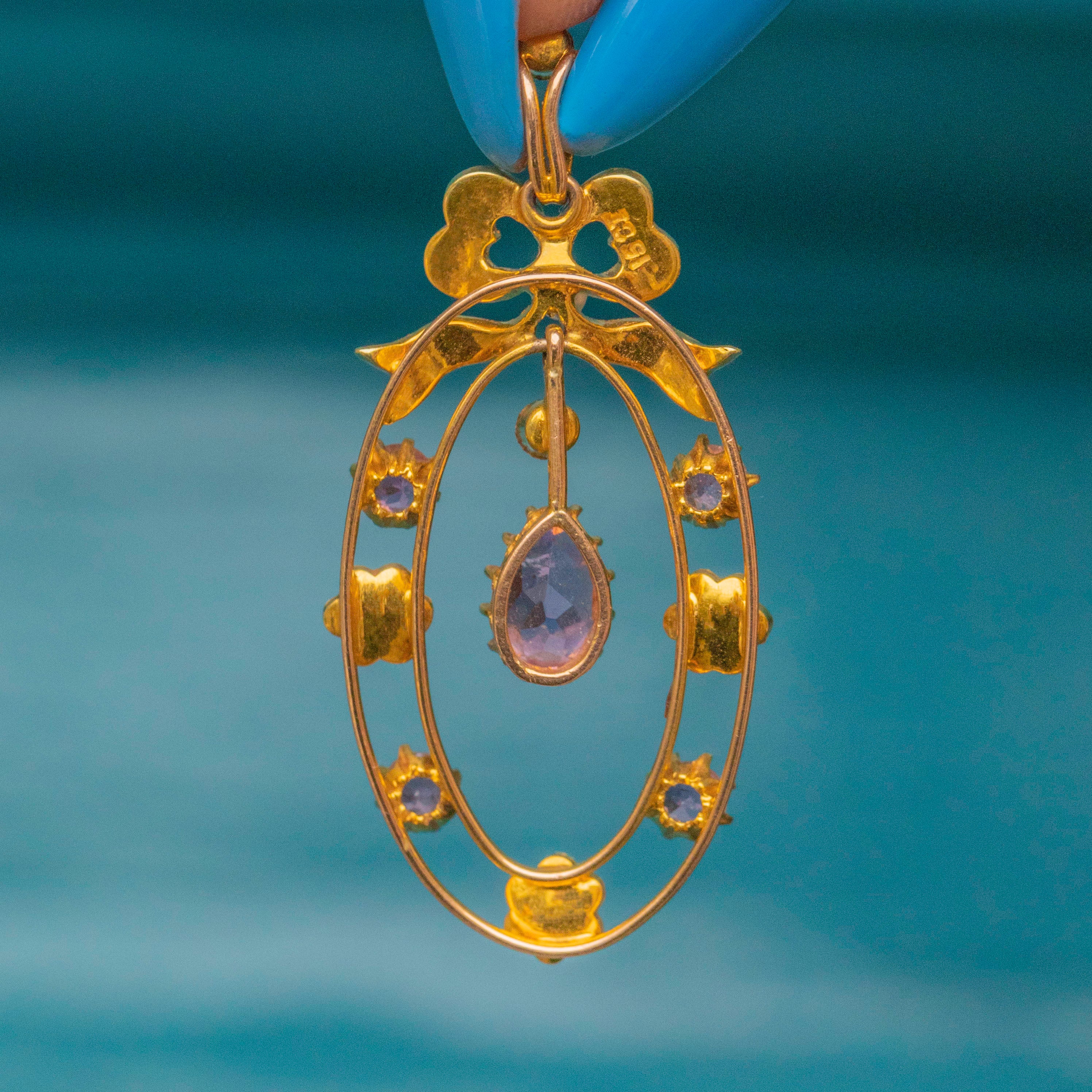 We adore this Edwardian 15ct Gold Pink Tourmaline and Pearl pendant! A graceful example of the beauty of Edwardian craftsmanship, this antique pendant is crafted from buttery 15ct yellow Gold, with an adorable ribbon motif for an added touch of whimsical charm.