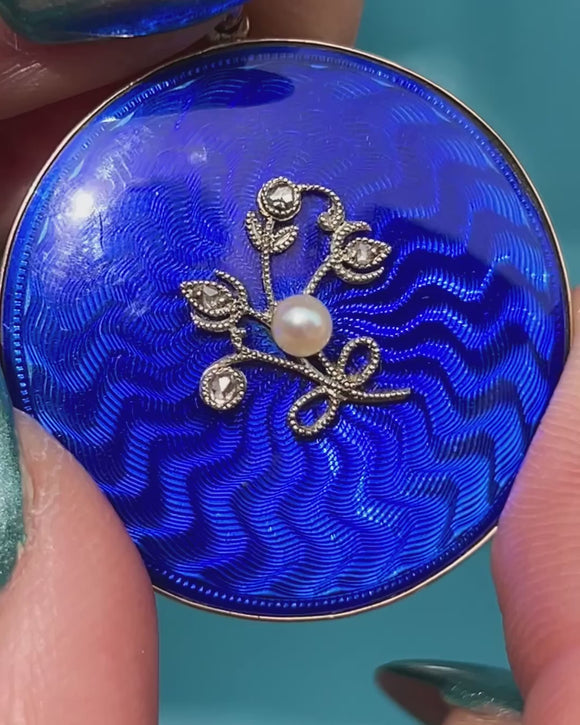 Edwardian 15ct Gold Royal Blue Guilloche Enamel Locket with Pearl Diamond Flower