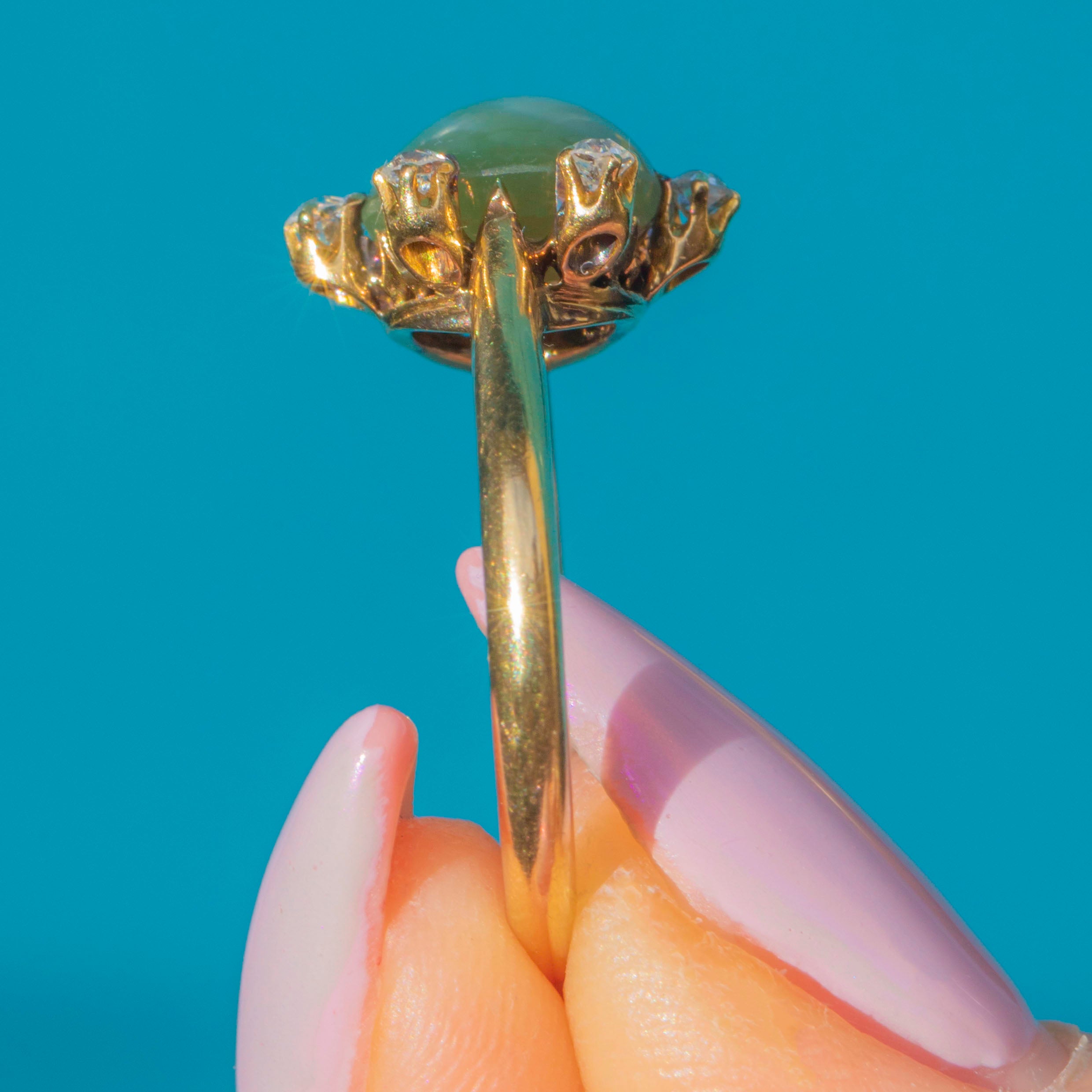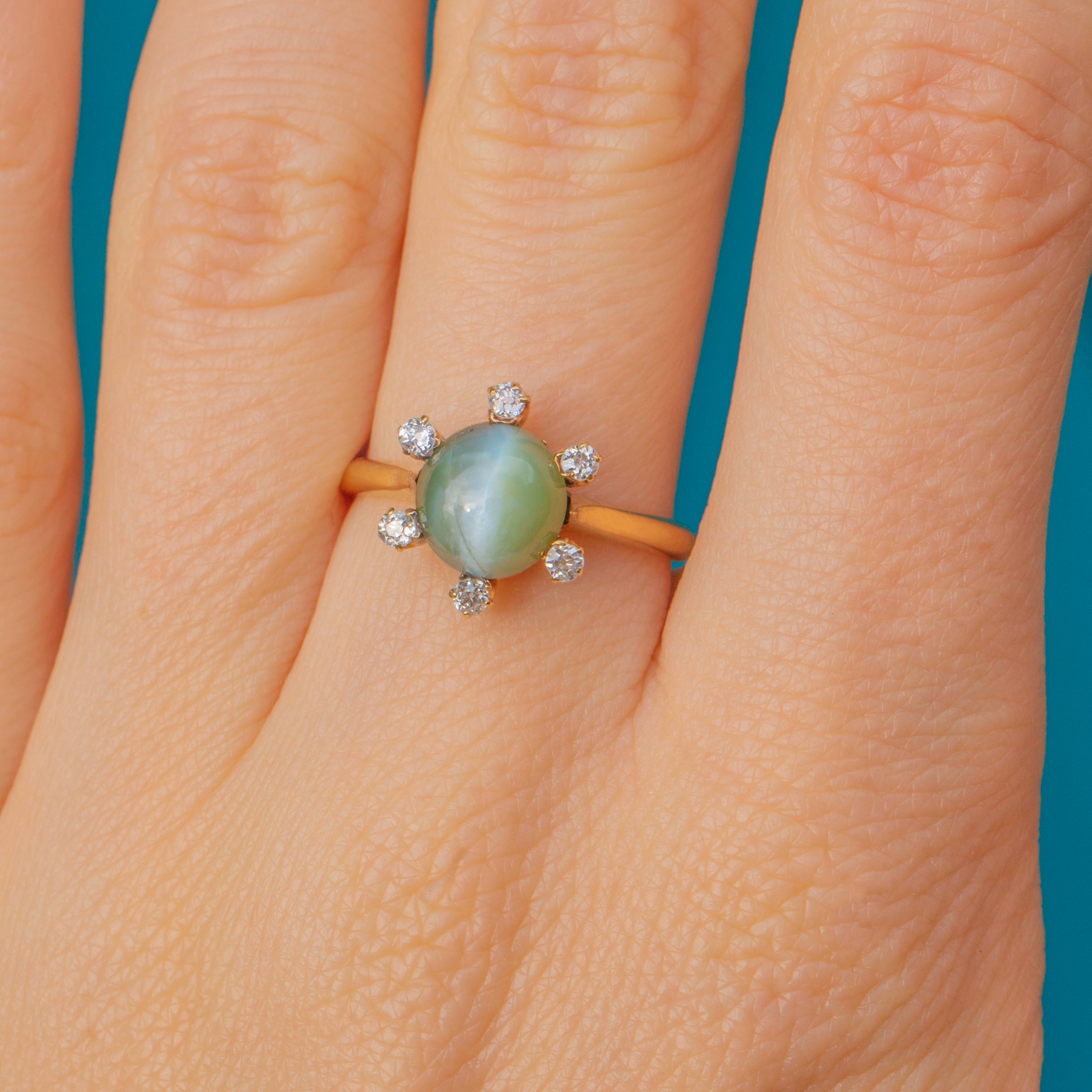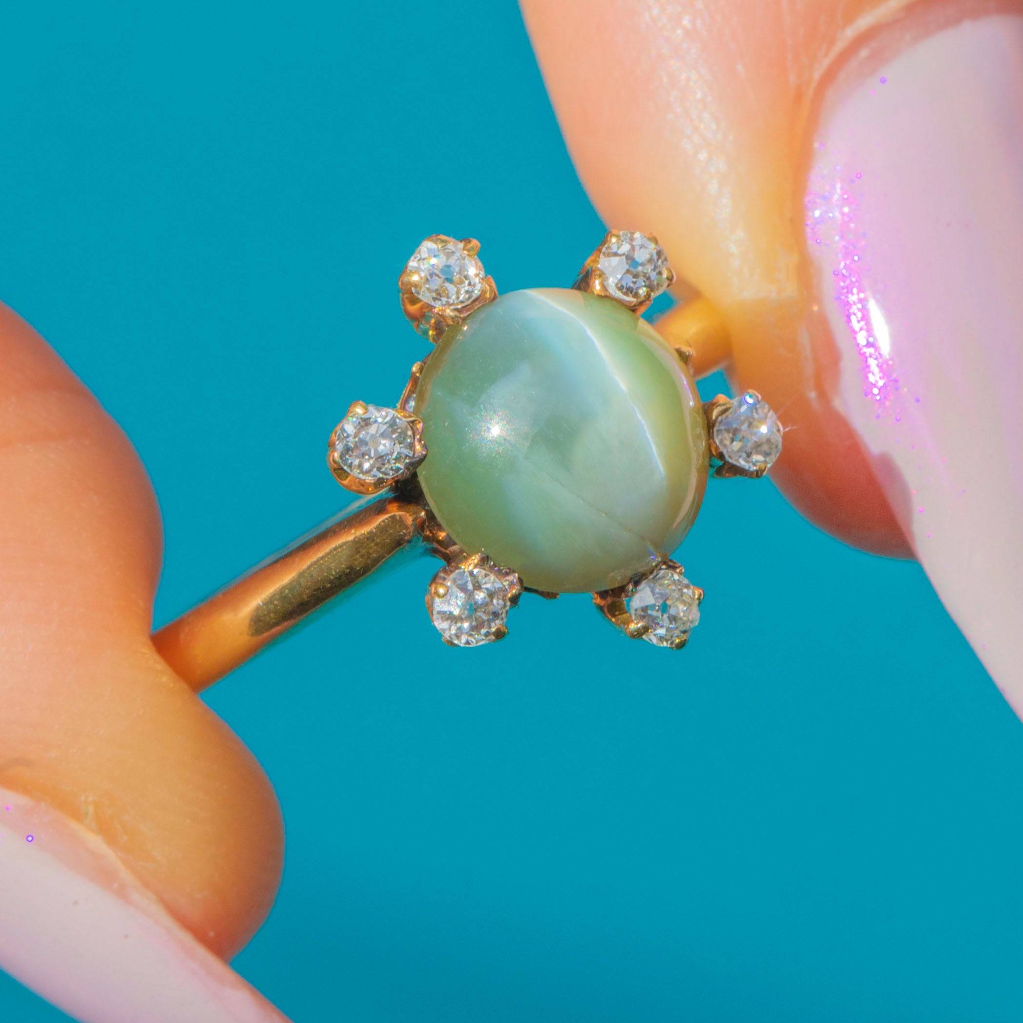 A captivating post Edwardian ring featuring a glowing Cat’s Eye Chrysoberyl with a fine natural chatoyancy, creating a mesmerising line of light that glides across the surface as it moves. The gem’s subtle green-gold hue is beautifully complemented by the warm tone of the 18ct Gold, with small twinkling Diamond accents haloing its circumference, adding delicate sparkle.