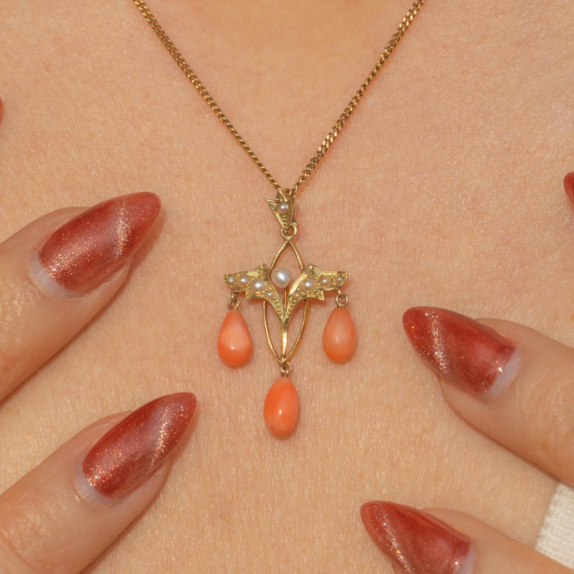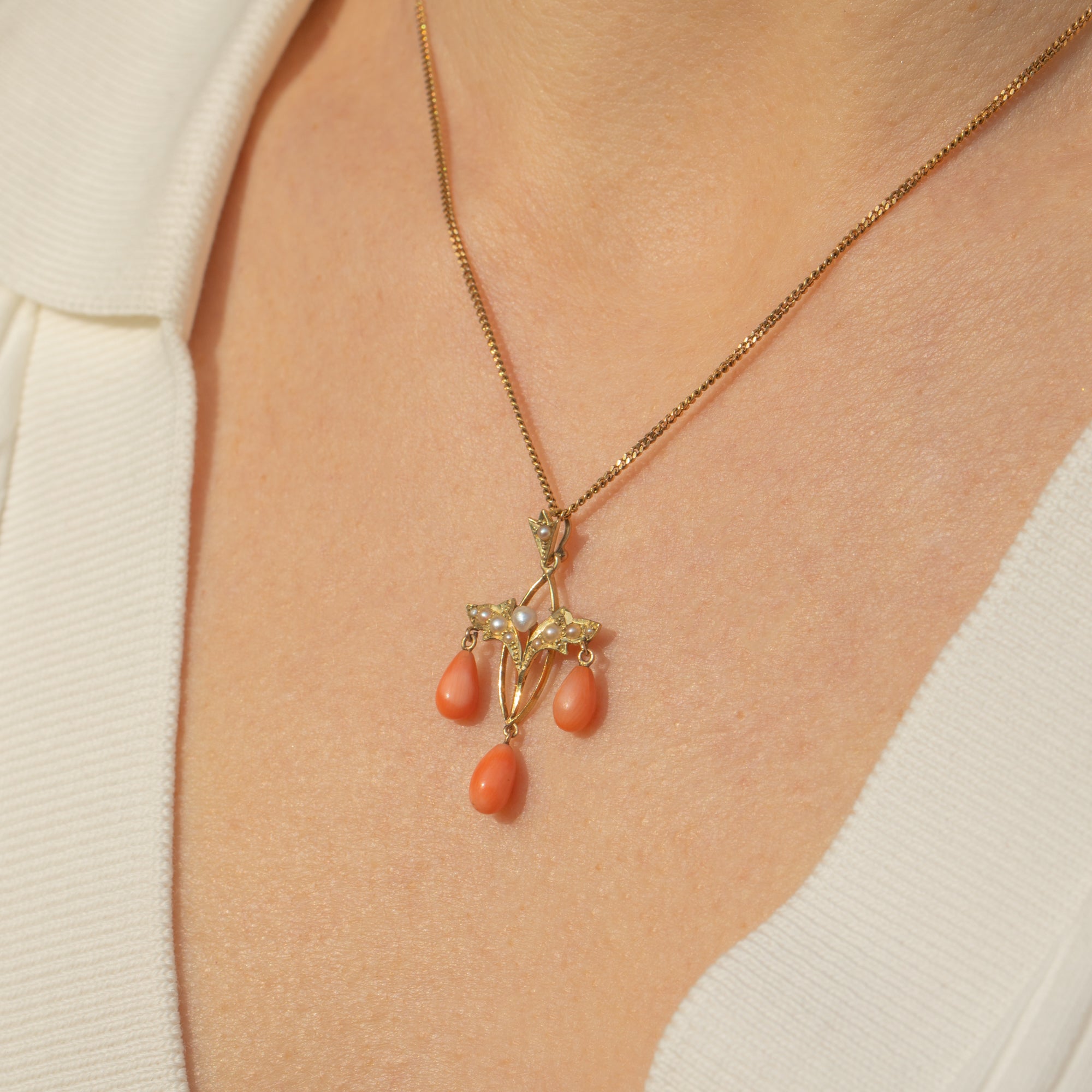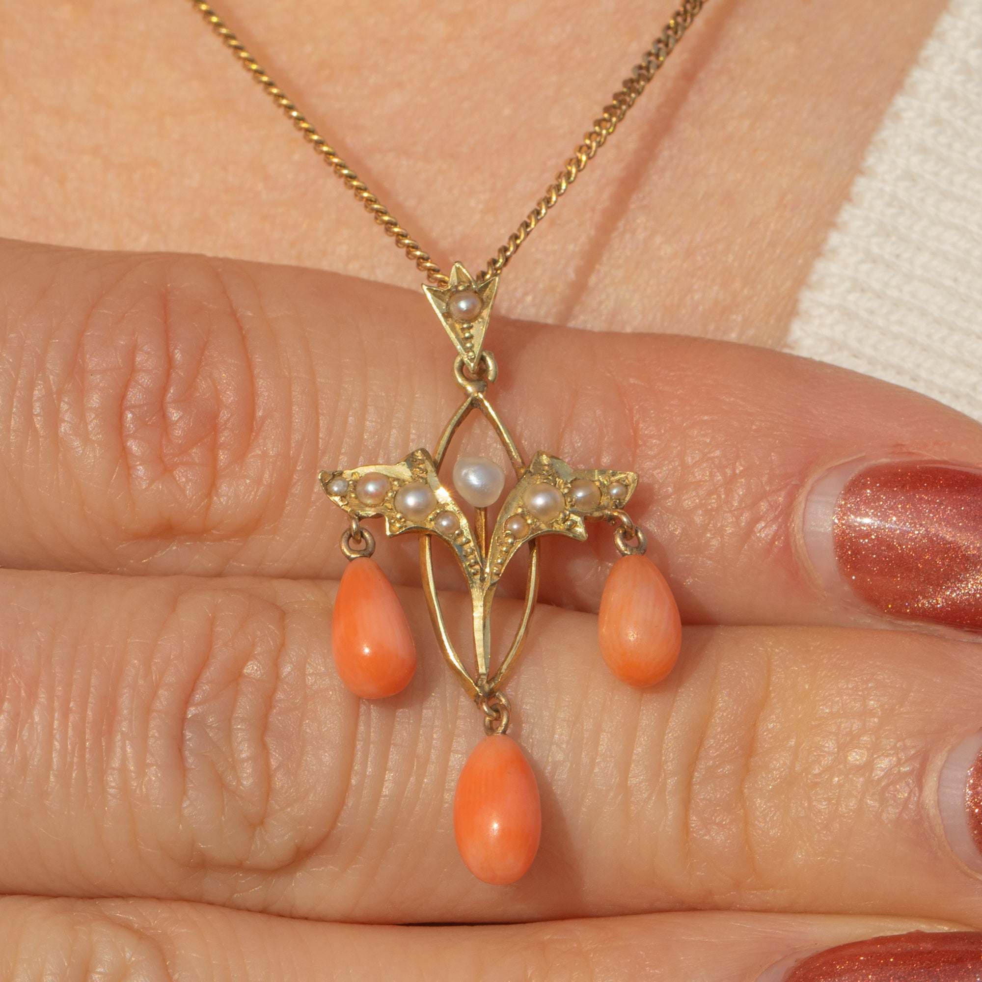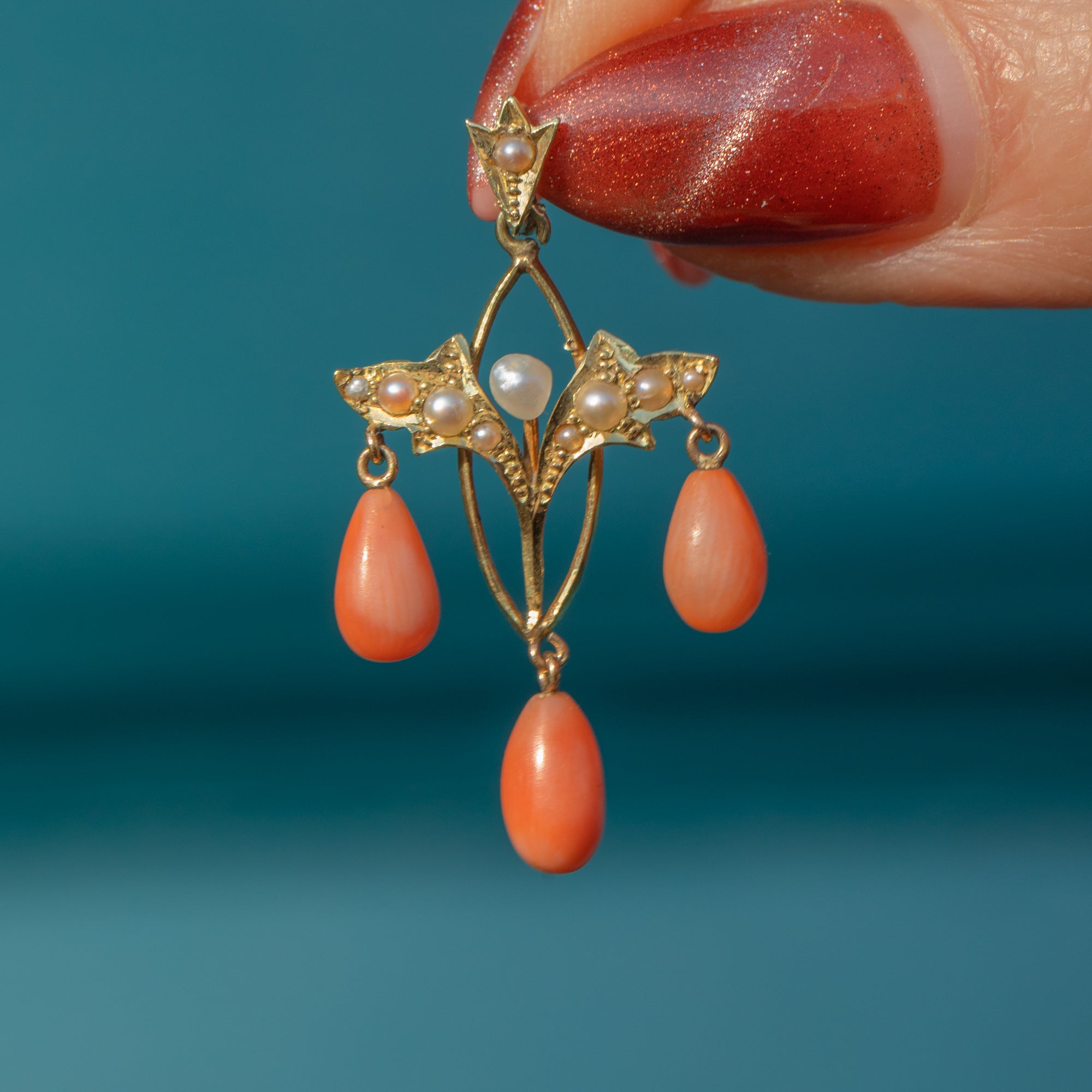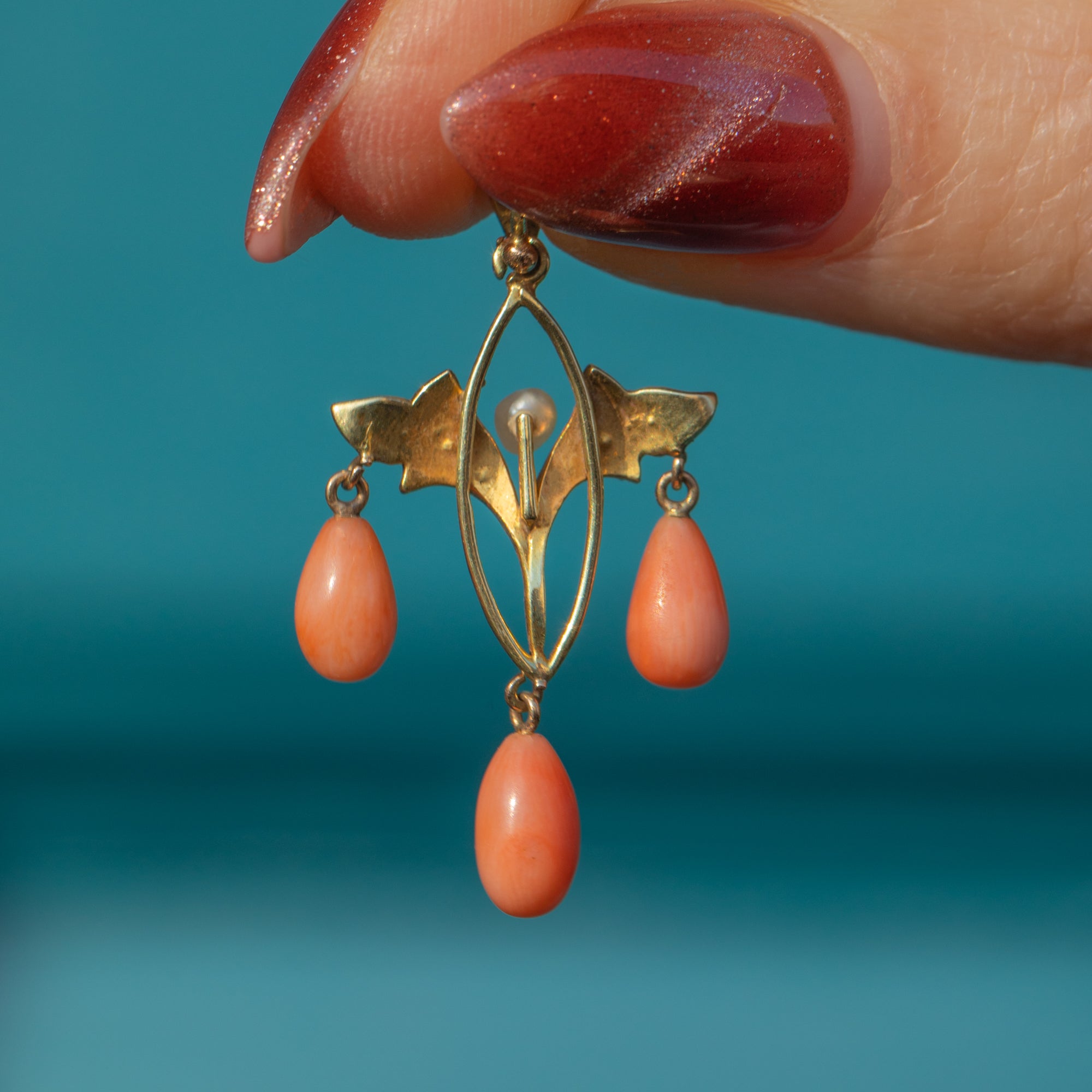 This Edwardian 18ct Gold Coral Pearl drop pendant is full of antique charm!