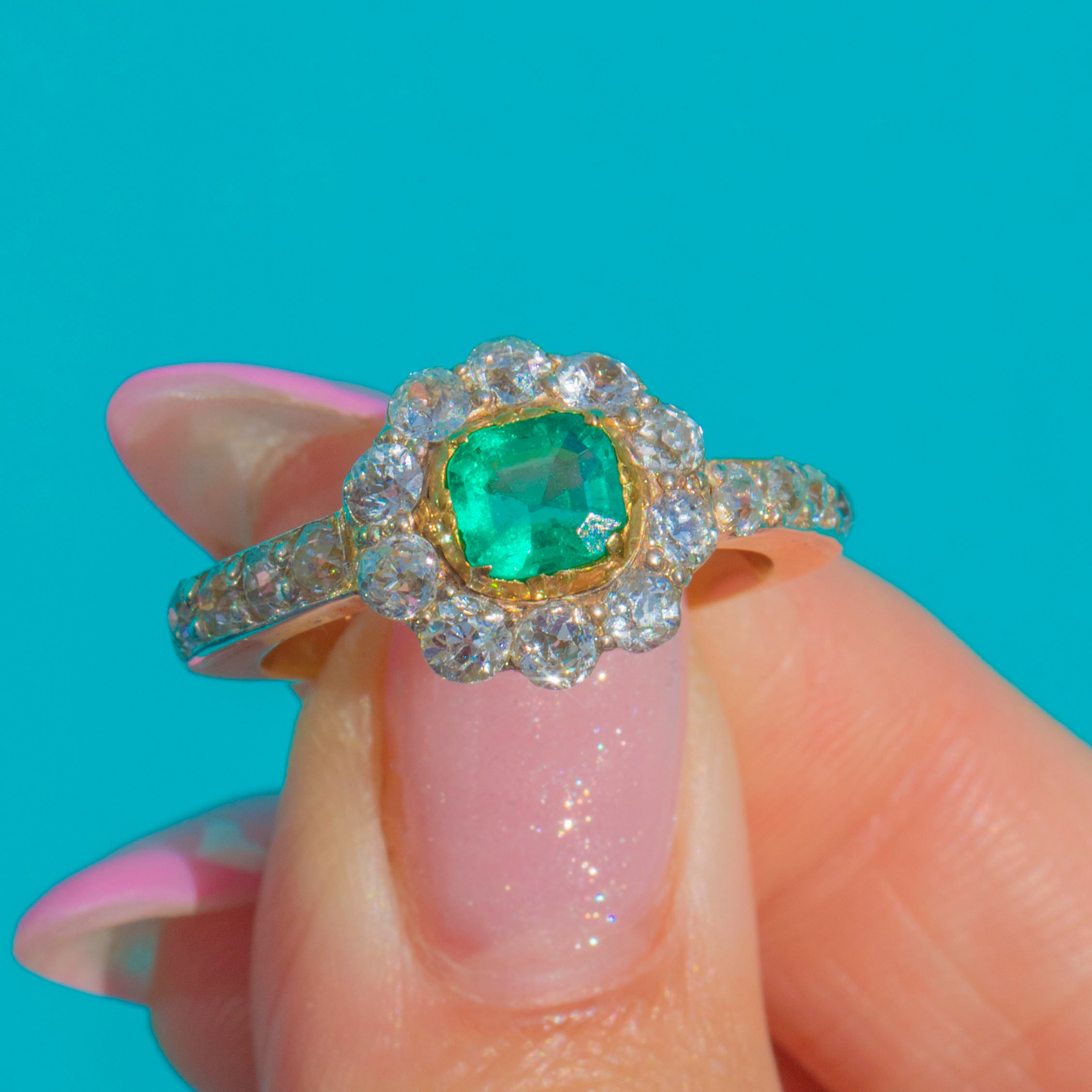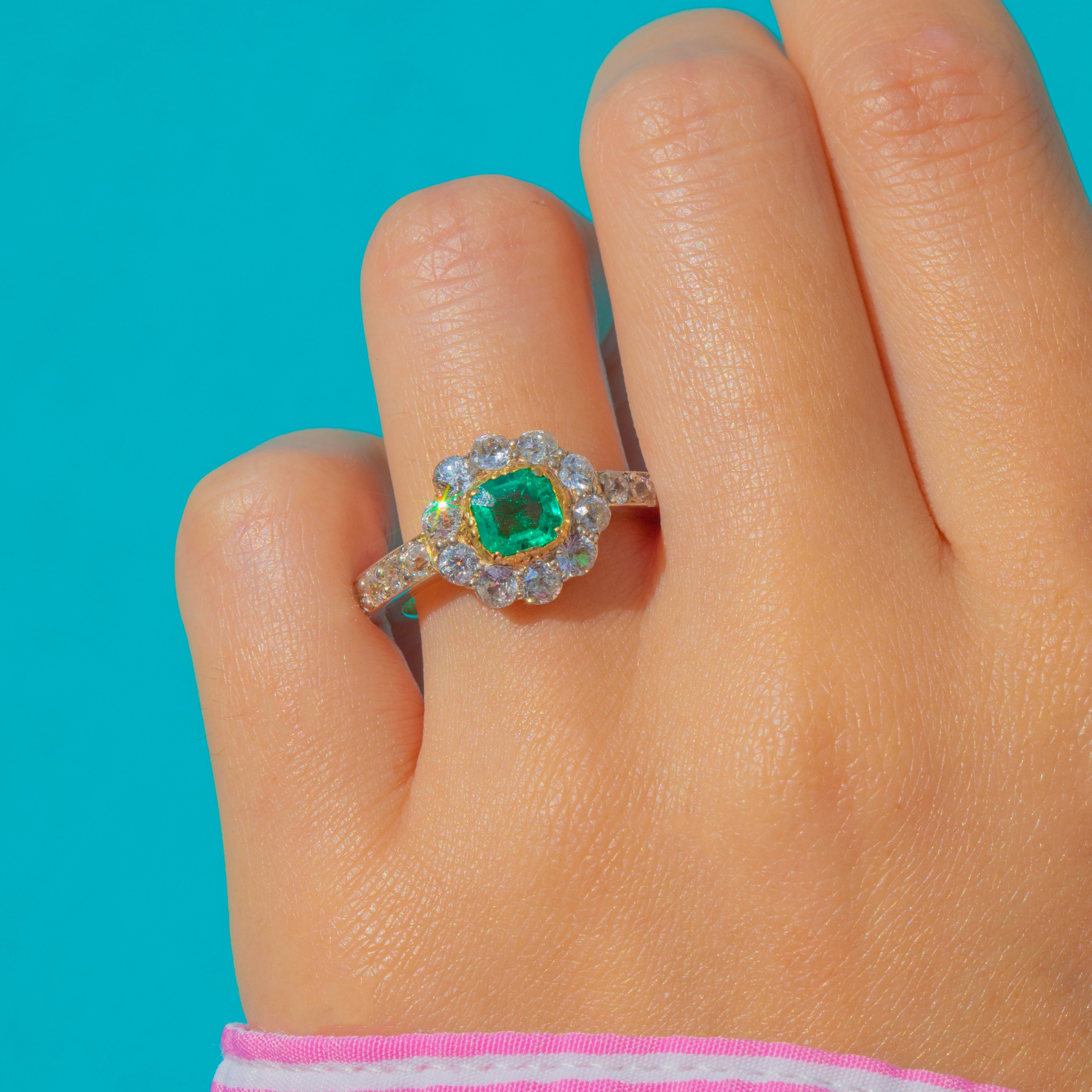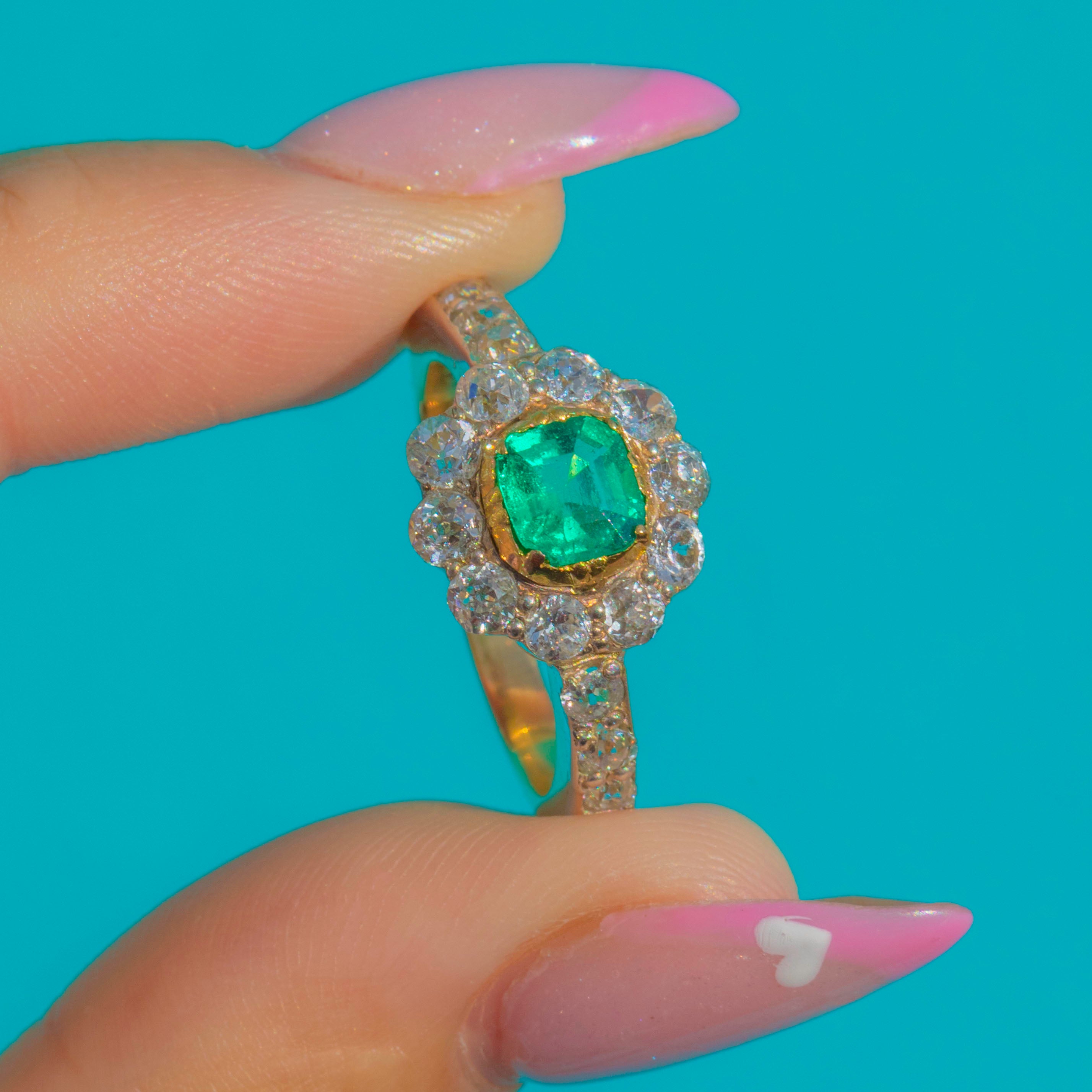 EXCELLENT: The Emerald is richly coloured with fine clarity and minimal natural inclusions. Diamonds are bright, well-matched and securely set. The Gold and Silver retain a beautiful antique polish, with no thinning or wear to the band. A superbly preserved Edwardian cluster ring of outstanding quality.