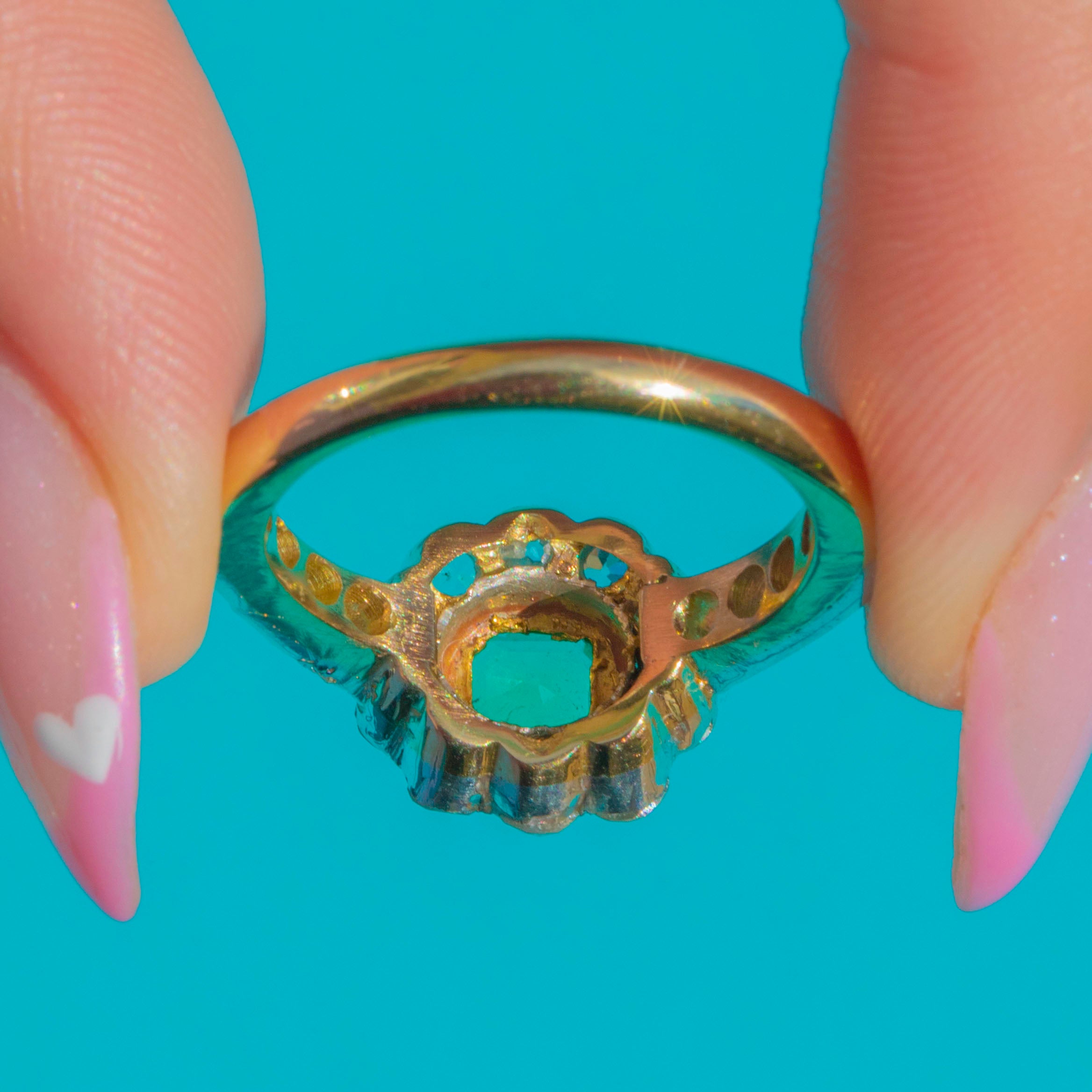 Antique 18ct Gold Emerald Ring with Diamond Halo