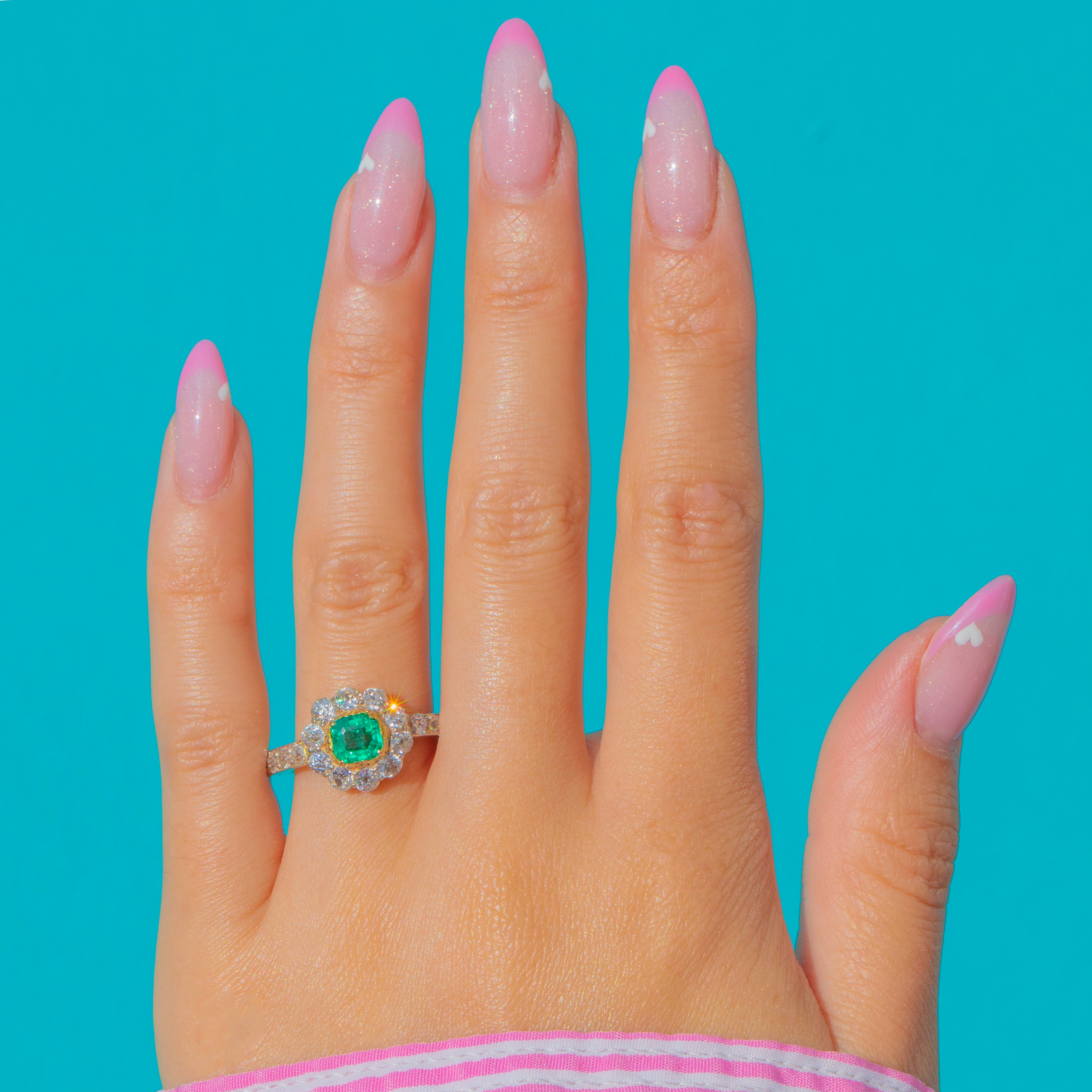 A magnificent late-Victorian ring centring on a vivid 0.70ct Emerald framed by 0.60cts of sparkling old mine-cut Diamonds. The radiant green of the Emerald is perfectly complemented by the warmth of the 18ct Gold, showcasing exceptional early 20th-century craftsmanship.