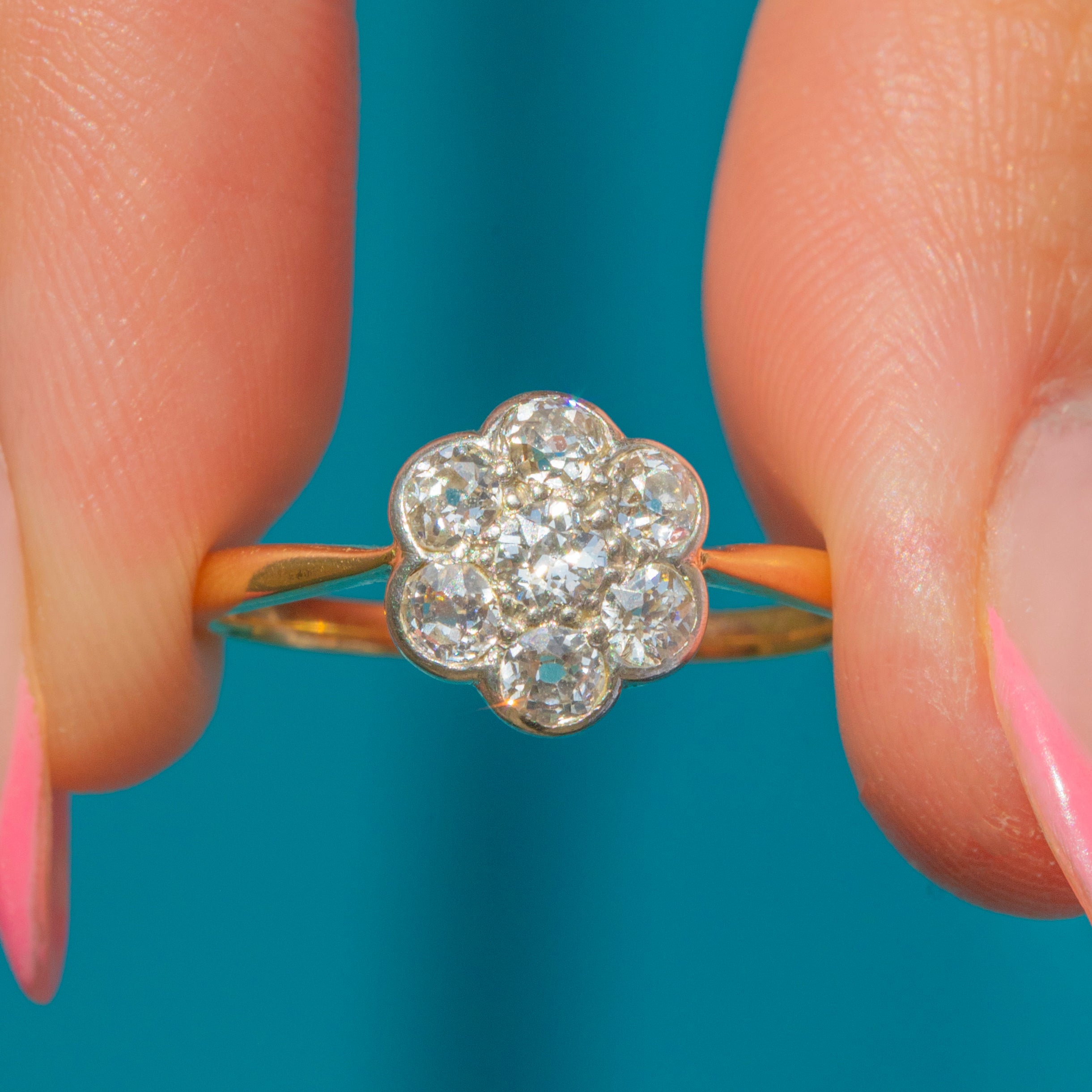 EXCELLENT: This antique 18ct Gold Diamond daisy ring is in wonderful condition. Each of her Diamonds is radiant and set securely within its Platinum setting. With a secure band and little else to note, this Edwardian Diamond ring is ready to be worn and enjoyed!