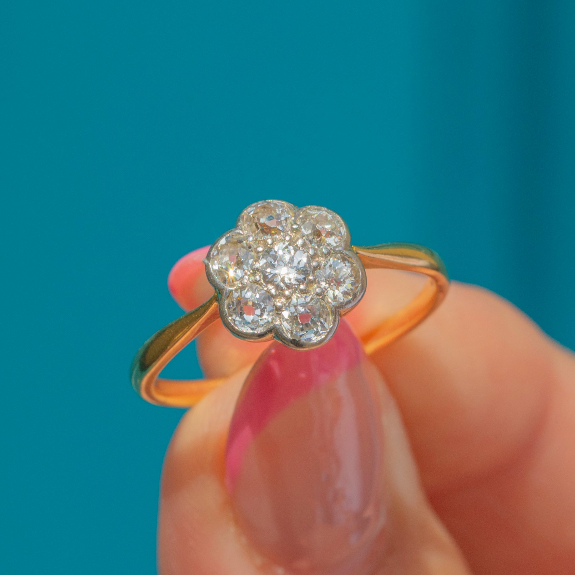 The bright Diamond cluster is displayed on a buttery 18ct Gold band and combined with its low profile, this Edwardian ring is perfect for everyday wear; she'd make a gorgeous choice for an engagement ring!