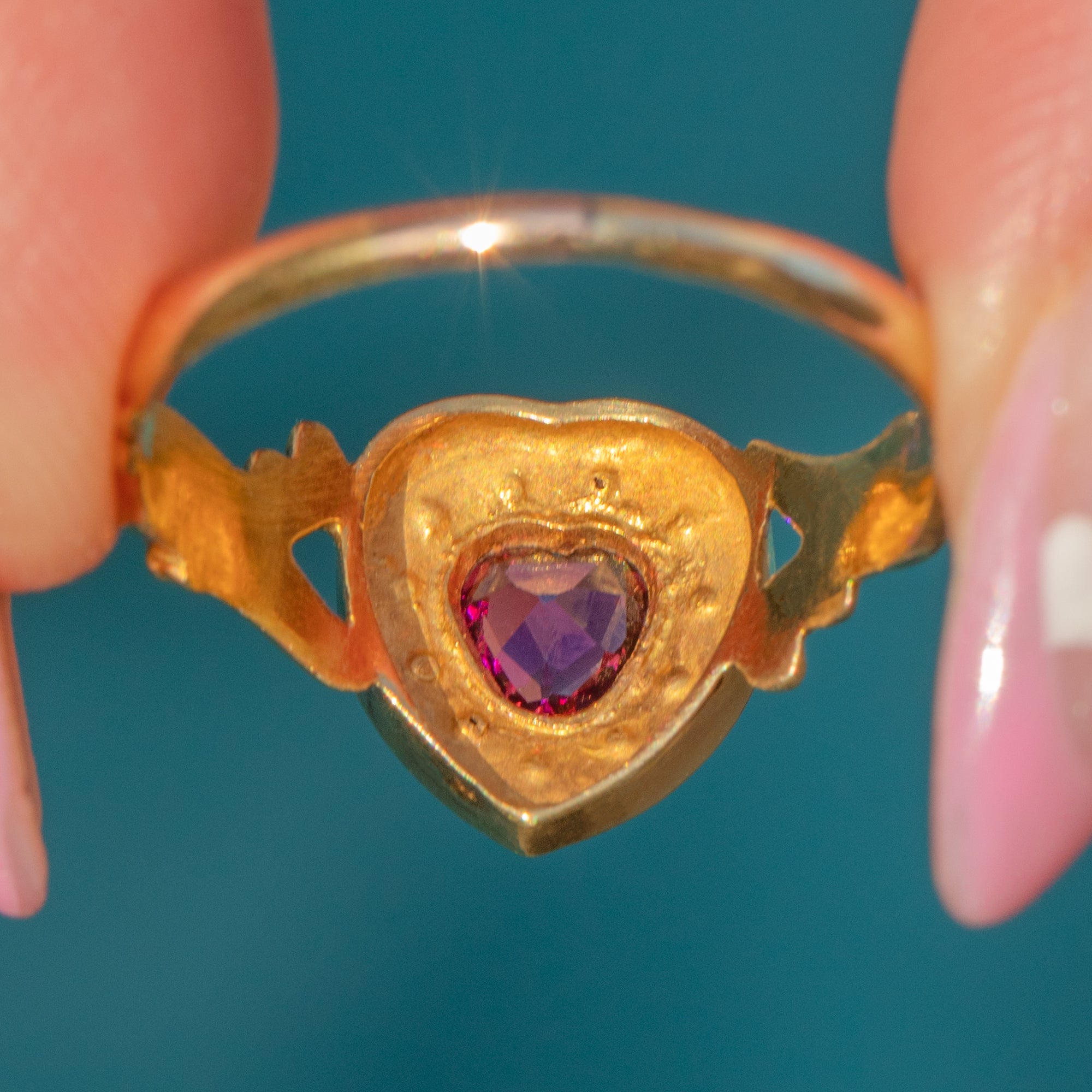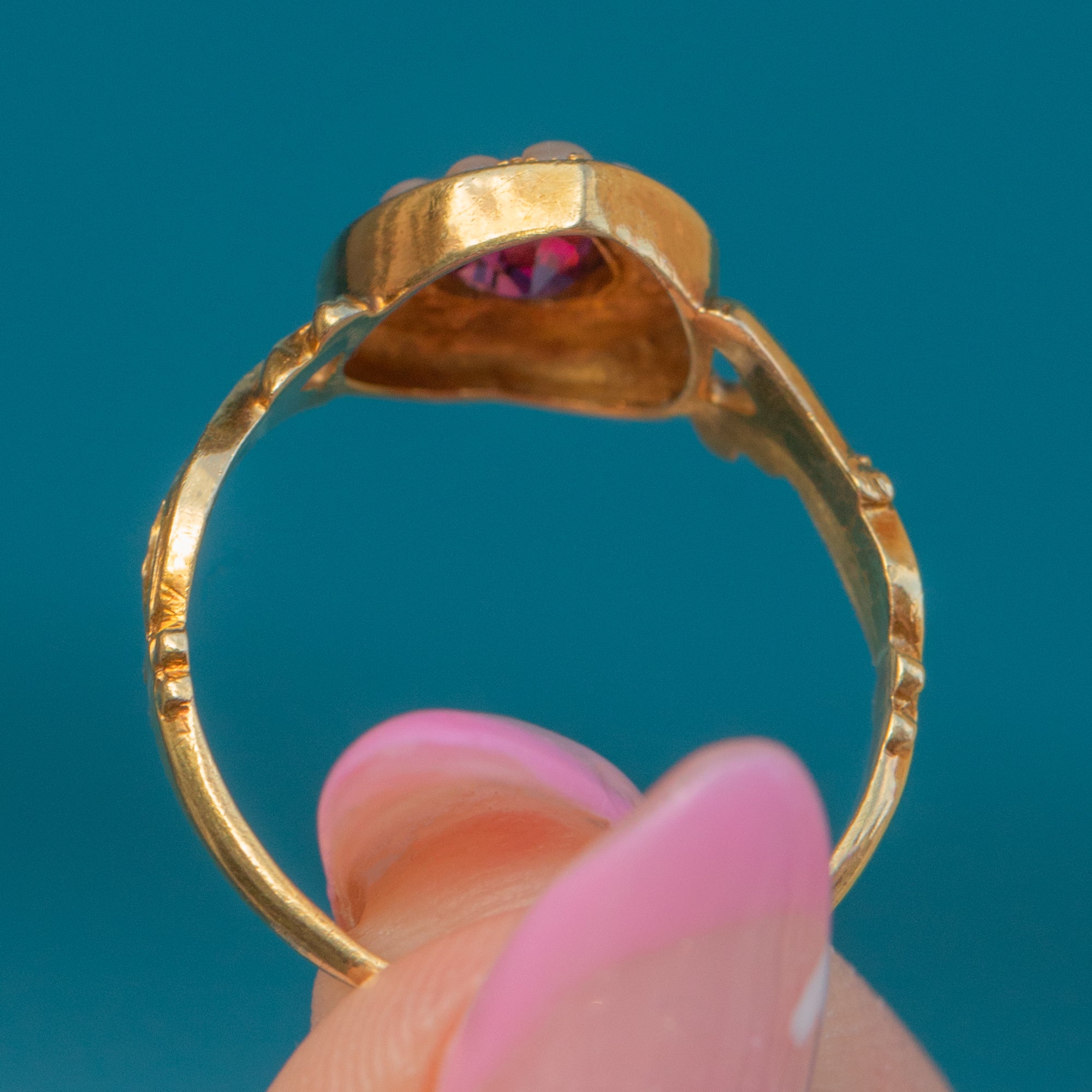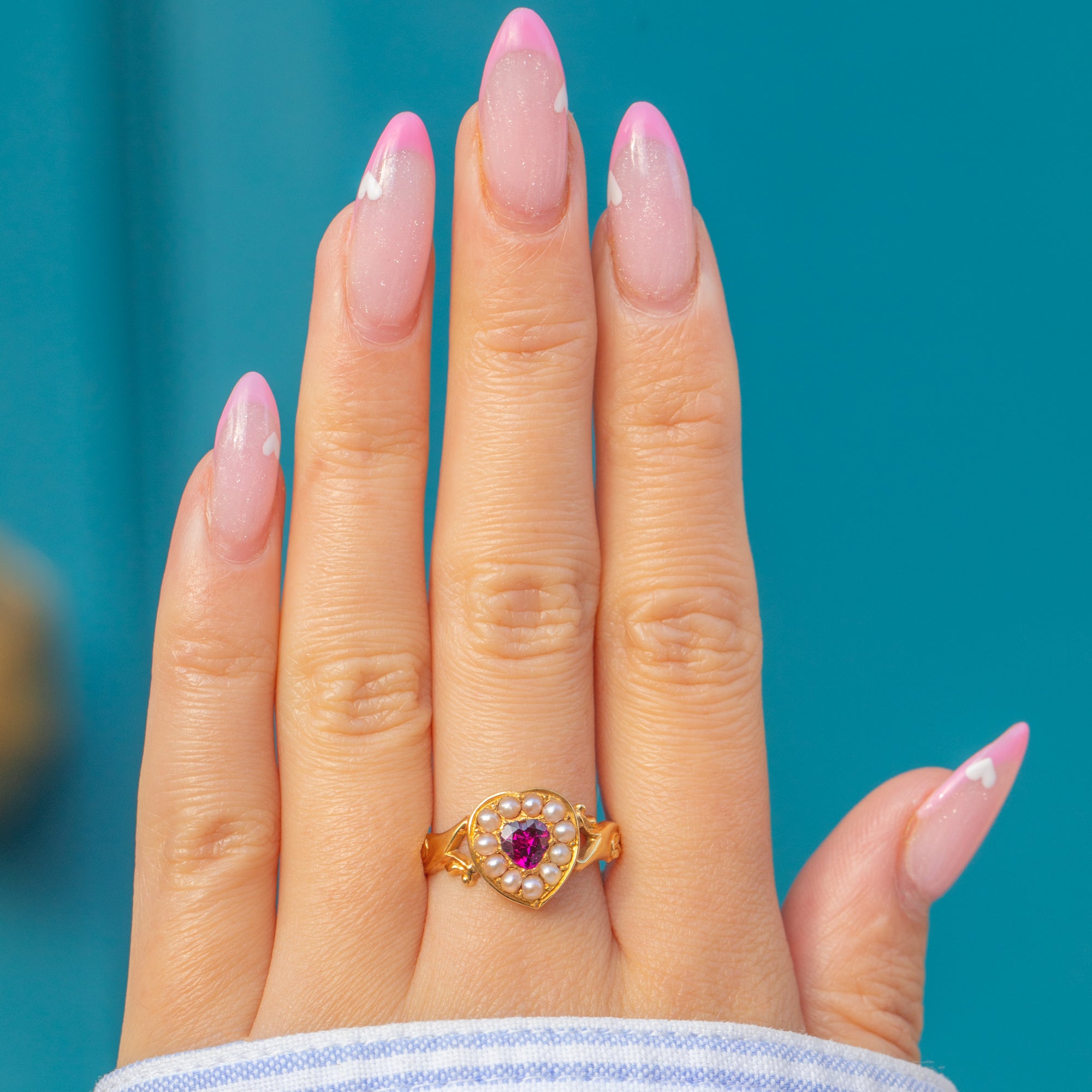 Edwardian 18ct Gold Garnet & Pearl Heart Ring