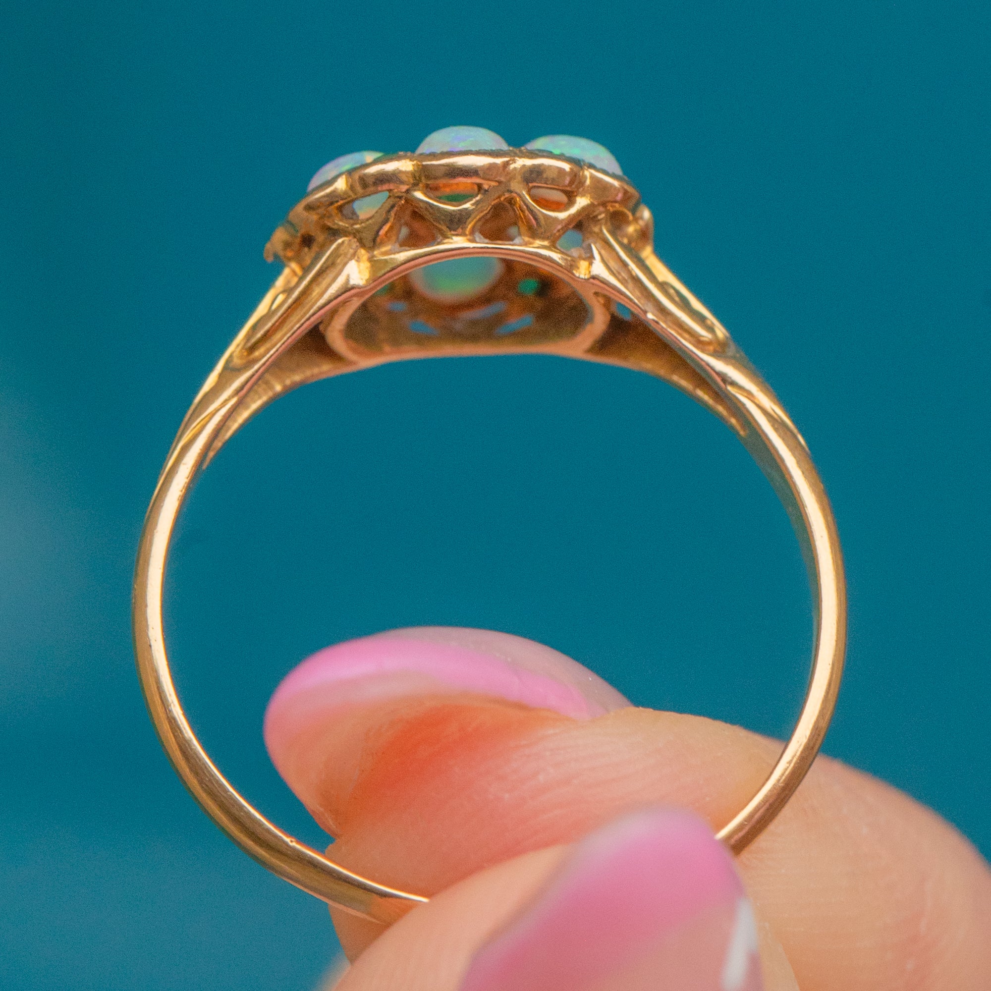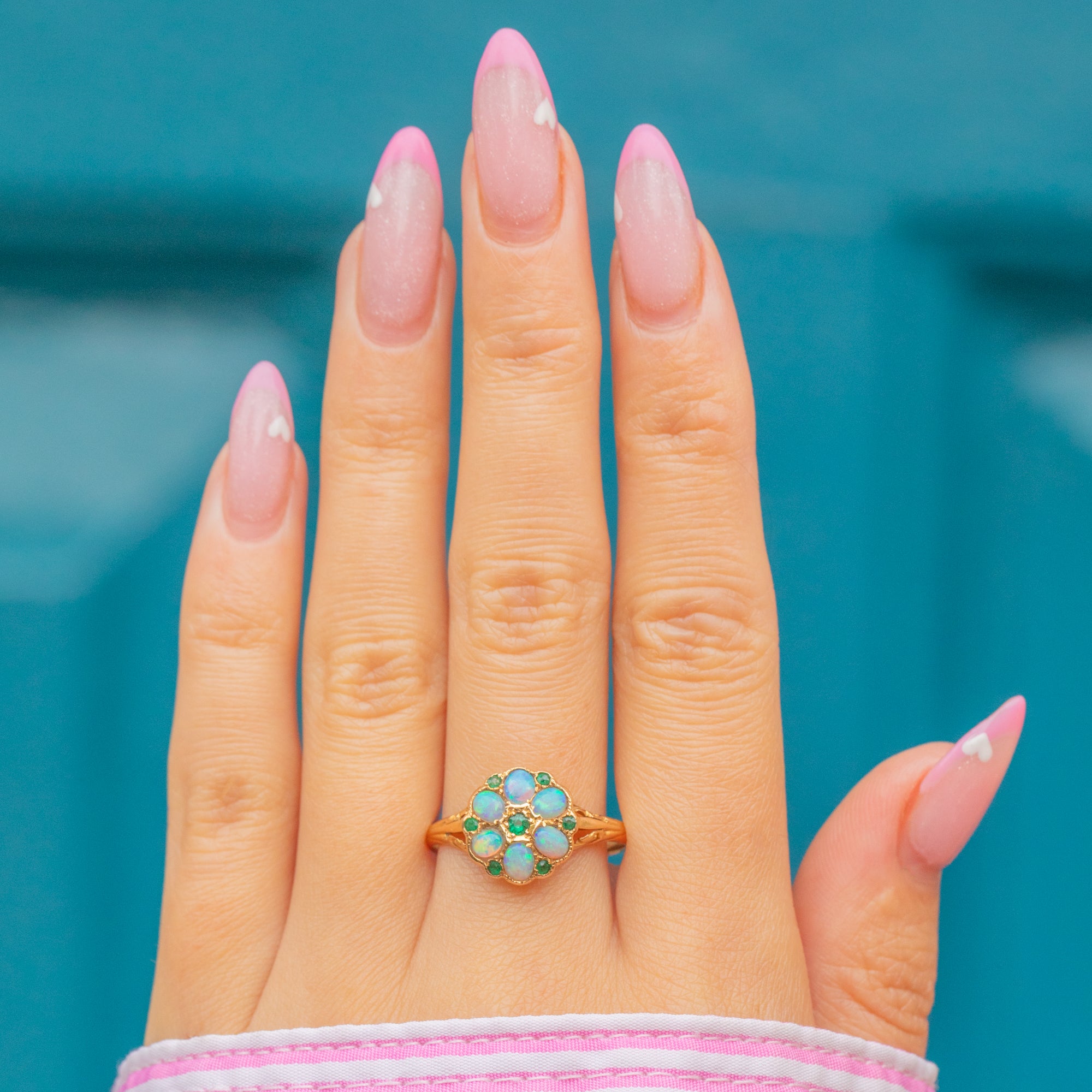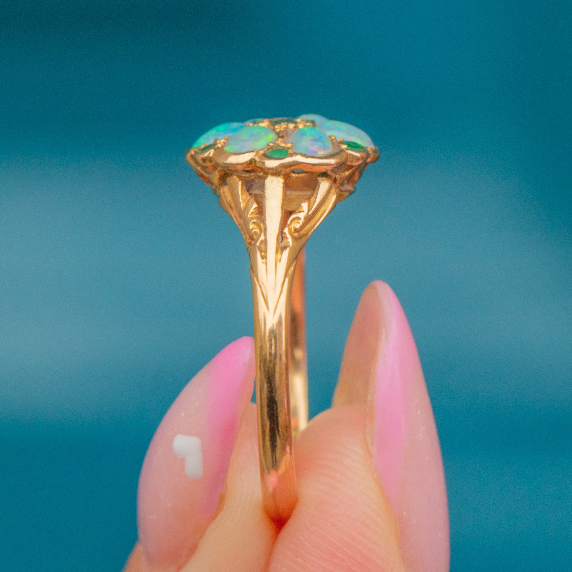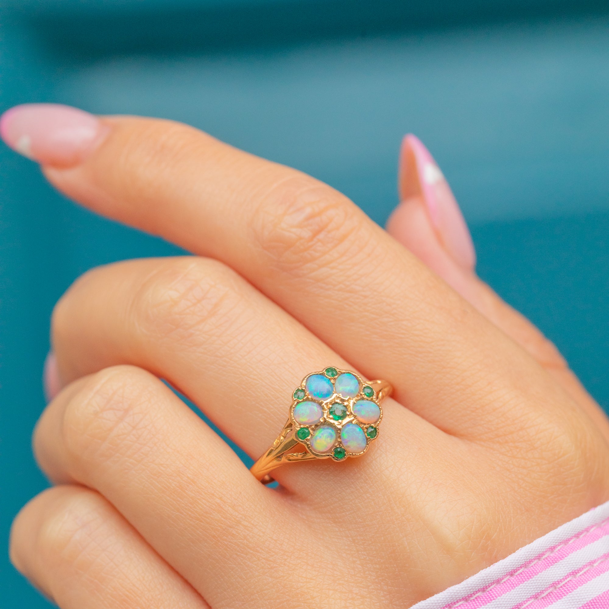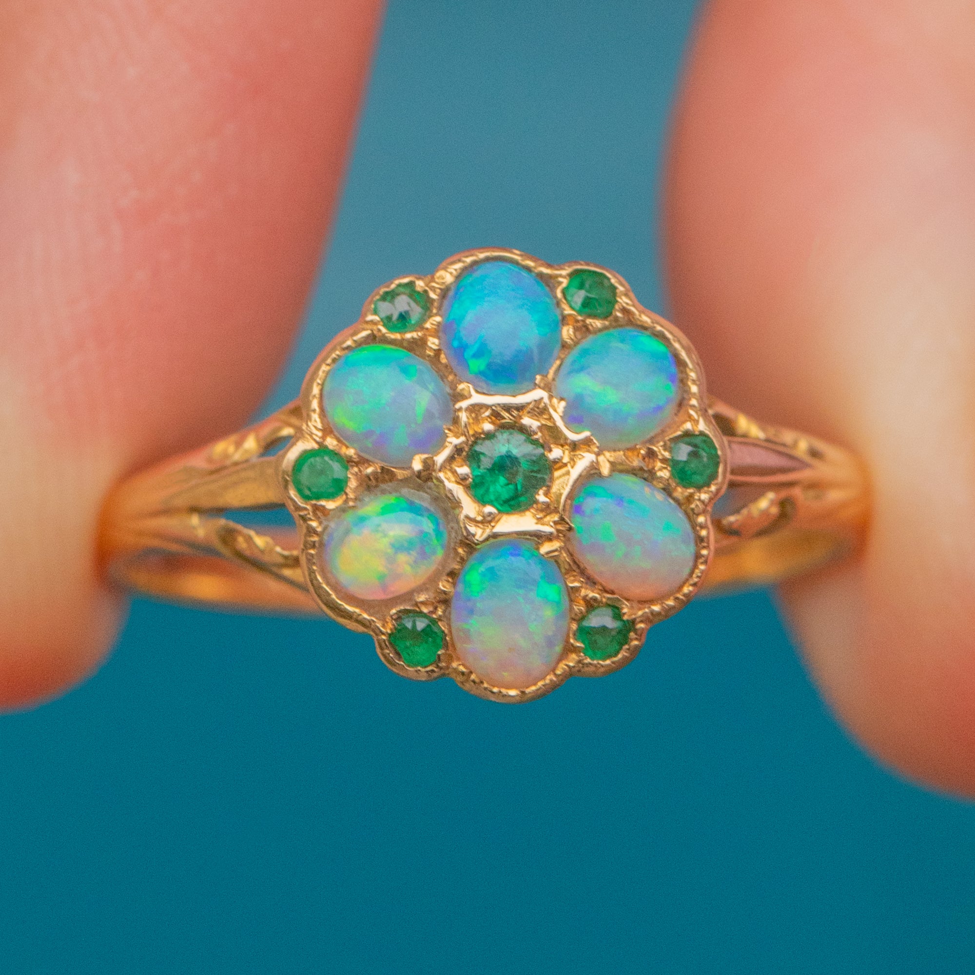 This exquisite Edwardian ring is a celebration of colour and craftsmanship. The floral cluster design is formed from glowing Opals with vibrant flashes of green, blue, and orange, accented by bright Emeralds that bring a lush contrast to the play of colour.