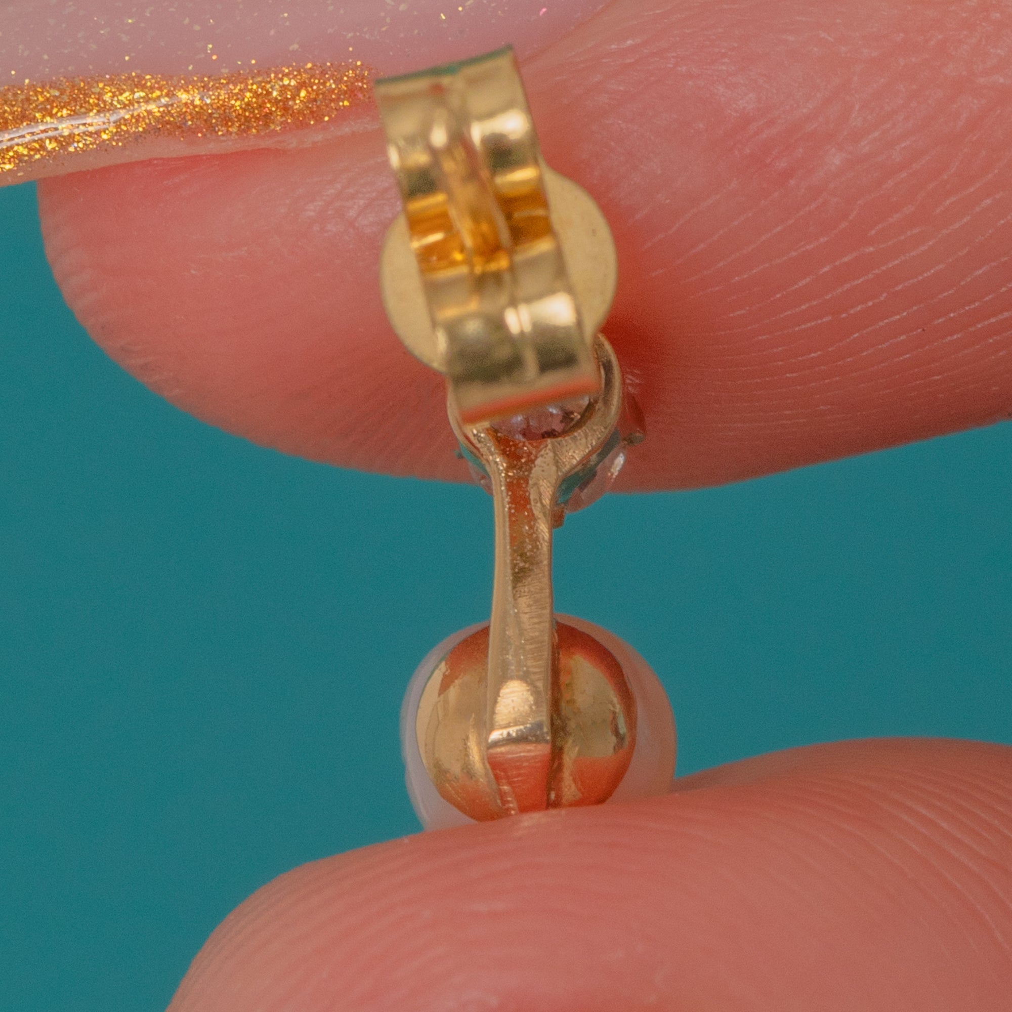 EXCELLENT: The Pearls are lustrous and free from blemishes, and the Diamonds are bright and well-matched, securely set in their mounts. The Gold is smooth and well-polished, with minimal signs of wear.