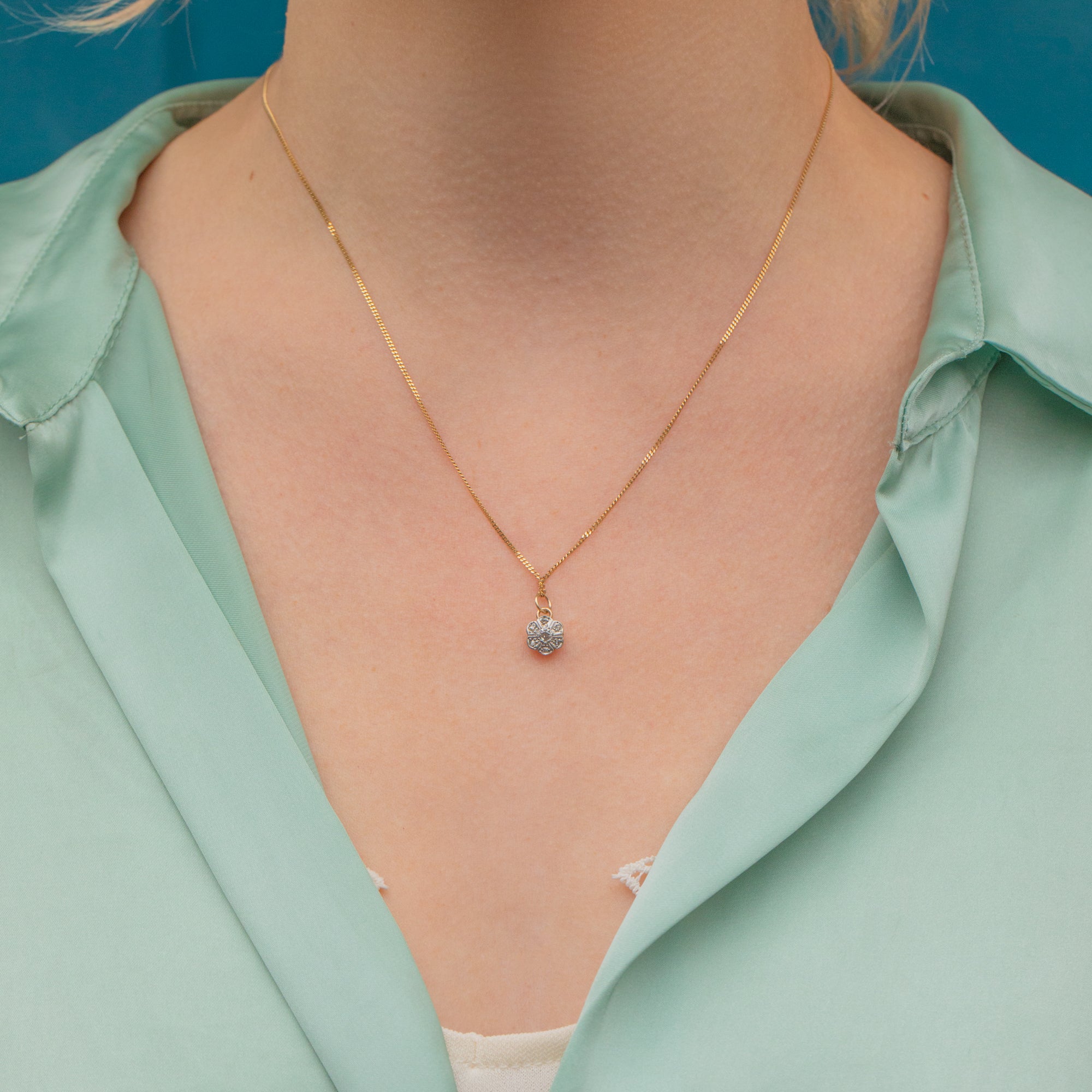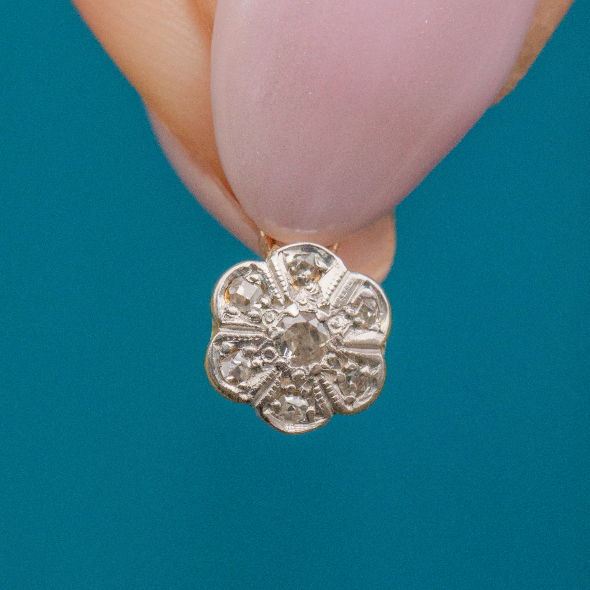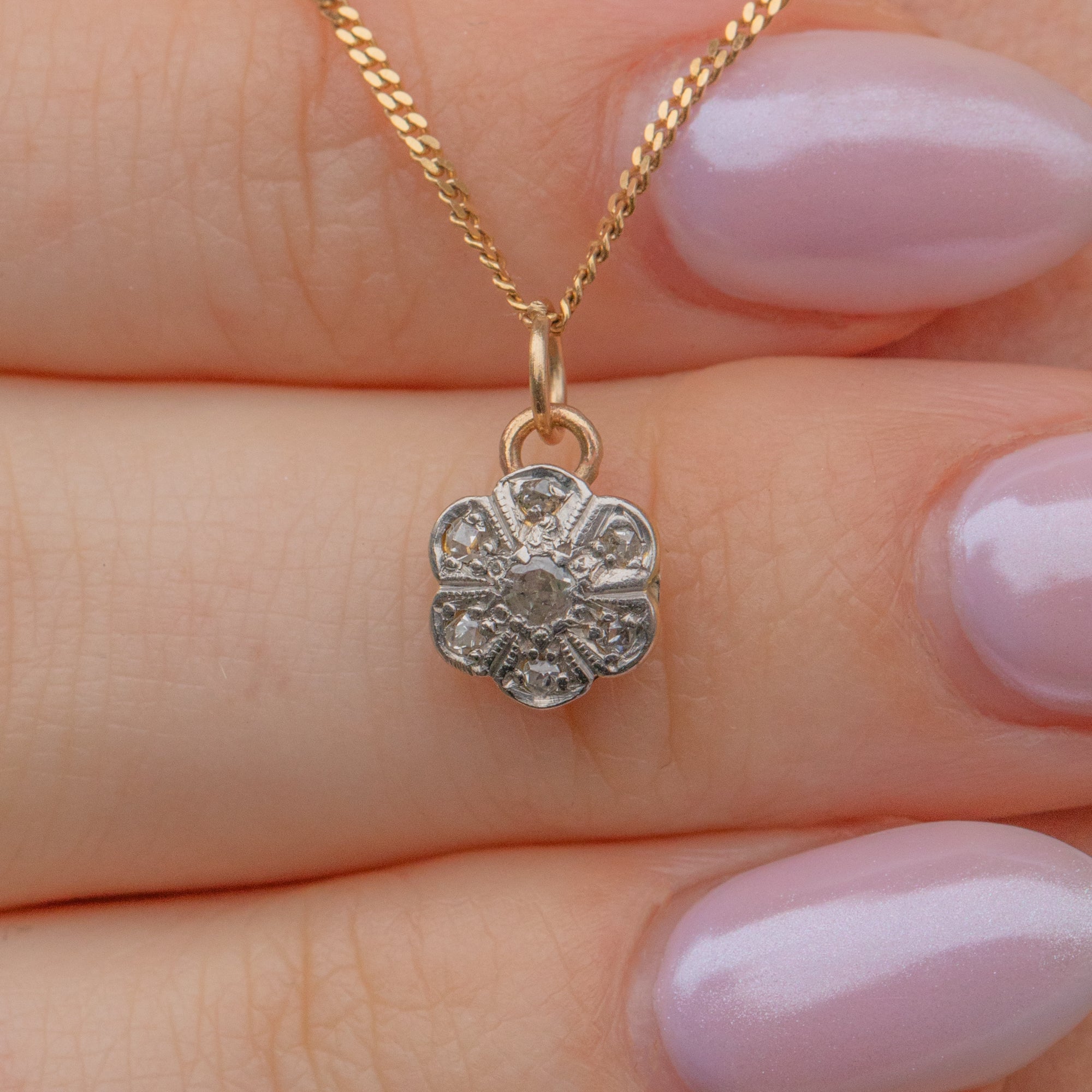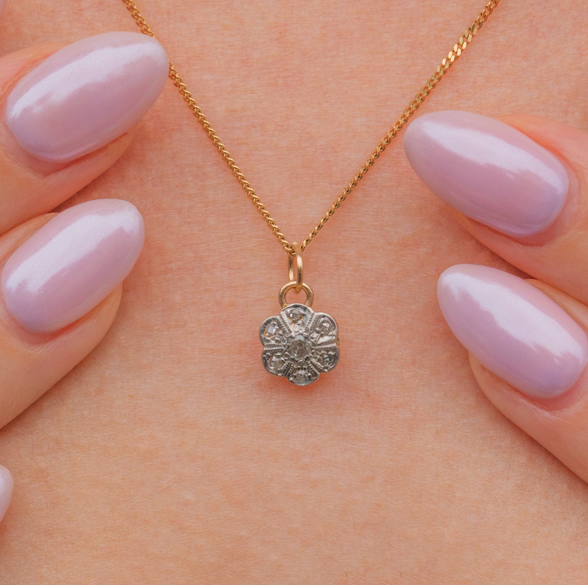 VERY GOOD-EXCELLENT. This Edwardian 18ct Gold and Platinum Diamond flower charm is in superb condition. Her Diamonds sit delicately and securely within her yellow Platinum settings and are free from wear. There is a very small pinprick hole in the top of her setting, however, this goes unnoticed while the pendant is worn. This Edwardian Diamond flower charm is a real treat!