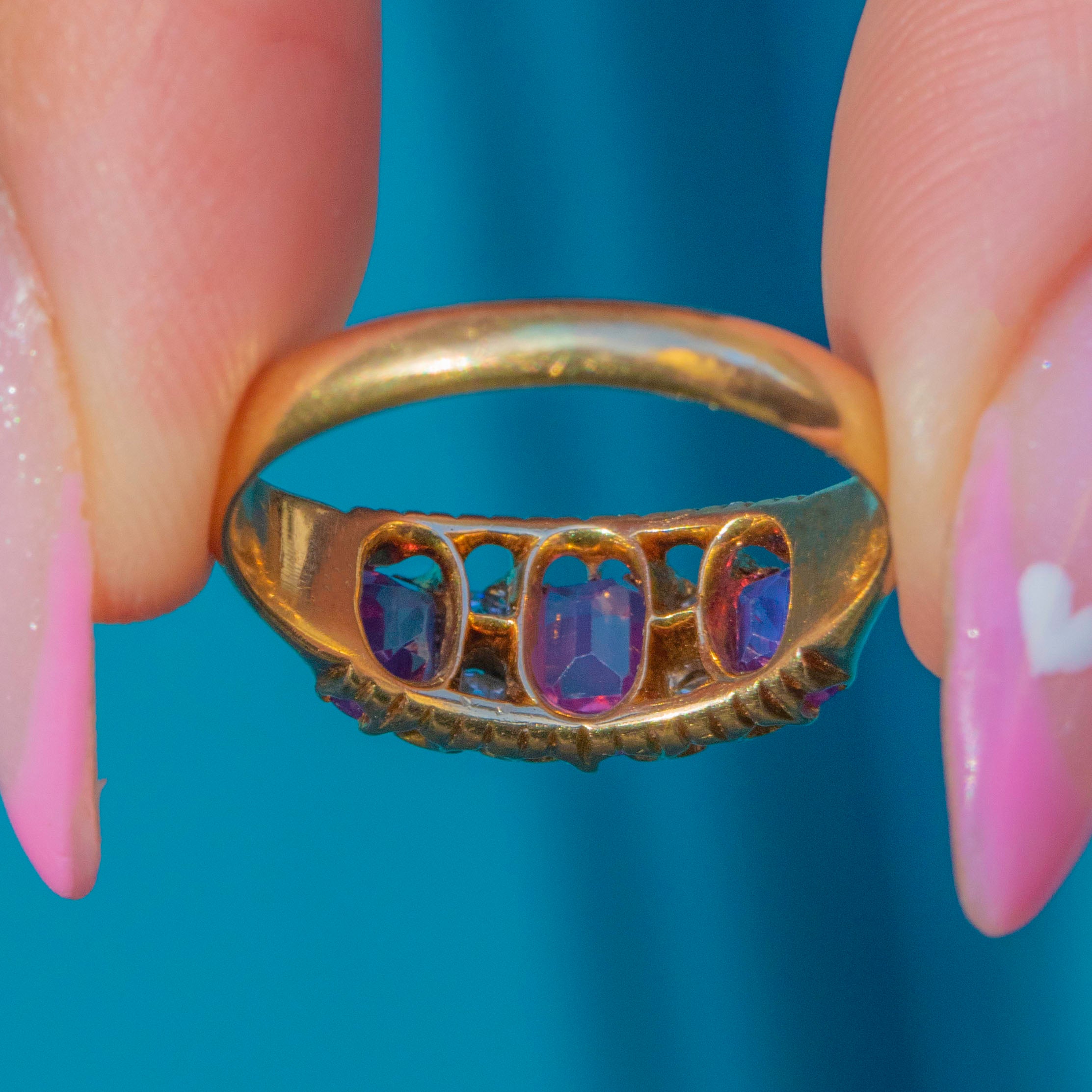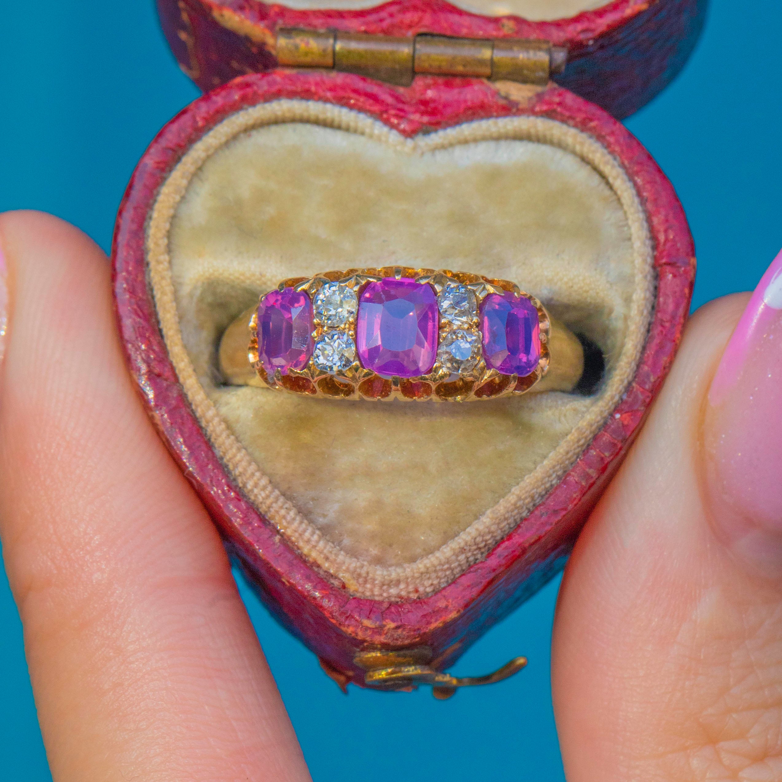 A stunning Edwardian seven-stone ring crafted in 18ct Gold, set with a beautiful row of vibrant fuchsia Rubies adding up to 1.45ct interspersed with twinkling old-cut Diamonds. The combination of vivid colour and sparkle makes this piece both eye-catching and timeless.