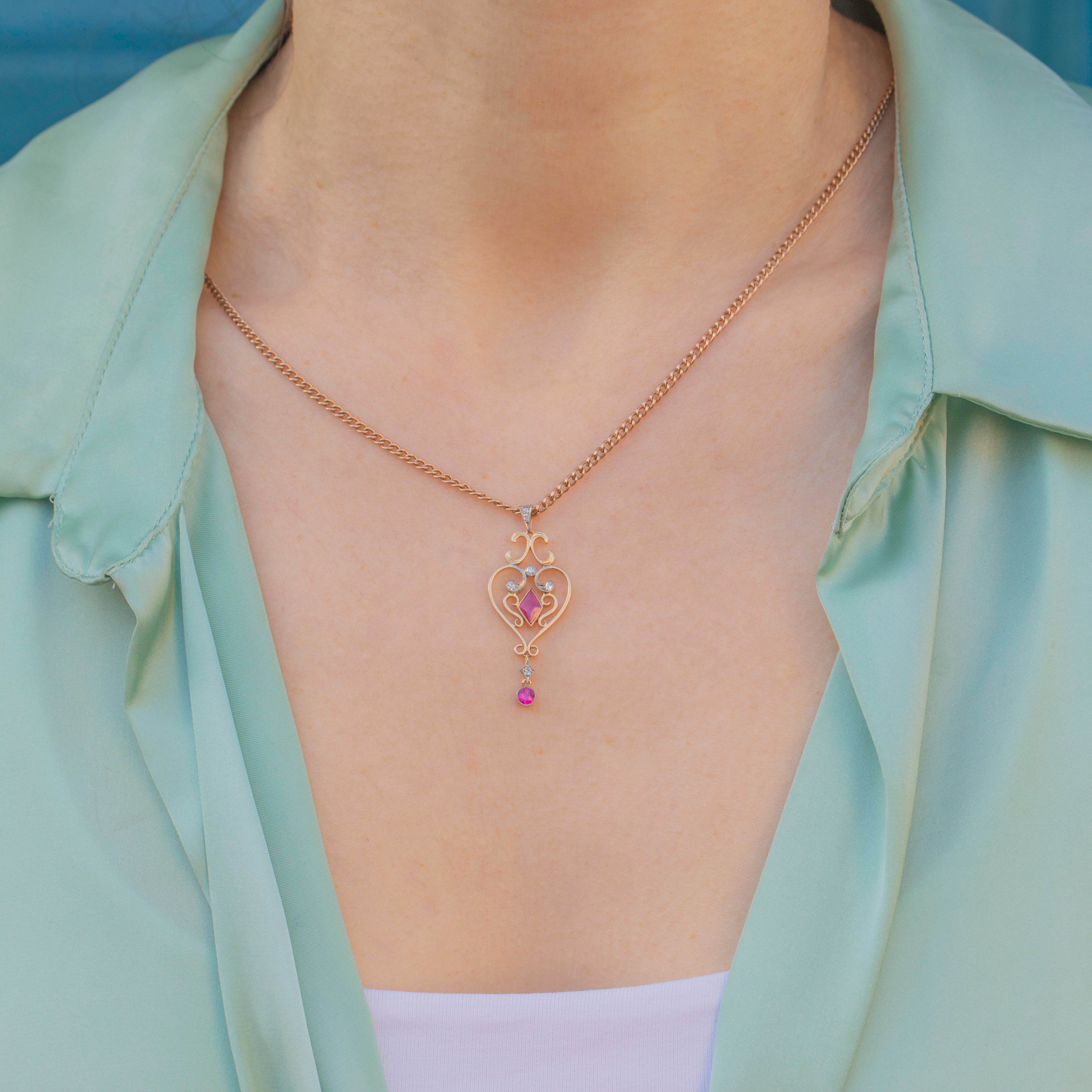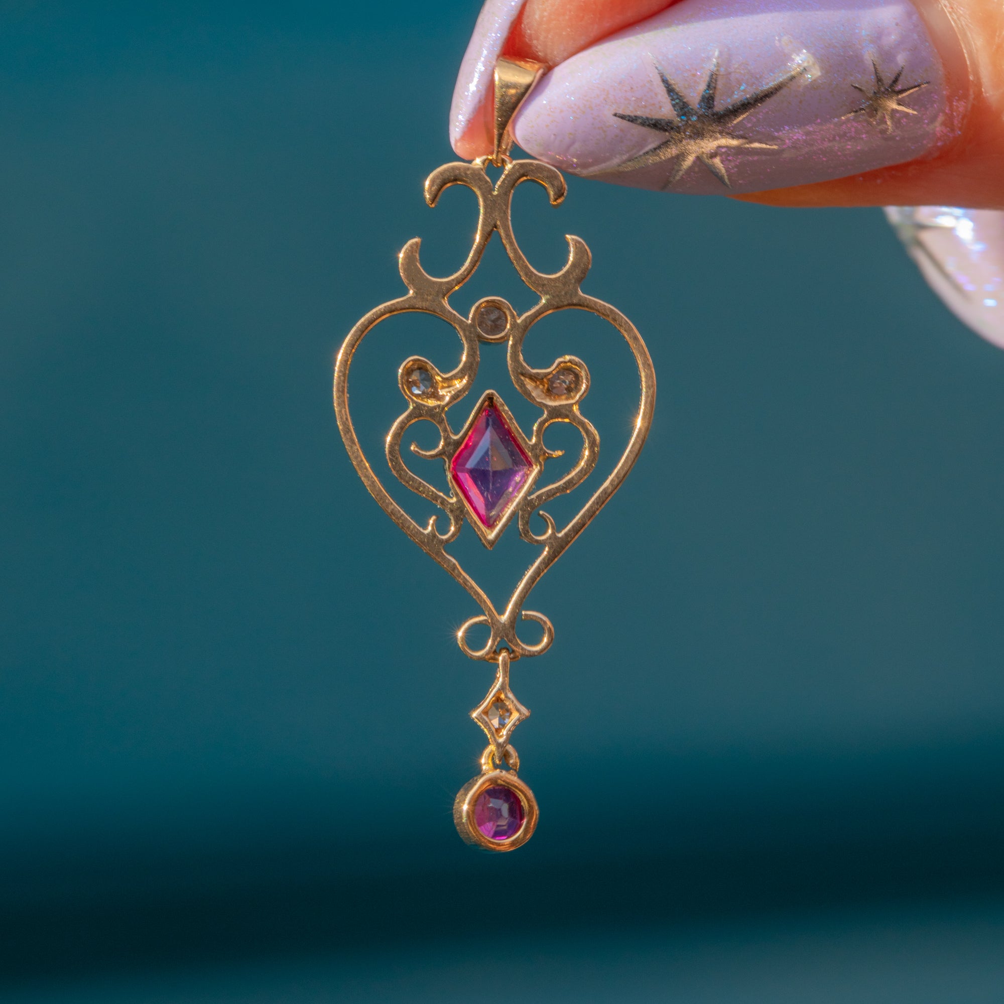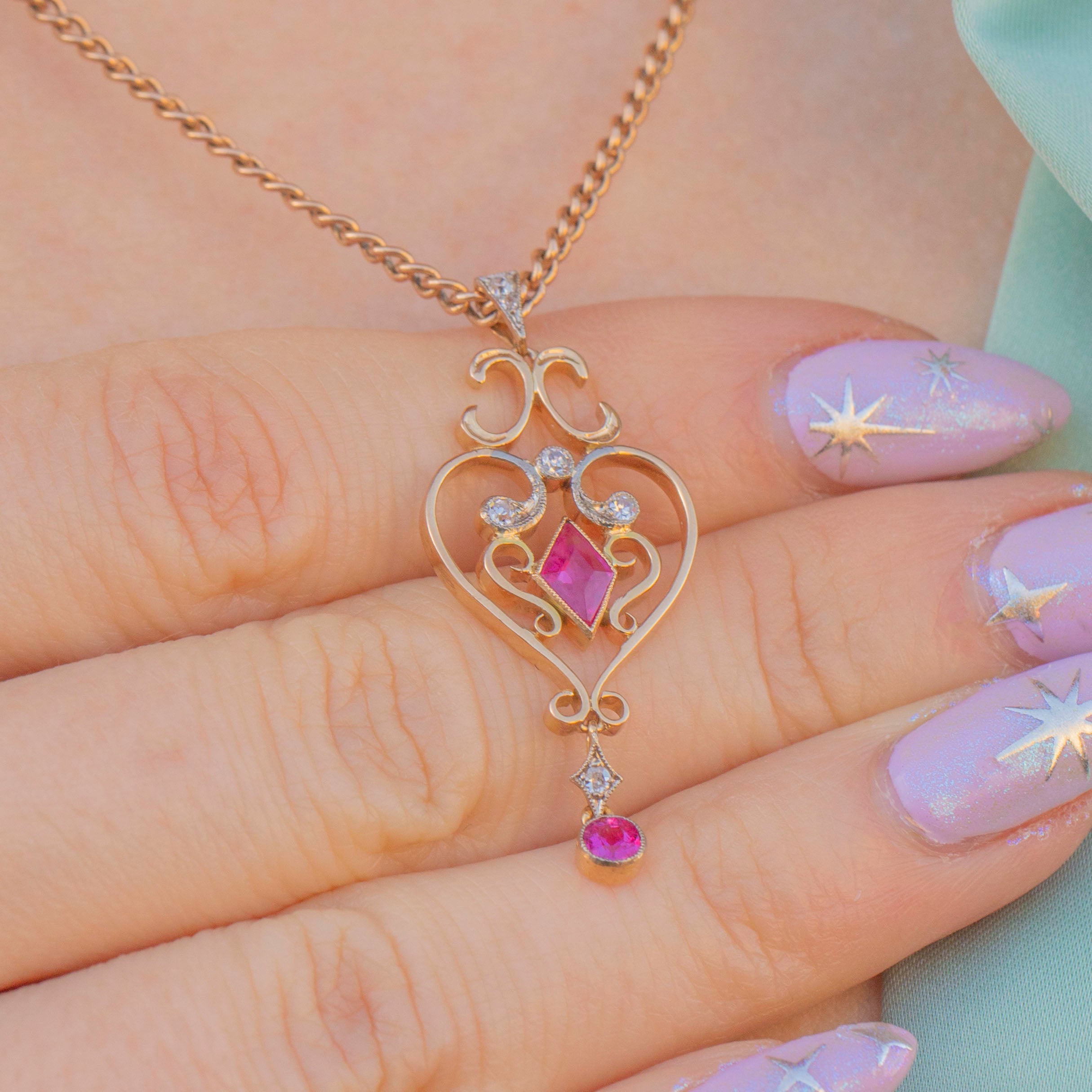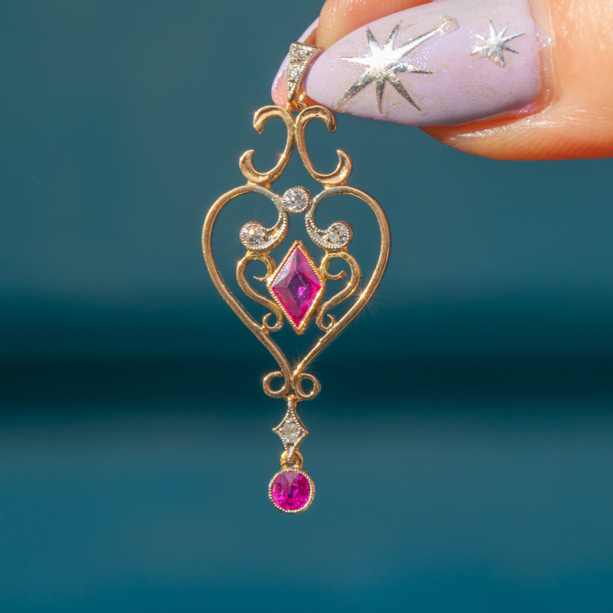 Bask in the sheet beauty of this Edwardian 18ct Gold Ruby Diamond drop pendant! The ornately formed 18ct Gold has a richly saturated hue, curving around the gemstones in a decorative heart shape.