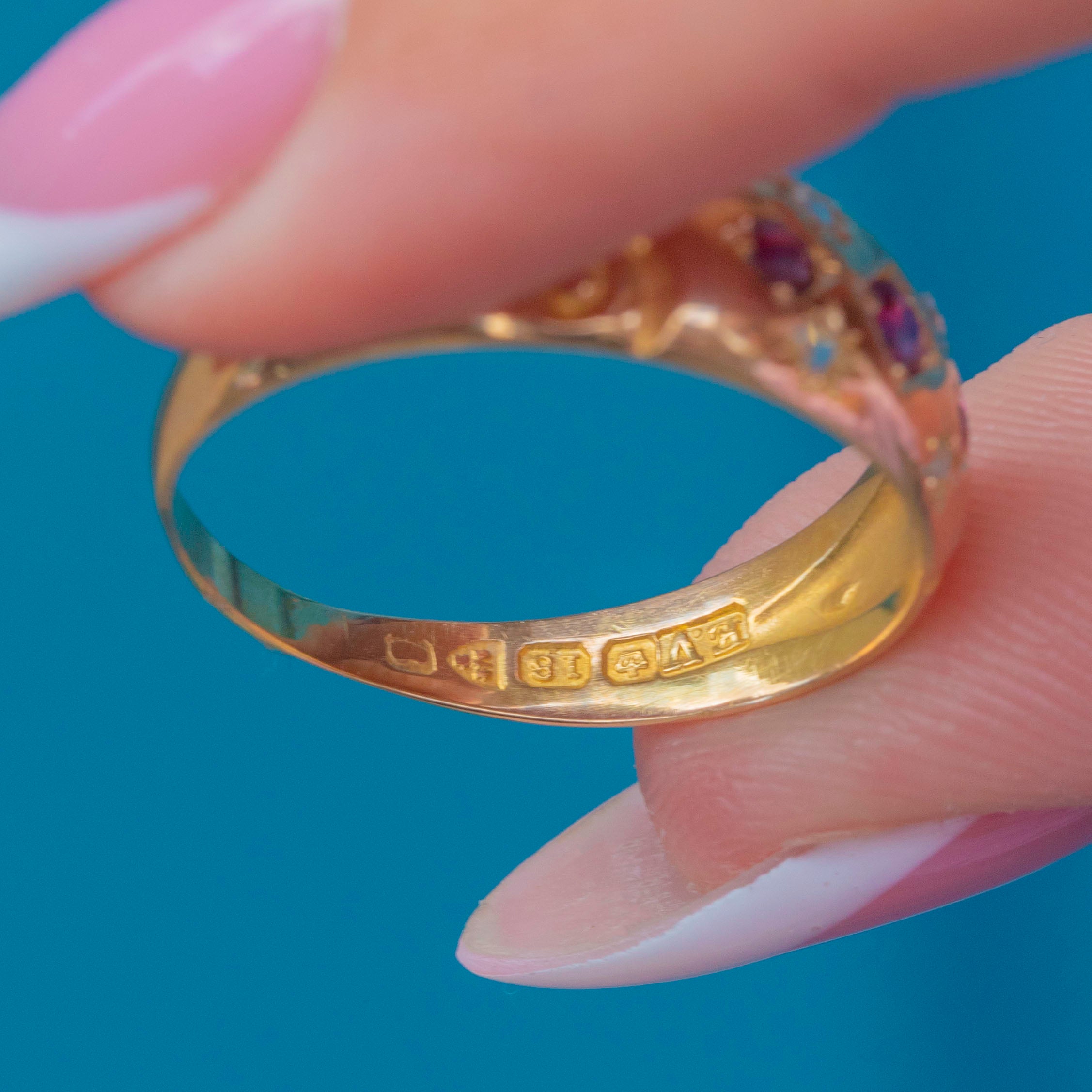 She will satisfy your penchant for celestial jewels, boasting three star-set gemstones in her centre. With Rubies akin to juicy raspberries flanked by twinkling rose-cut Diamonds, this ring is a timeless Edwardian piece that you will treasure forever.