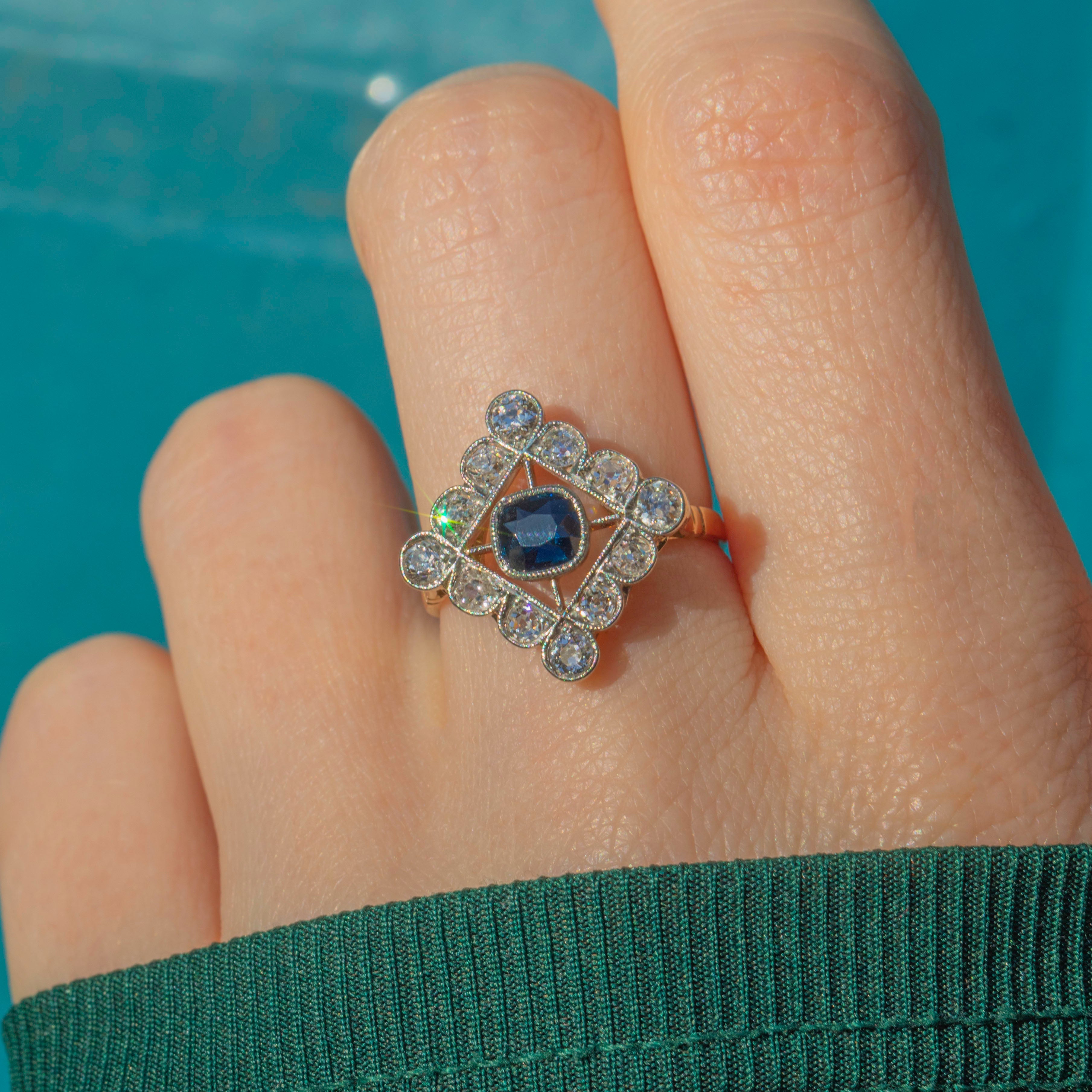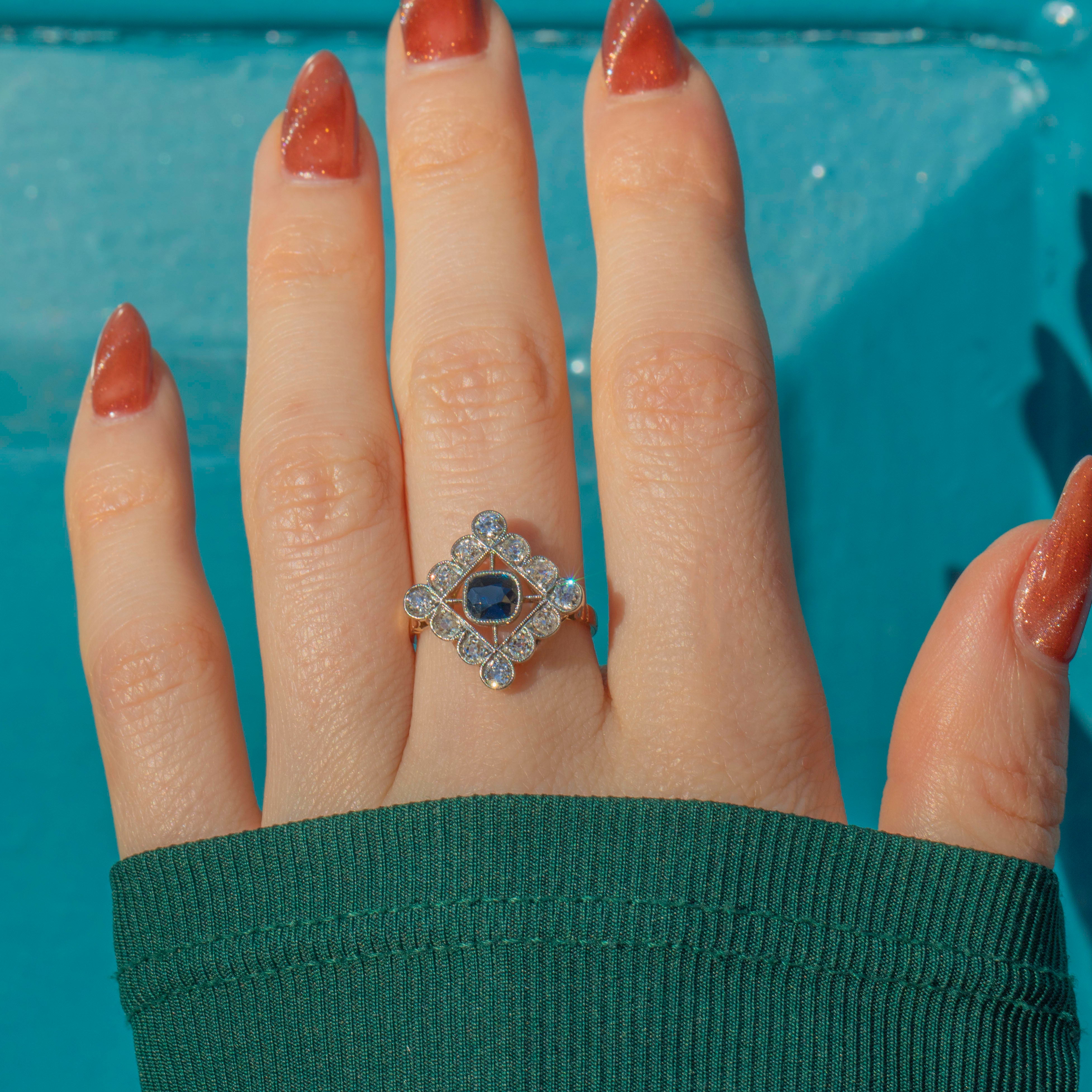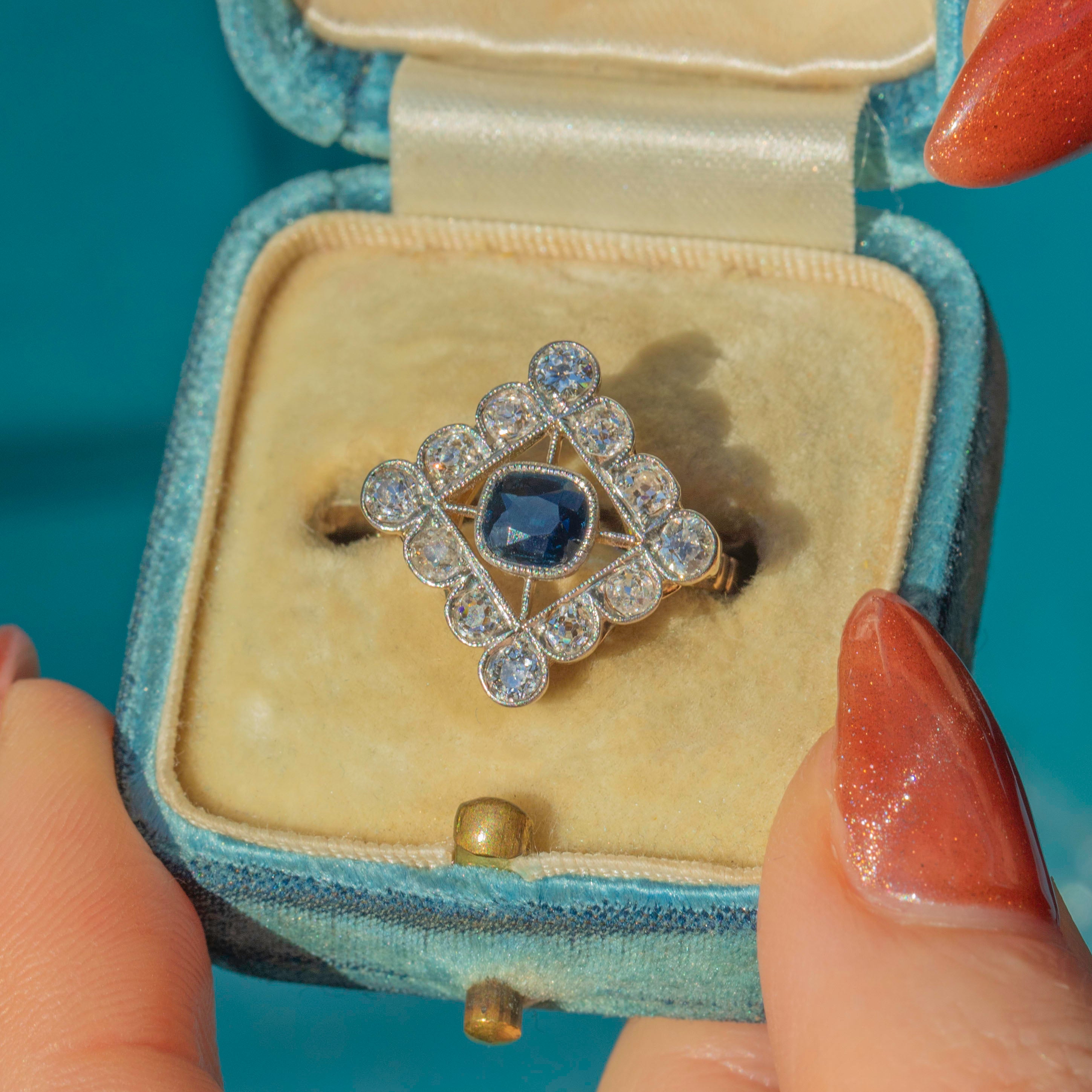 We have all fallen hard for this incredible Edwardian 18ct Gold Sapphire Diamond square cluster ring here at Lillicoco!
