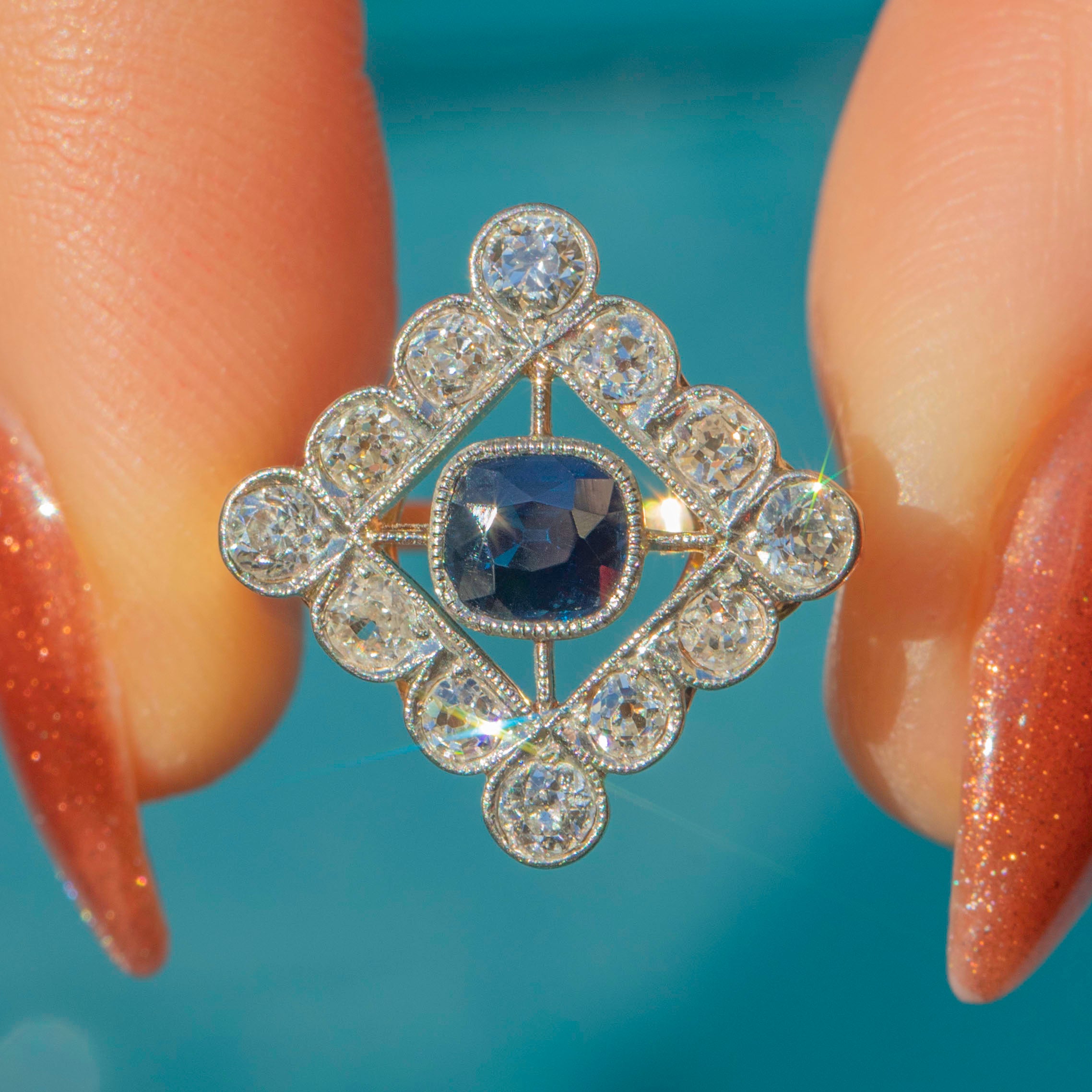 VERY GOOD-EXCELLENT. This Edwardian 18ct Gold Sapphire Diamond square cluster ring is in fabulous condition. The 18ct Gold is beautifully saturated and bright, with a robust shank and beautifully decorated gallery. The White Gold settings are bright and hold the gemstones securely in place. There is a subtle resize on the back of the shank, but this does not impact the integrity of the ring and is only noticeable under close inspection. The gemstones are free from chips, with only very minor abrasions on a couple of the Sapphire's facets, commensurate with age. With so much beauty to absorb, don't hesitate to make this antique Sapphire Diamond ring your newest obsession!