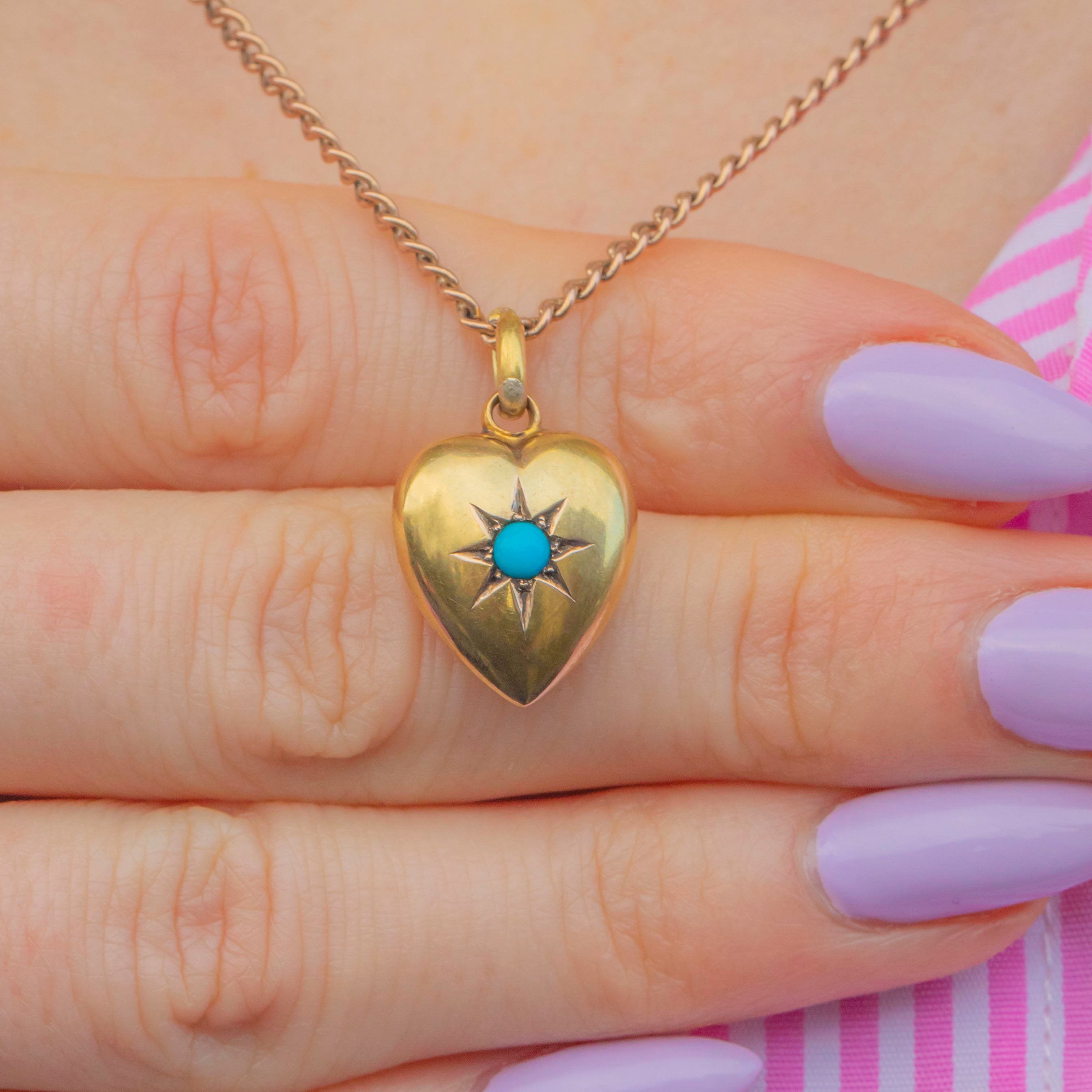 VERY GOOD. This Edwardian 15ct Gold Turquoise puffy heart pendant is in very good condition. The Turquoise cabochon is vibrant with no signs of wear and is secure within its star setting. The Gold is luminous and smooth on the front, with some small dings on the back, commensurate with age, which cannot be seen when the pendant is worn. The chunky jump ring is soldered shut allowing you to affix it to a chain of your choice with confidence!