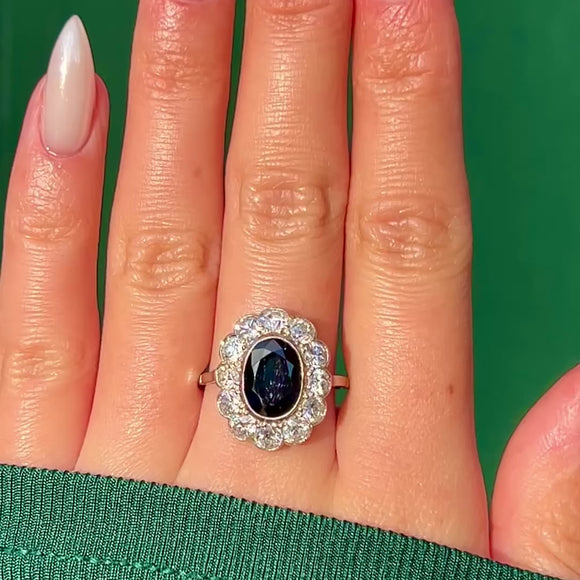 Edwardian 18ct White Gold 2.30ct Natural Sapphire & Diamond Cluster Ring