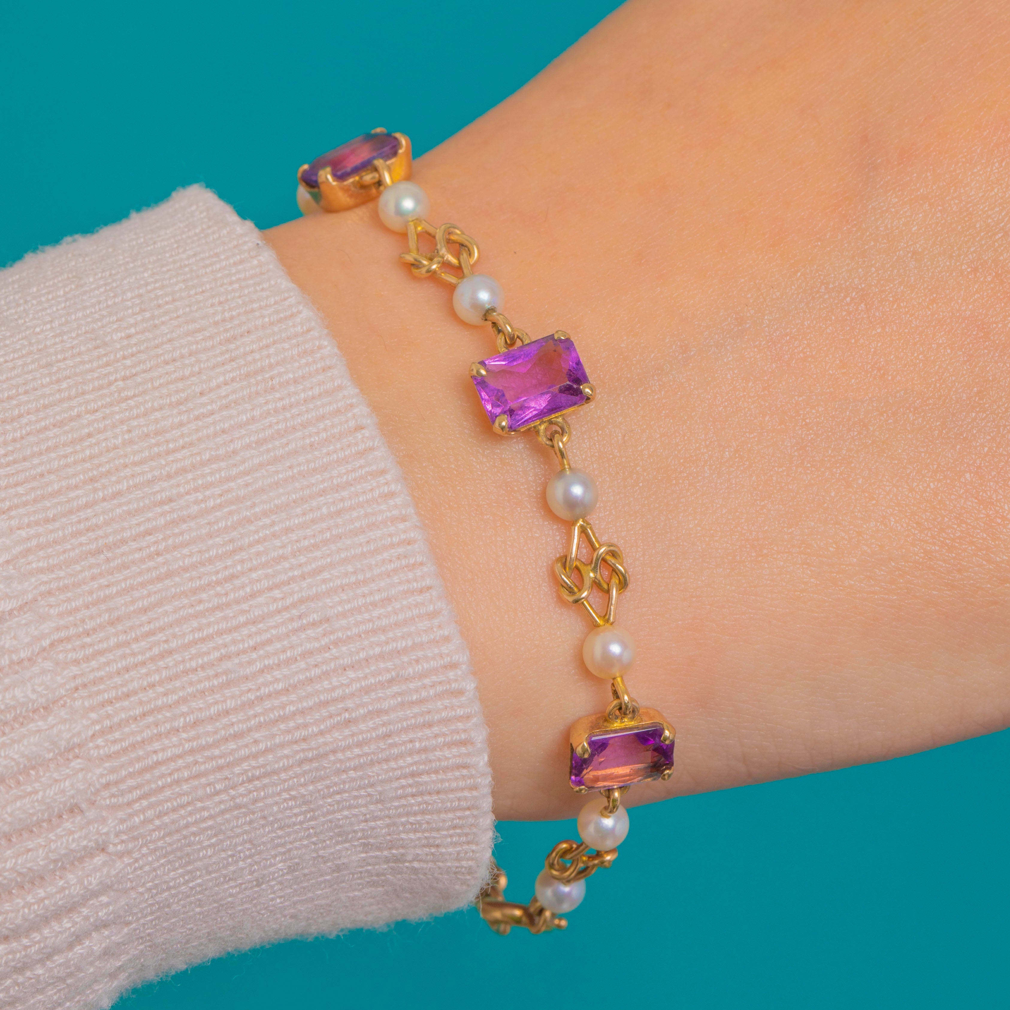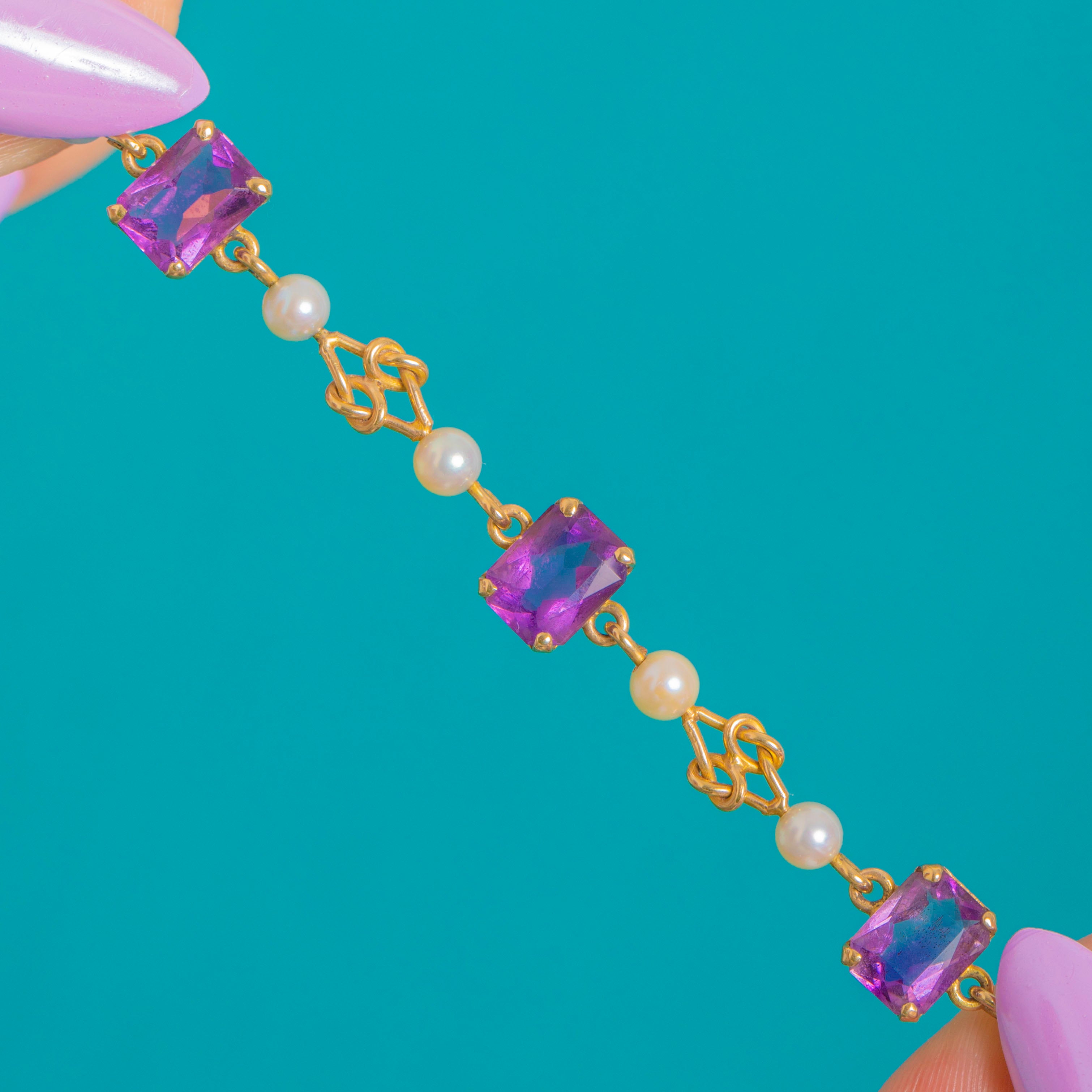 Edwardian 9ct Gold Amethyst Pearl Station Bracelet