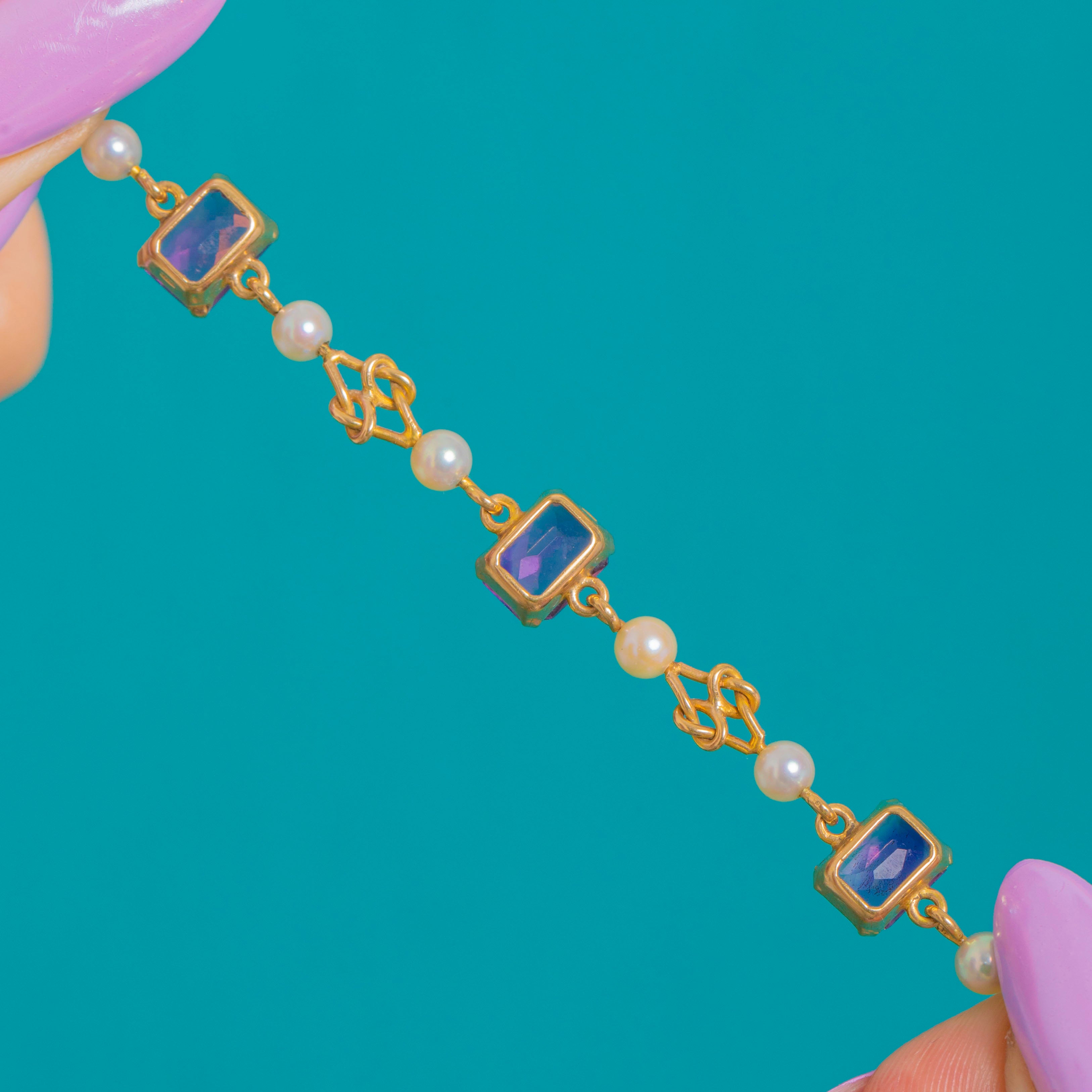 A lyrical Edwardian bracelet that captures the era’s love of elegant rhythm and refined colour. Five vivid rectangular Amethysts totalling 6.50cts, are set in warm 9ct Gold and spaced with creamy Pearls, creating a graceful sequence that moves beautifully on the wrist. The interplay of plush purple and soft lustre feels timeless, feminine and poised.