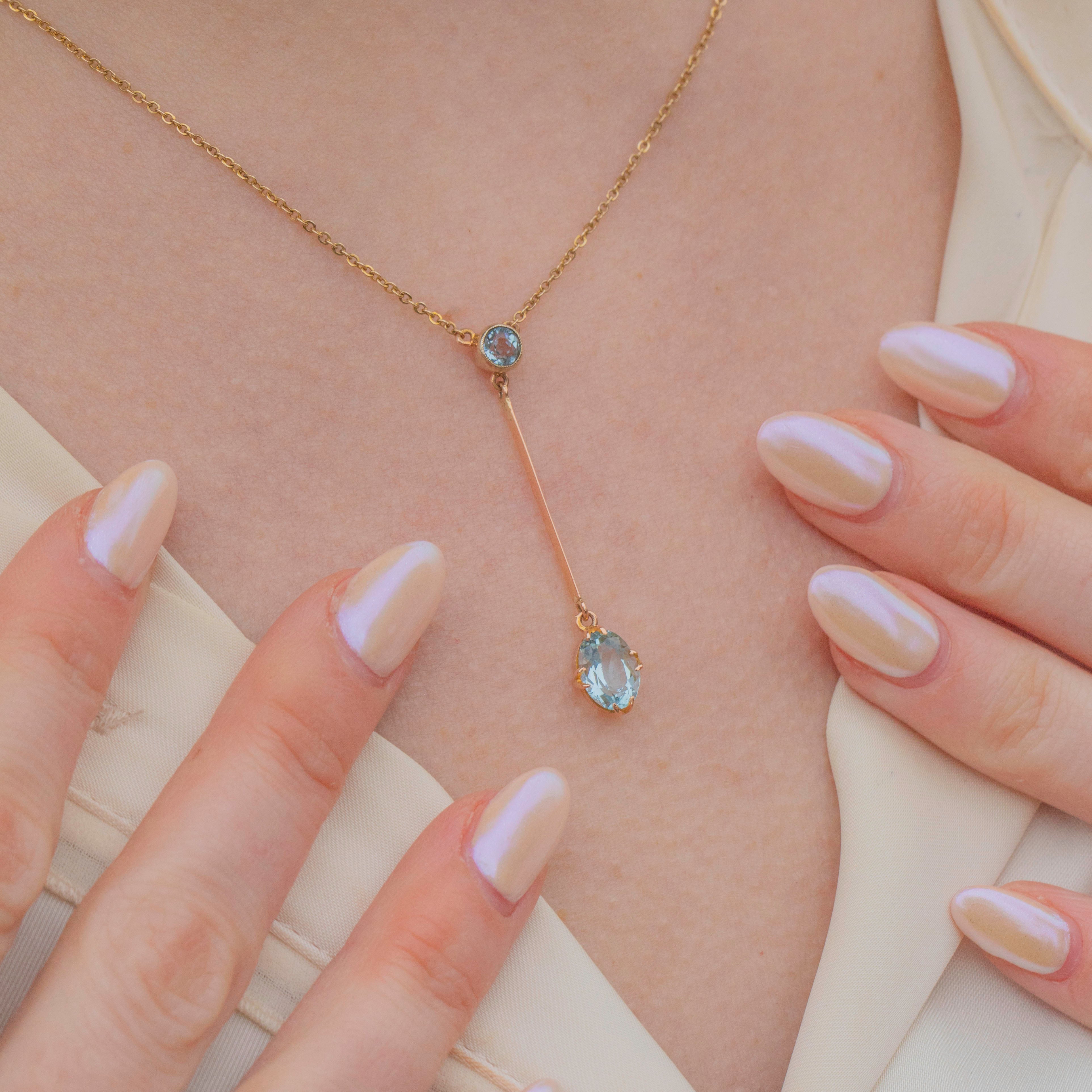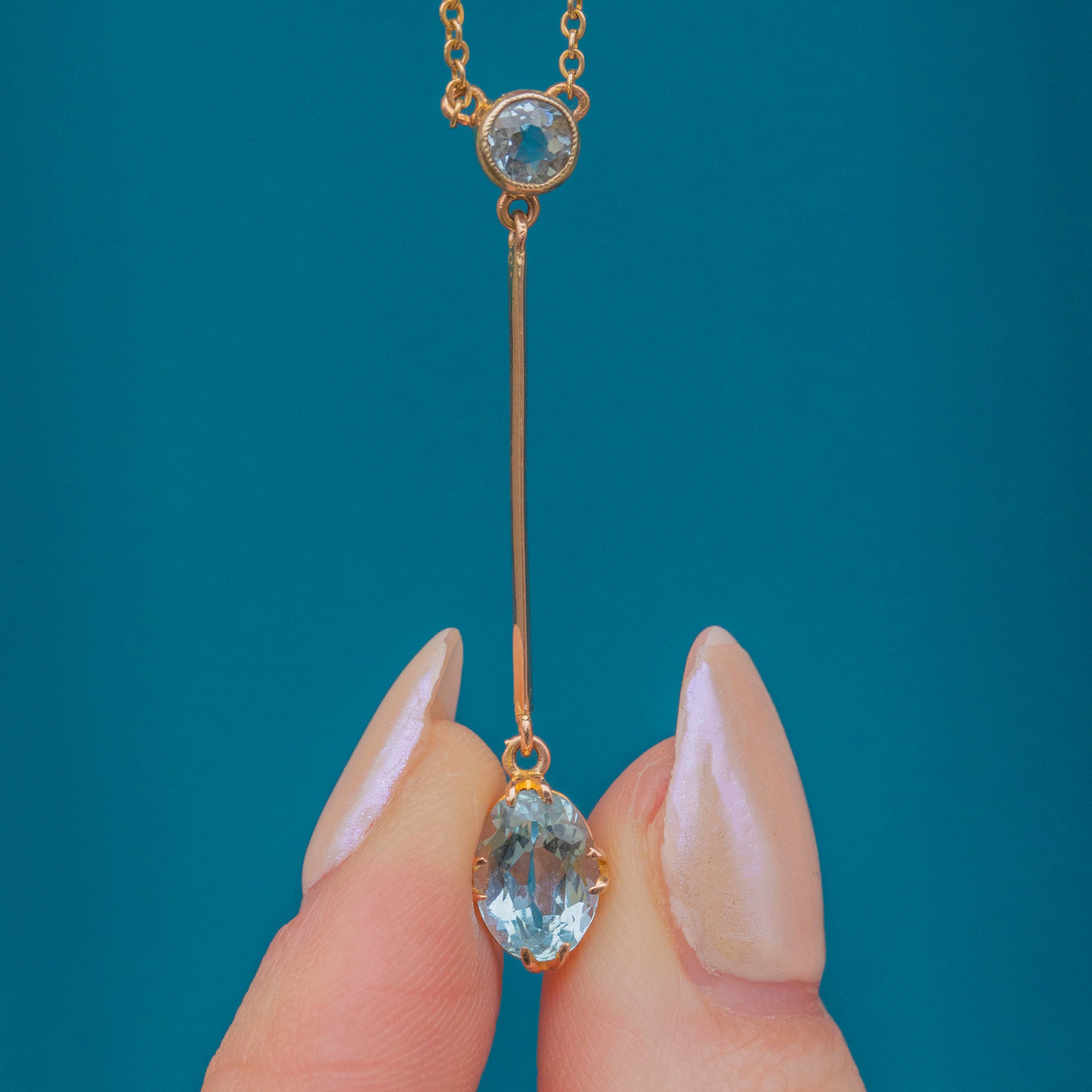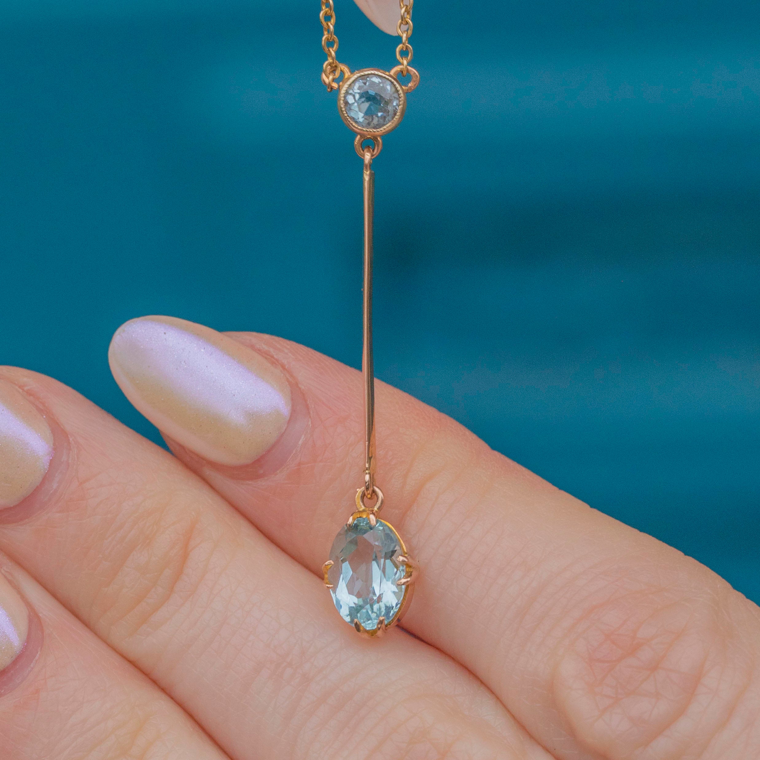 This Edwardian 9ct Gold Aquamarine drop necklace is a truly magnificent piece! Boasting two gorgeous Aquamarine gems with a combined carat weight of 1.10ct, she is the perfect balance of glamour and elegance.