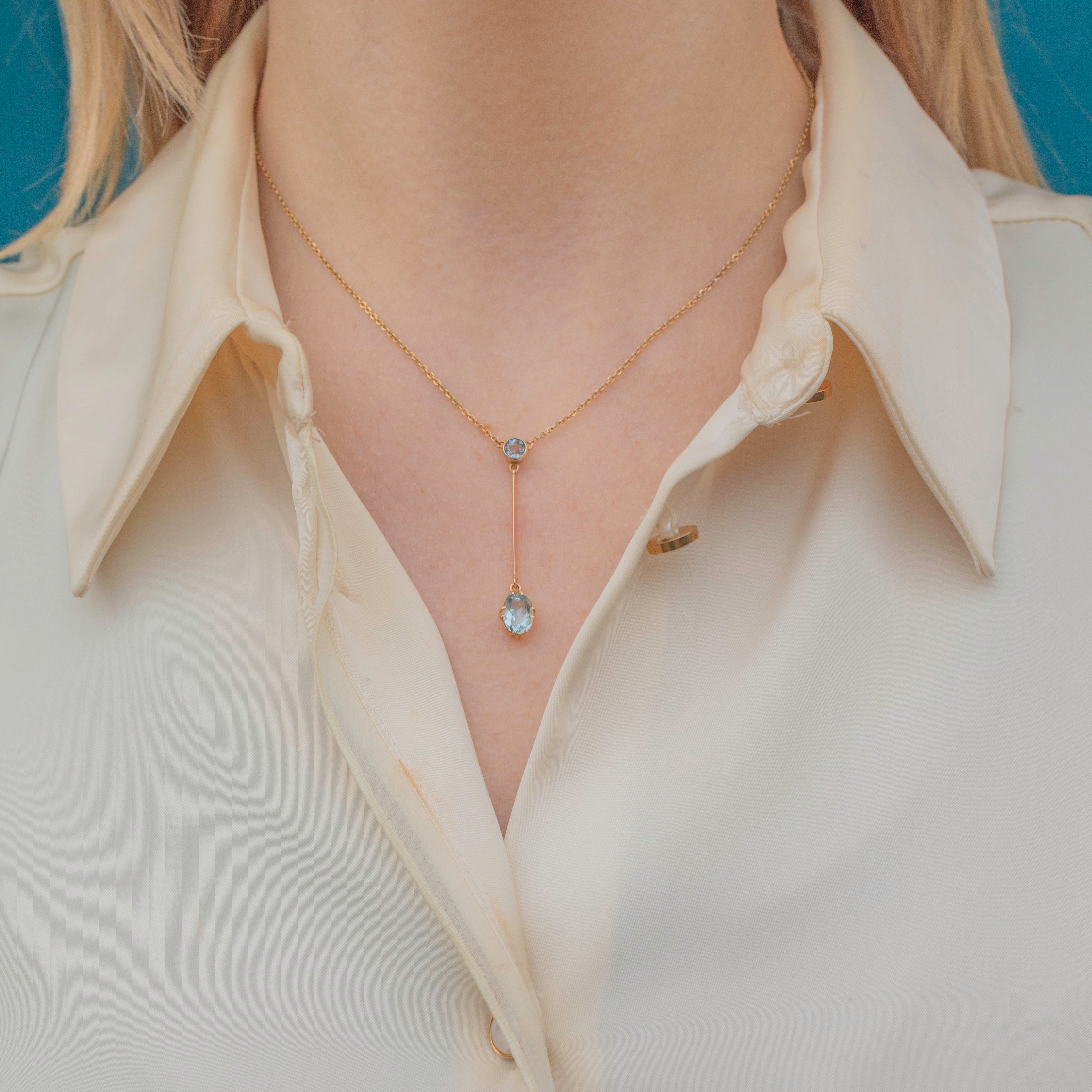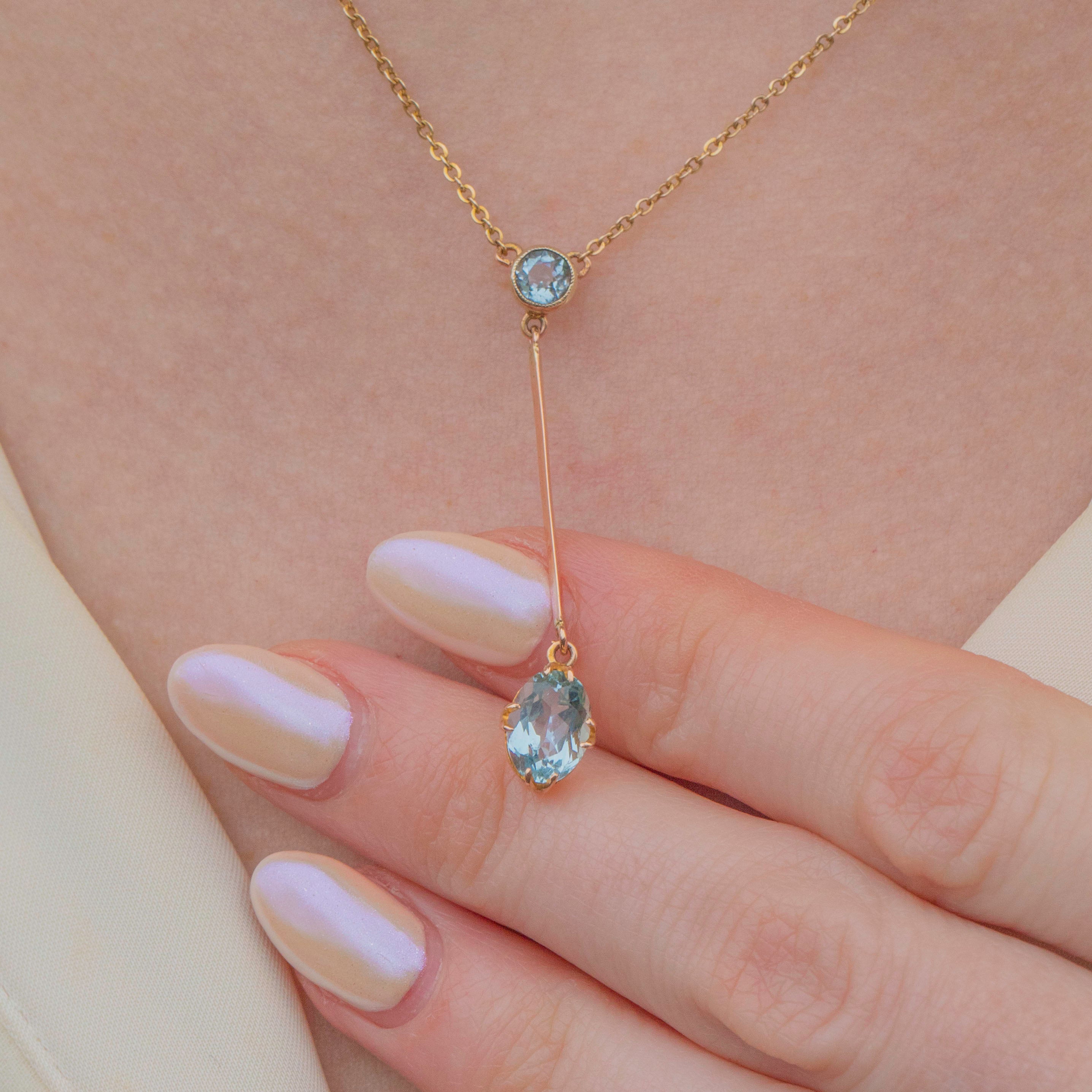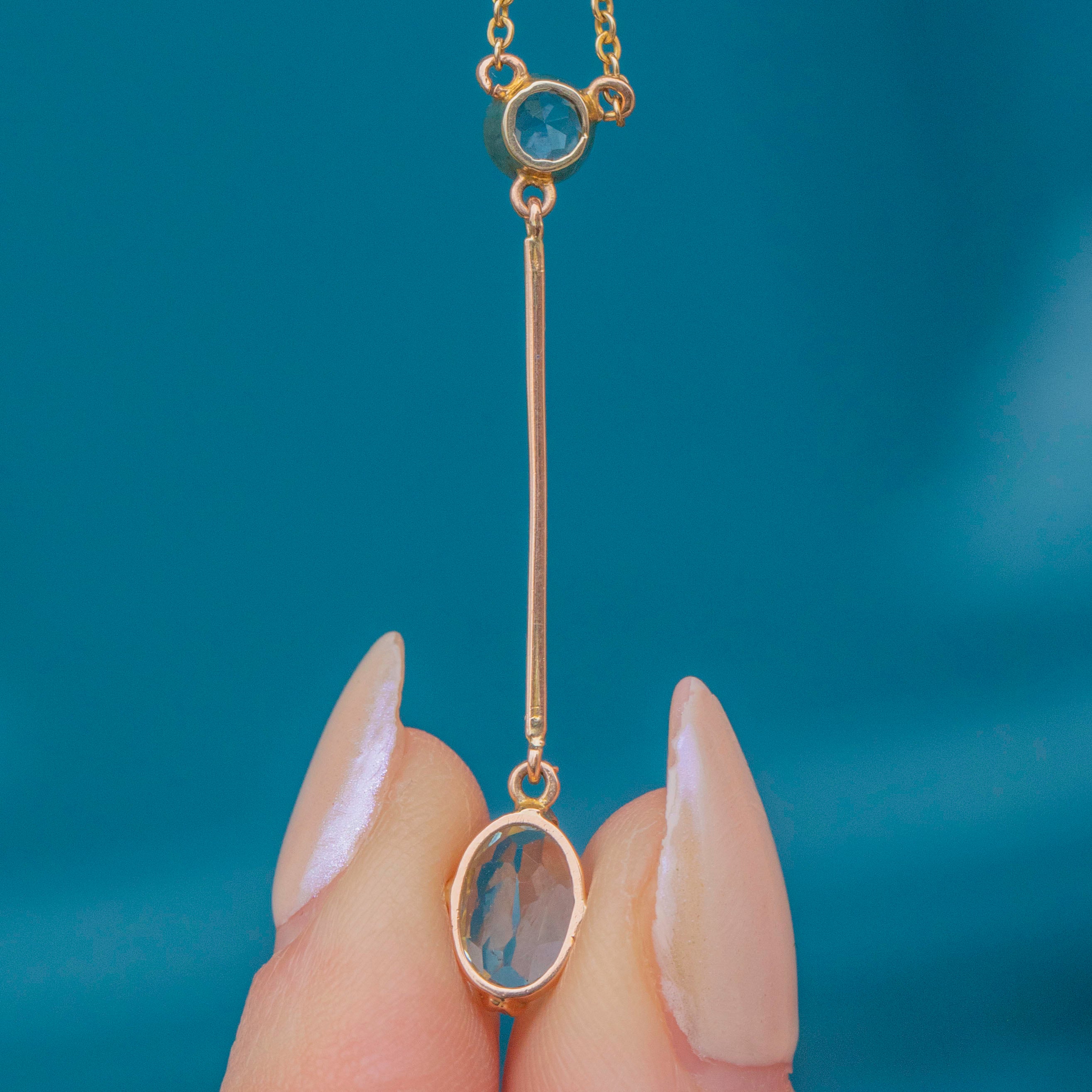 This Edwardian 9ct Gold Aquamarine drop necklace is a truly magnificent piece! Boasting two gorgeous Aquamarine gems with a combined carat weight of 1.10ct, she is the perfect balance of glamour and elegance.