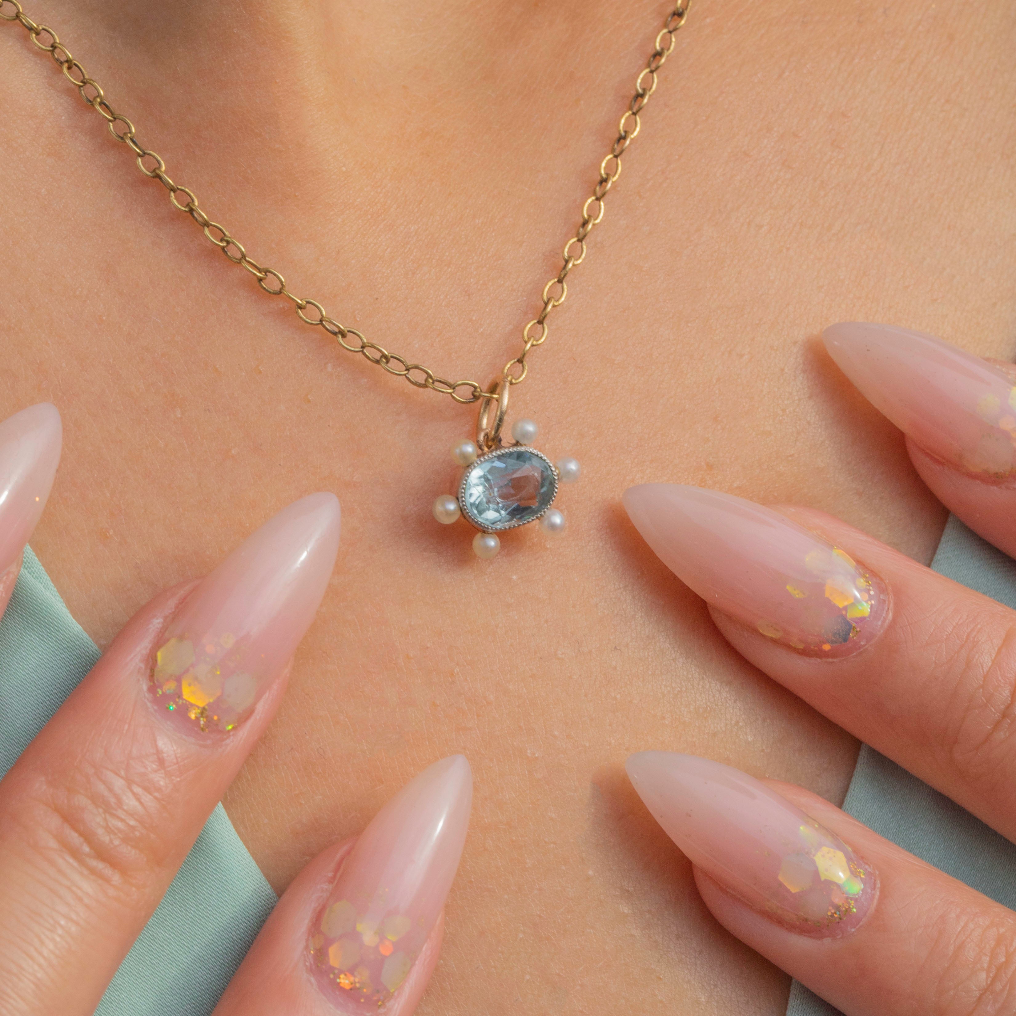 This Edwardian pendant is a charming little treasure, crafted in 9ct Gold and set with a glowing oval Aquamarine framed by creamy Pearls. The Aquamarine weighs approximately 1.78ct, displaying a soft and delicate blue that contrasts beautifully with the warm Gold setting.