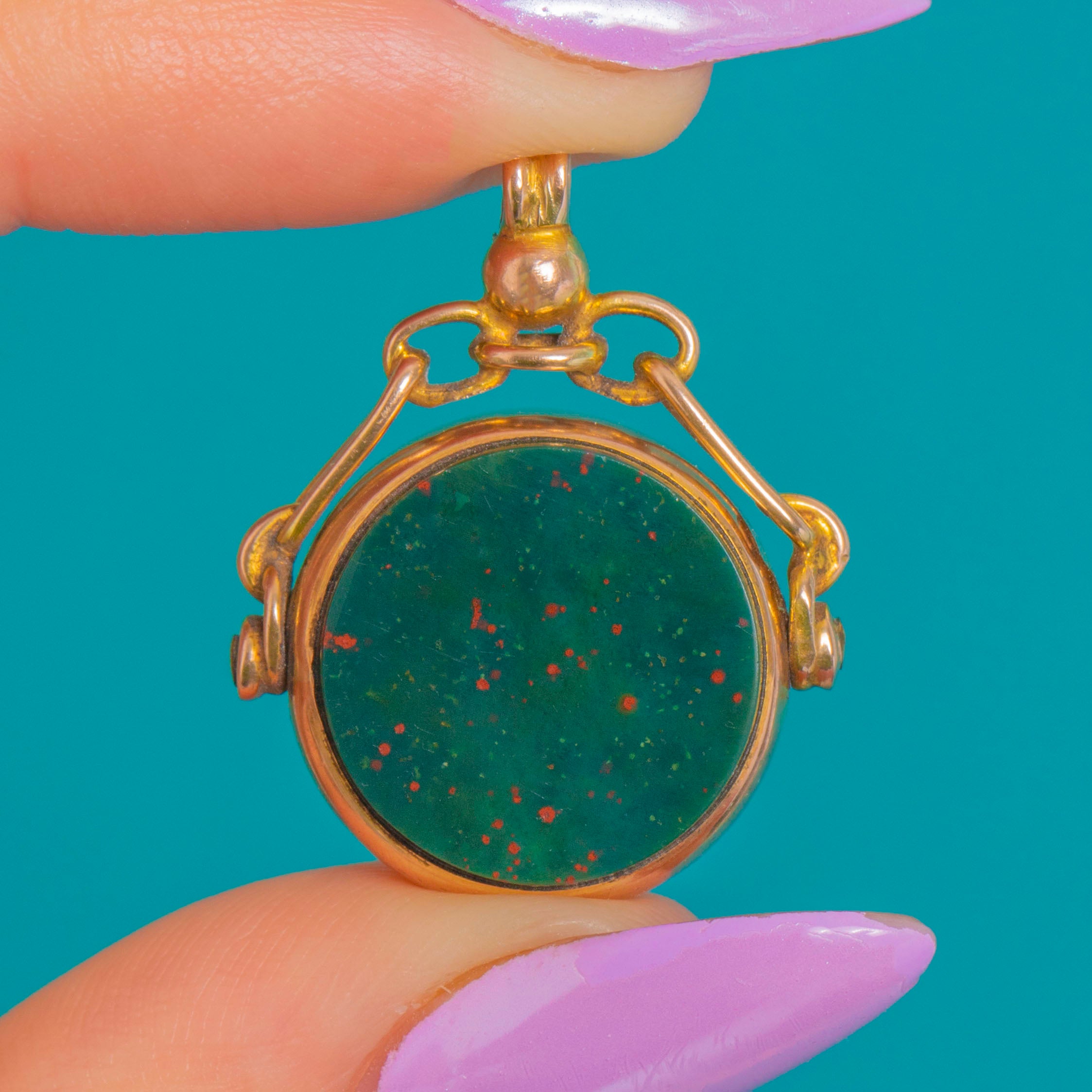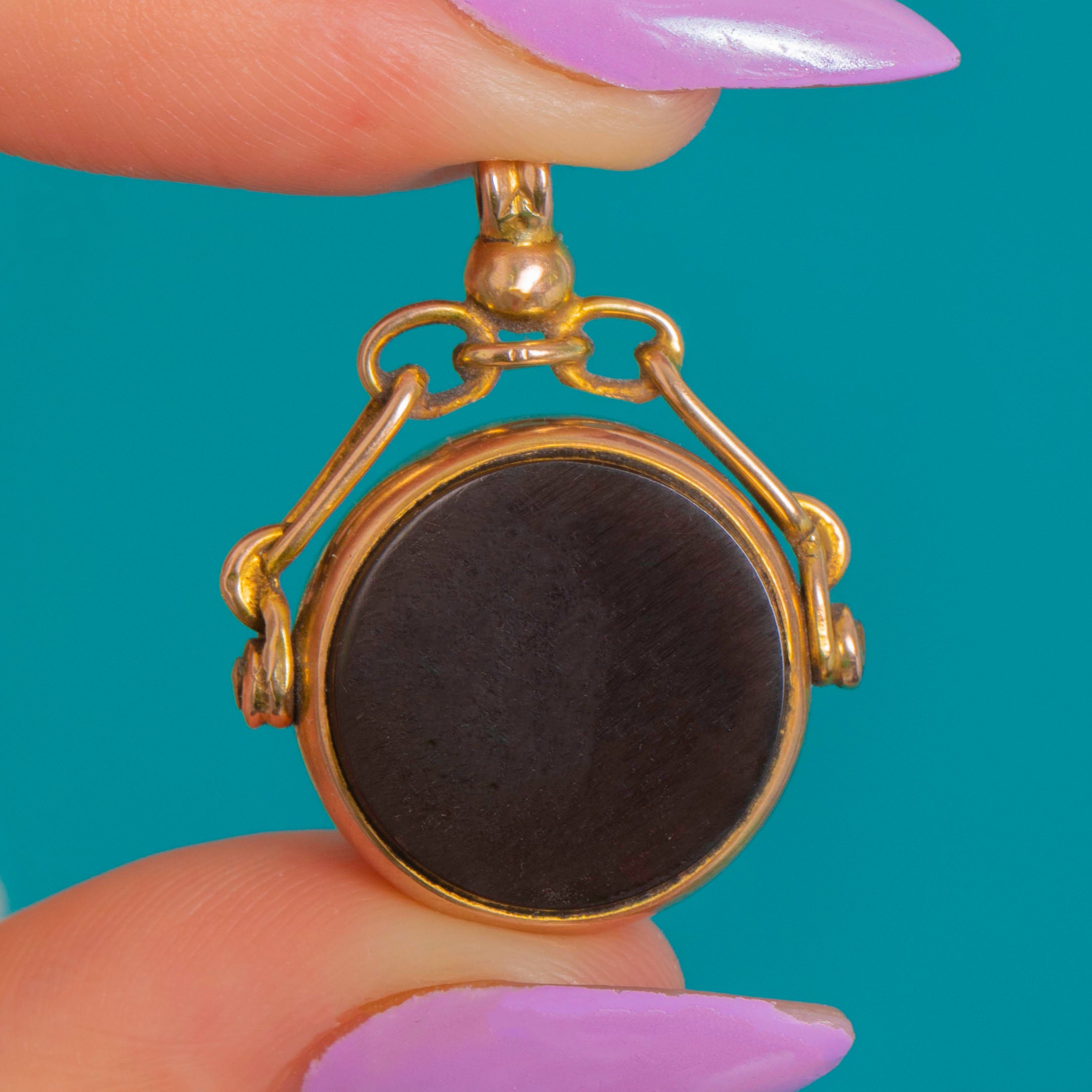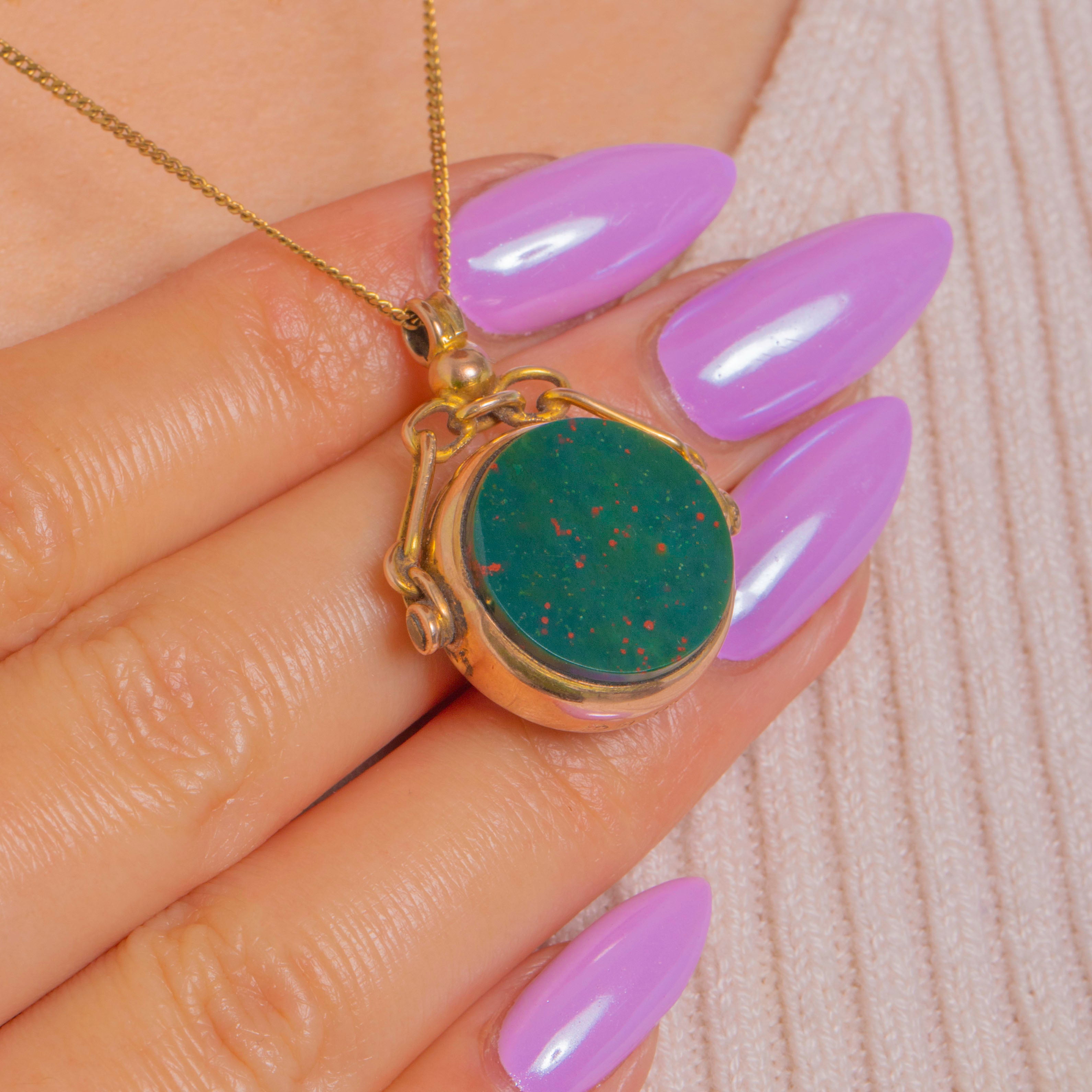 A refined Edwardian fob pendant crafted in rich 9ct Gold, this circular treasure is set with characterful Bloodstone flecked with vivid reds and complemented by sleek Onyx. The cabochon sits in a smooth bezel, suspended from an elegant double-armed, articulated bracket and petite round bail for a poised, timeless silhouette.