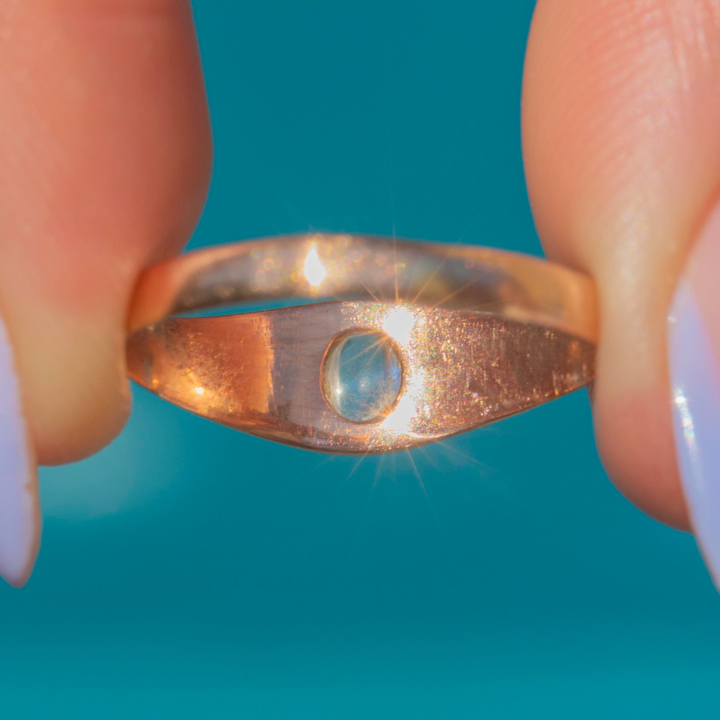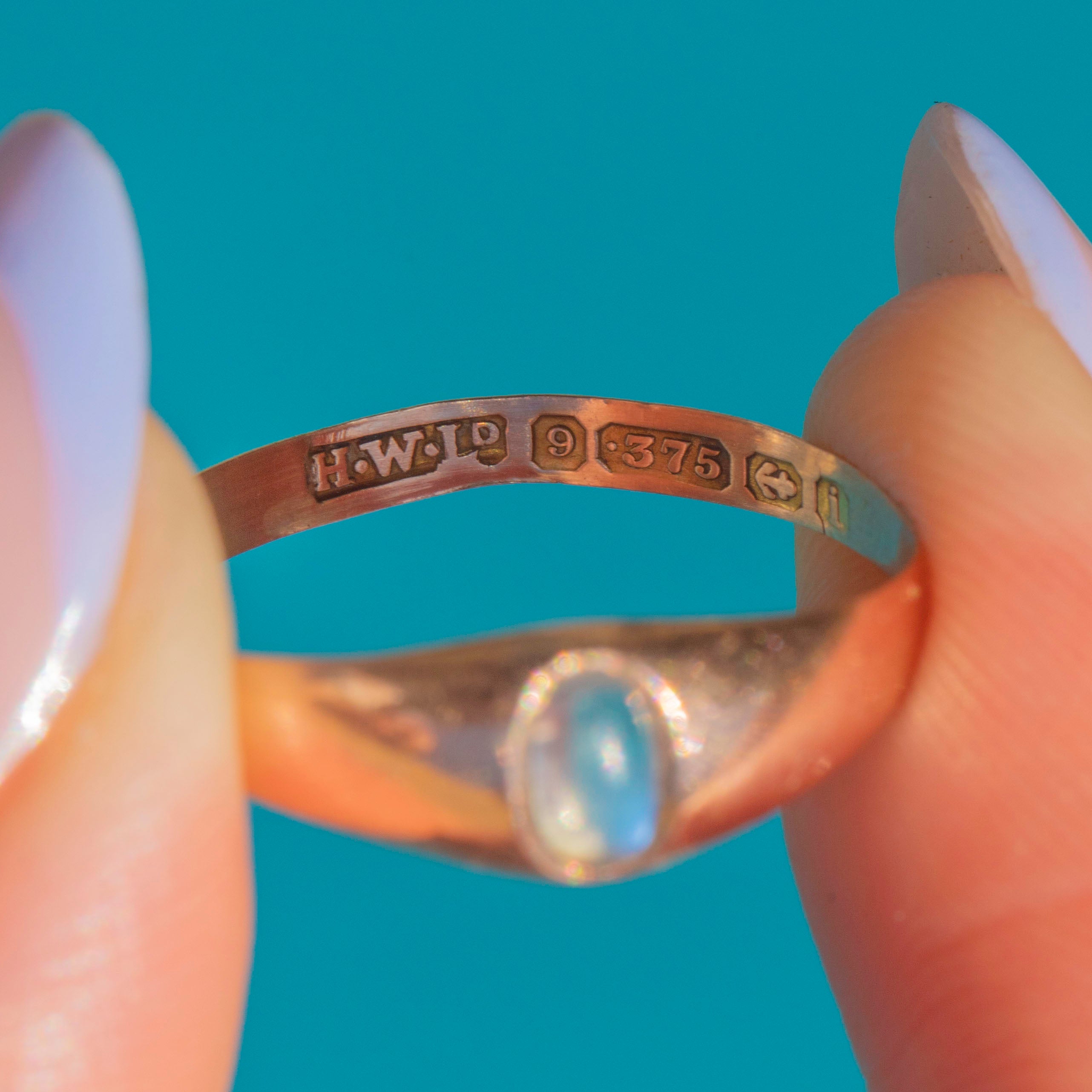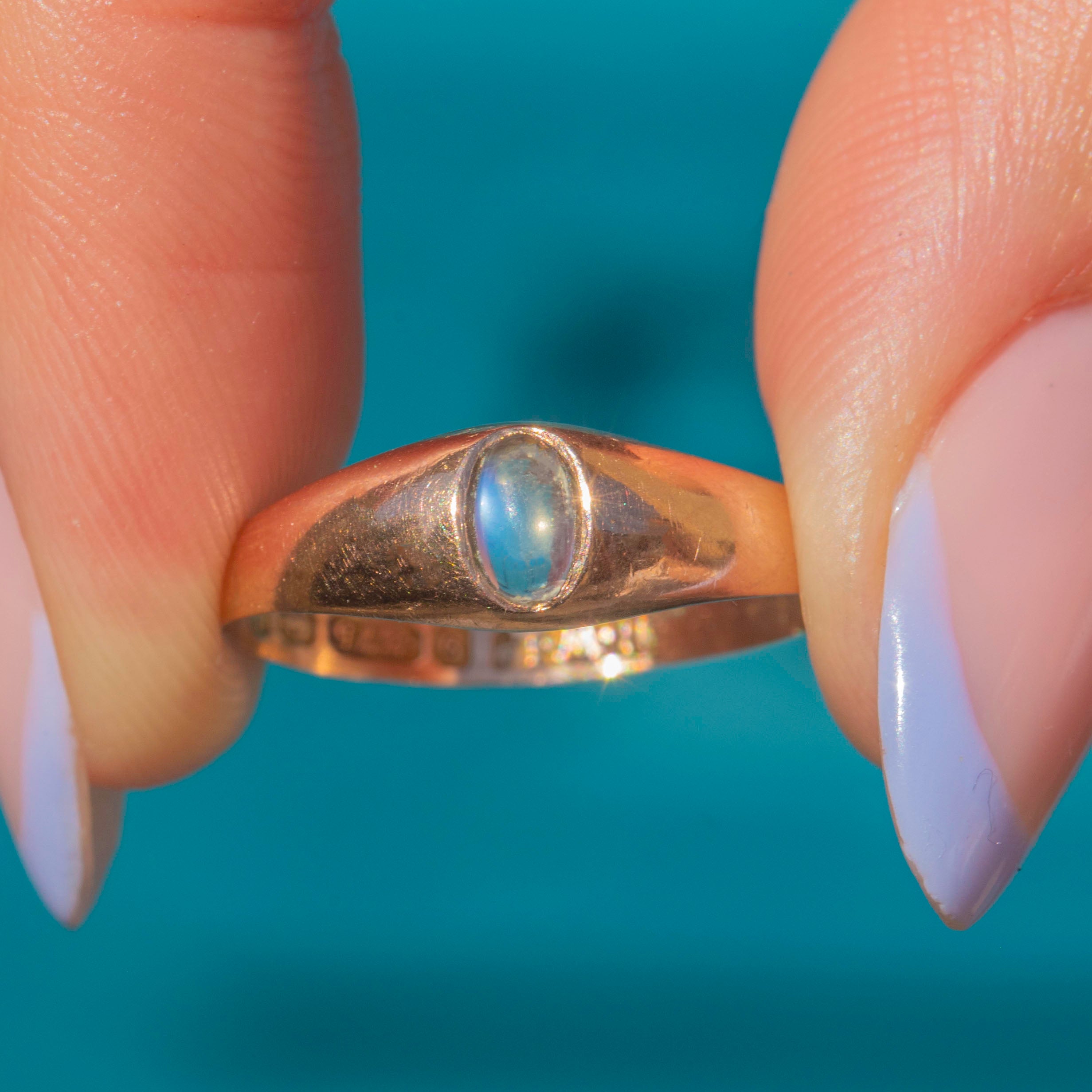 A mystical Edwardian 9ct Gold Ceylon Moonstone solitaire ring for your repertoire! You will become transfixed by the blue schiller that billows across the 0.28ct Moonstone cabochon; this Edwardian ring is one to be admired.