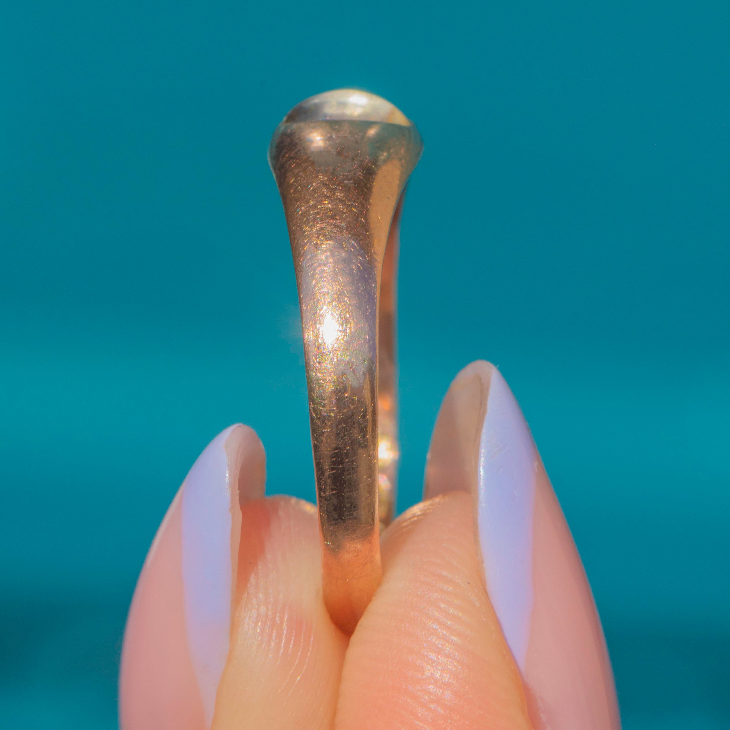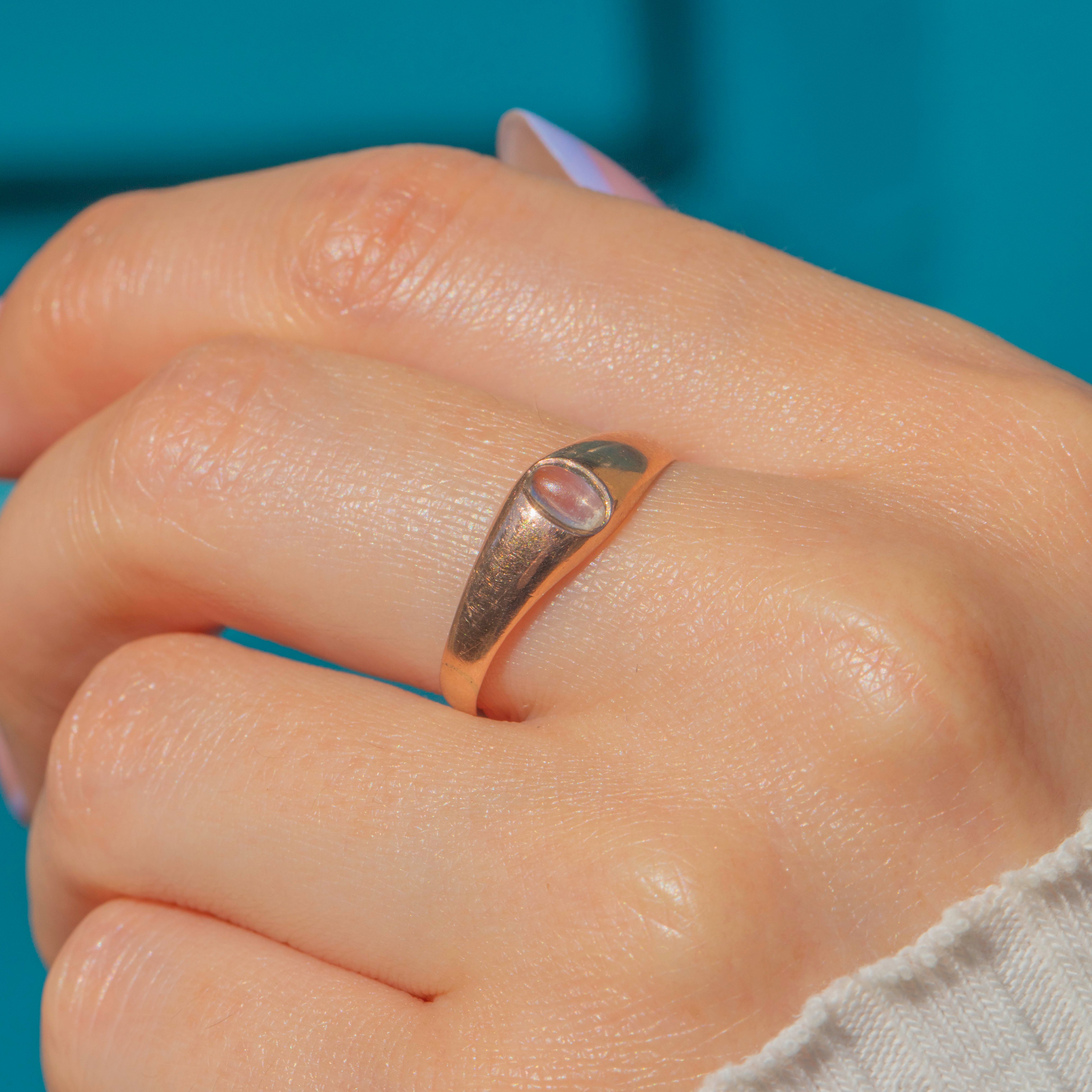 Poised within a chunky bezel setting, her Moonstone looks vivid against the rose-kissed hue of her 9ct Gold. A stone associated with balance and relaxation, this Moonstone solitaire ring will bring a wave of calm to its wearer!