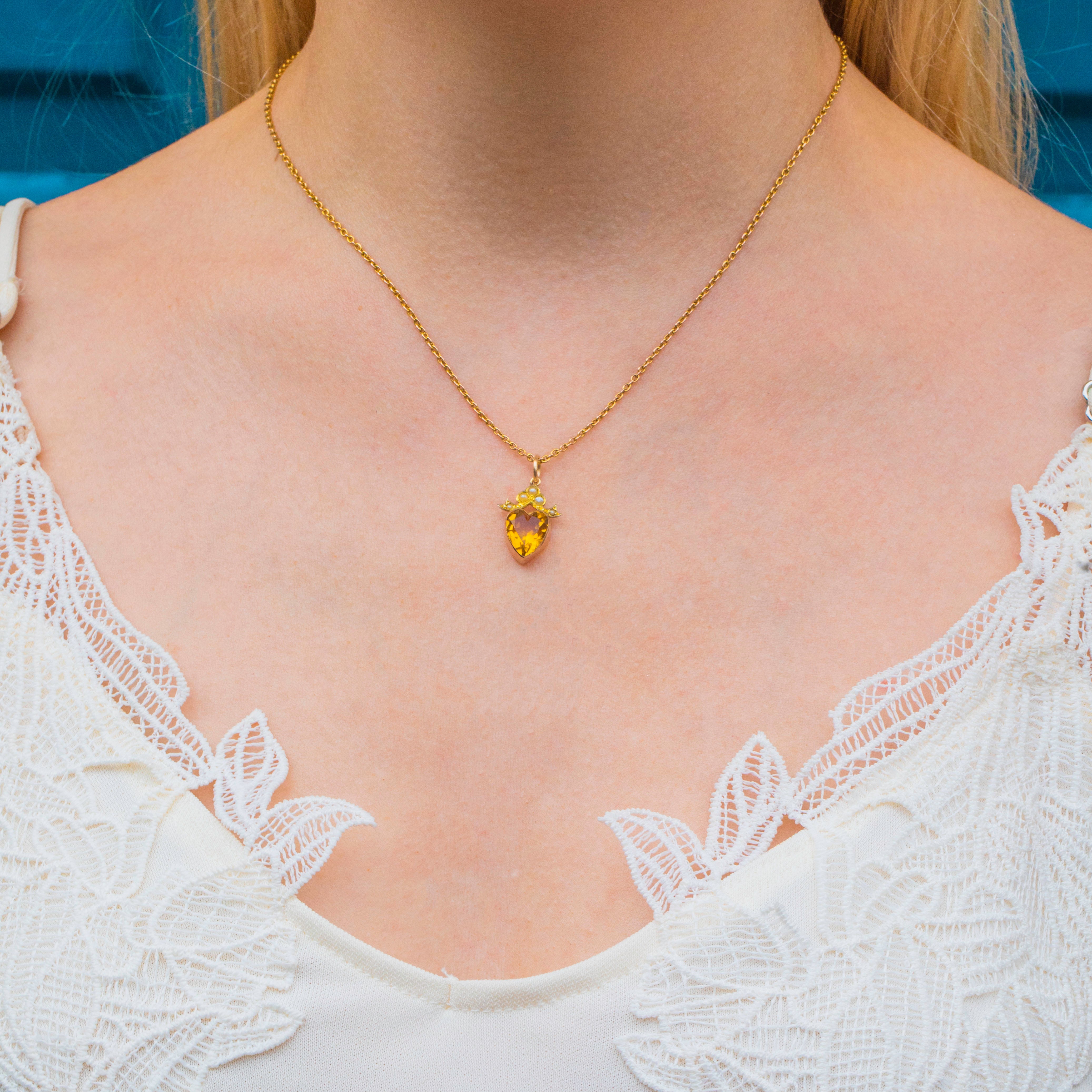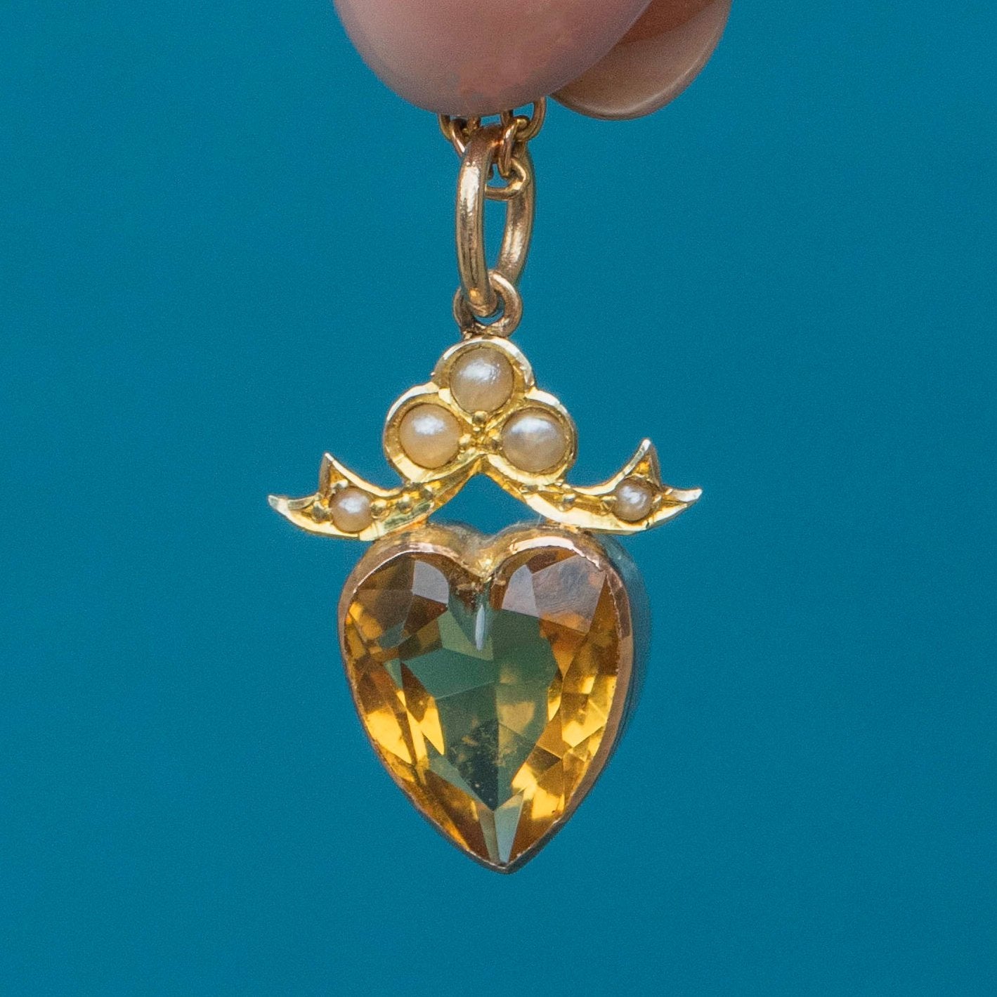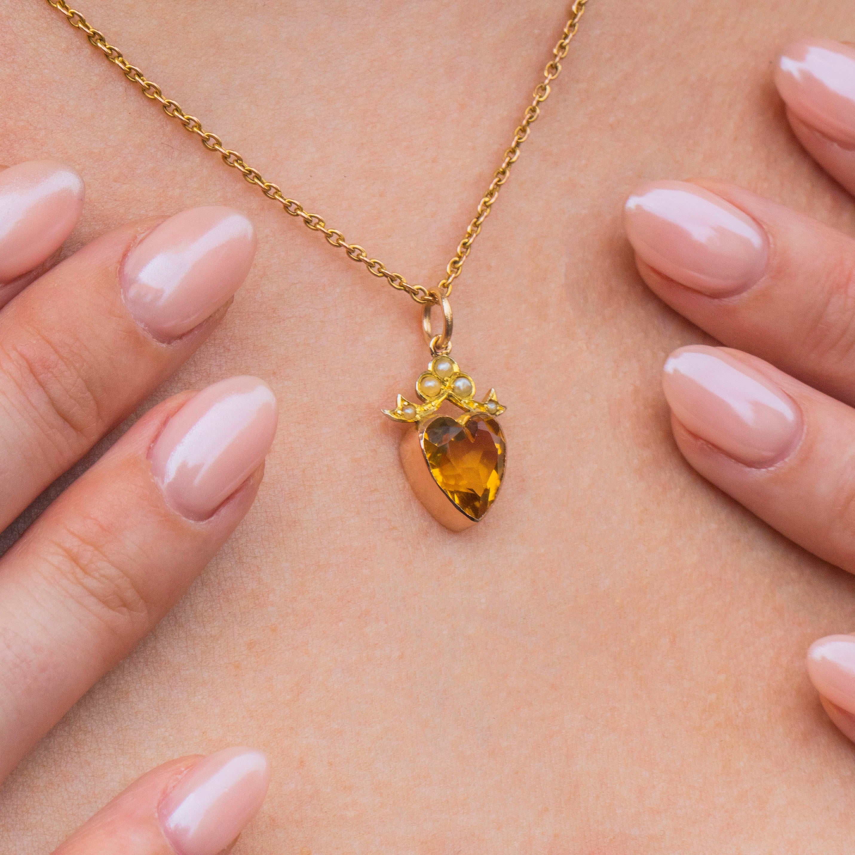 It is not just beautiful to look at; the heart is the universal symbol of love, making this Citrine Pearl pendant the ideal gift for a loved one. This Victorian Citrine charm will look a treat threaded onto a dainty Gold chain adorning your décolletage!