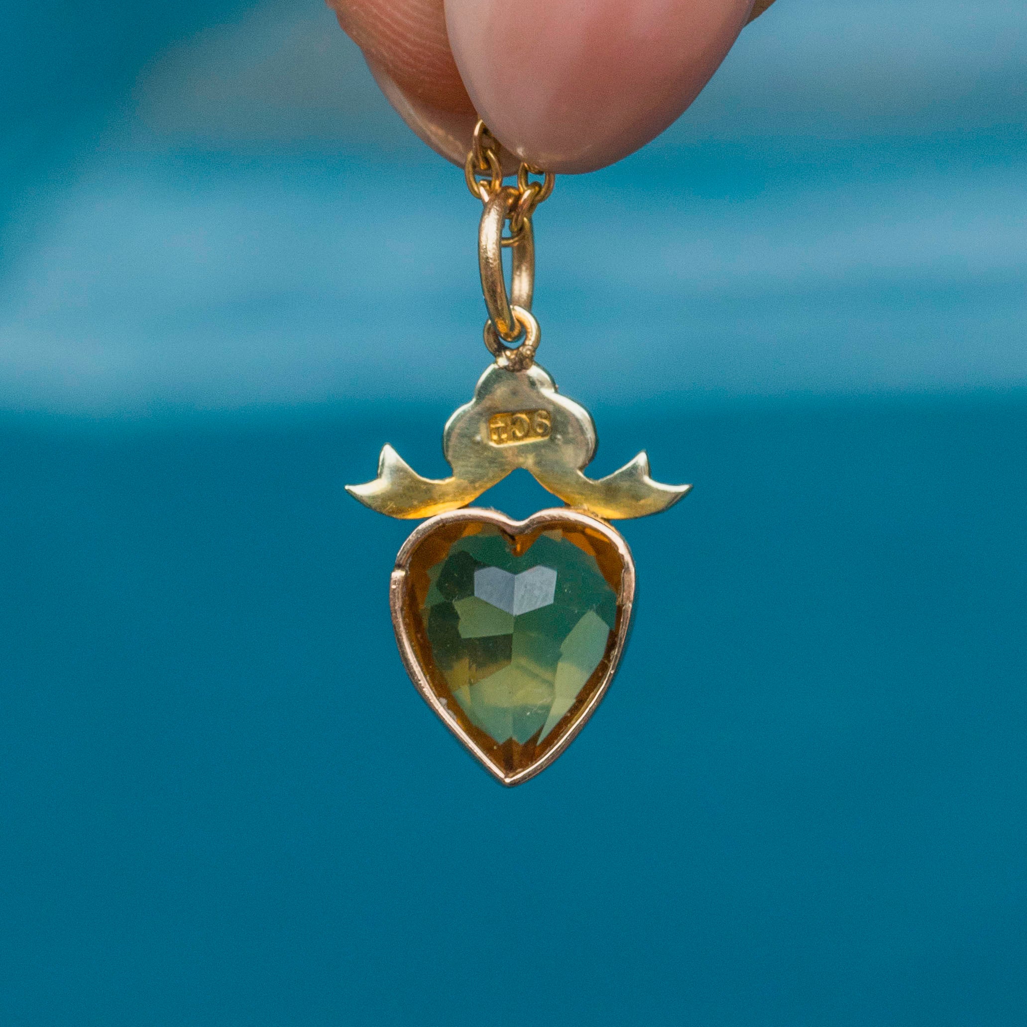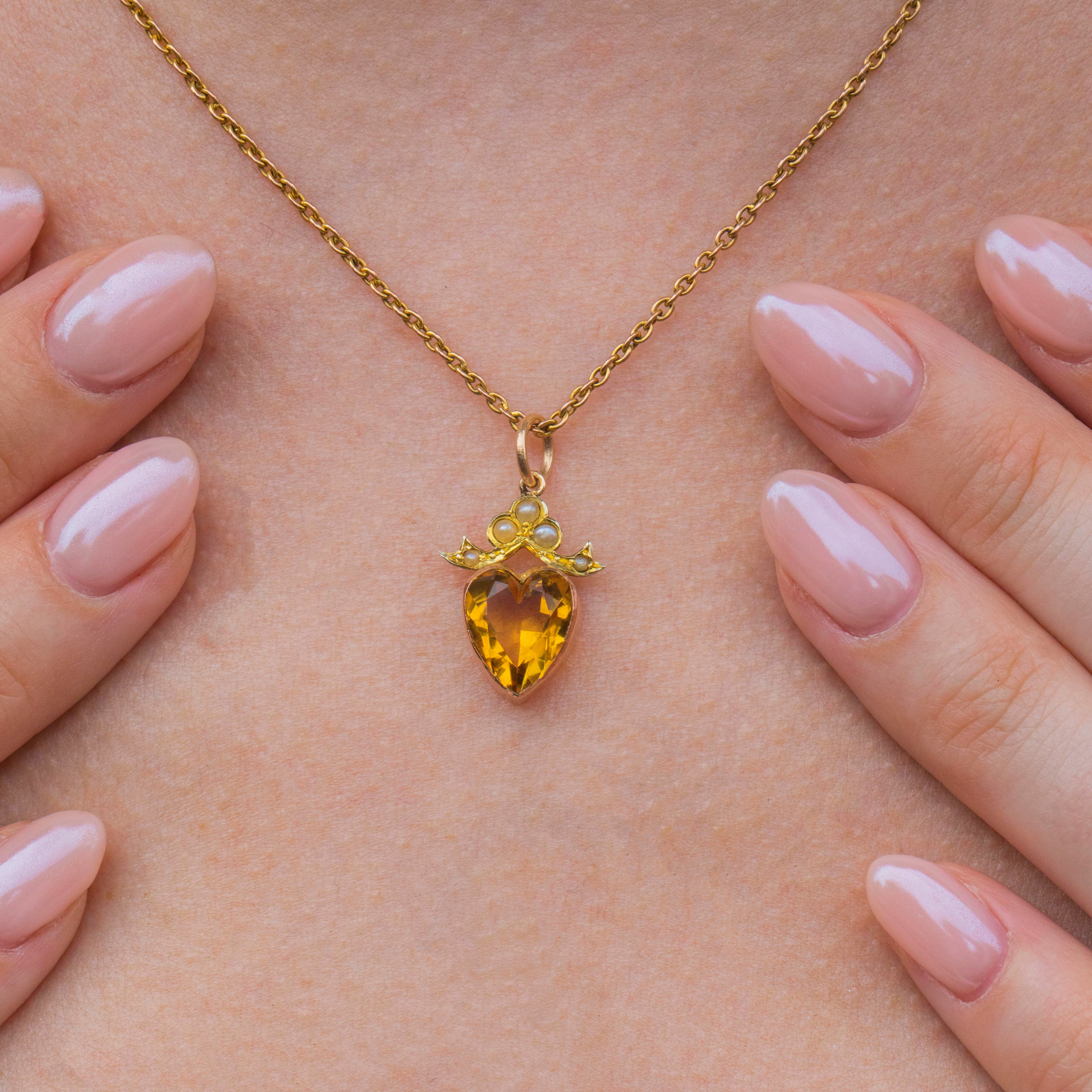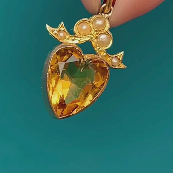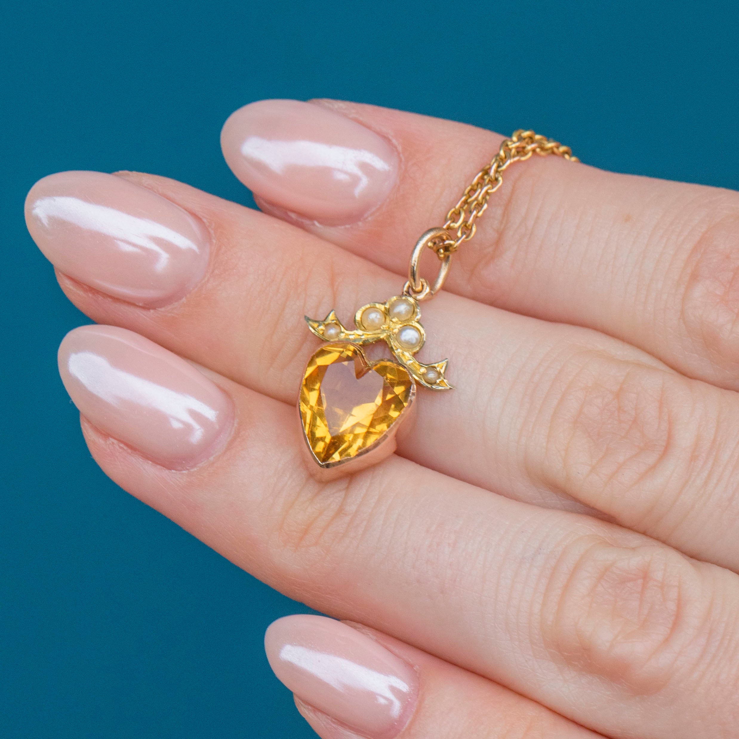 An antique 9ct Gold Citrine Pearl heart pendant to truly ignite your antique jewellery collection! Her heart-shaped Citrine trickles honey hues through each of her facets from front to back, catching the light perfectly! Her Citrine is crowned by a neatly tied bow, inlaid with champagne-infused Pearls.