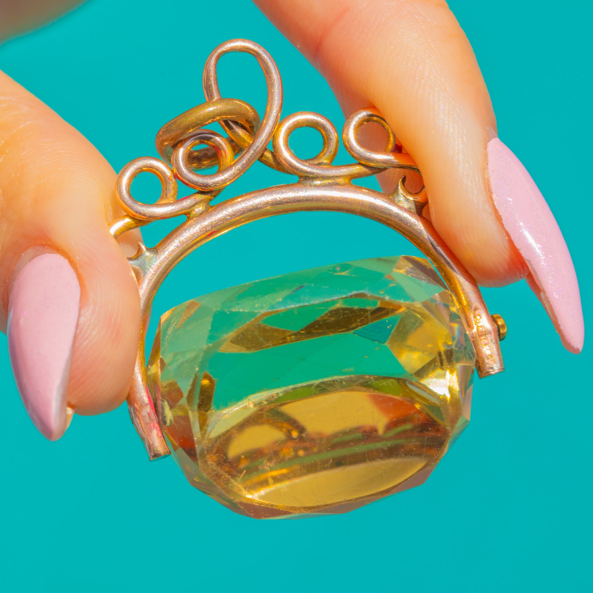 EXCELLENT: The Citrine is bright and lively with minimal surface wear visible under magnification and no chips or cracks observed. The 9ct Gold mount is clean and secure, with the spinner mechanism operating smoothly and only light age-related marks.