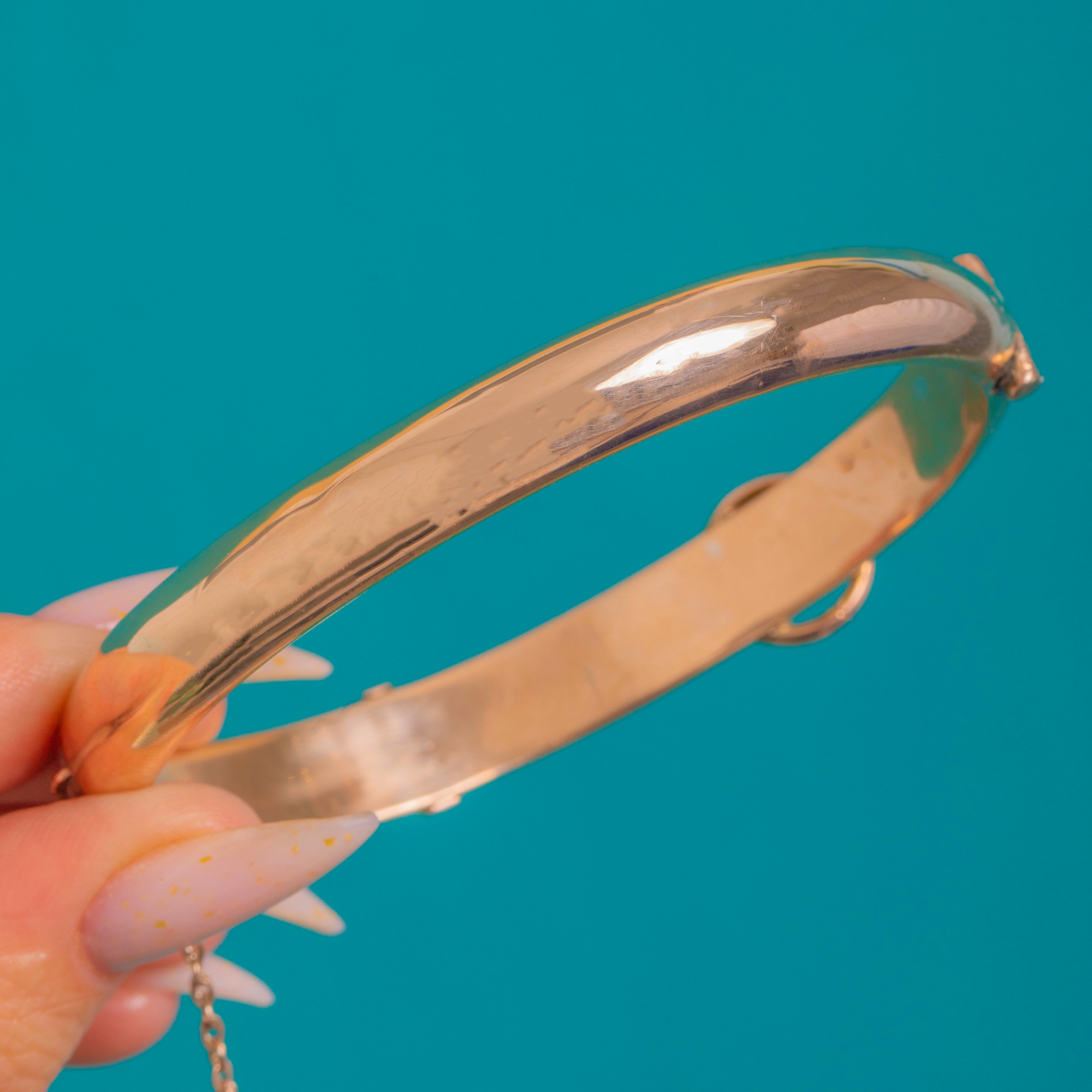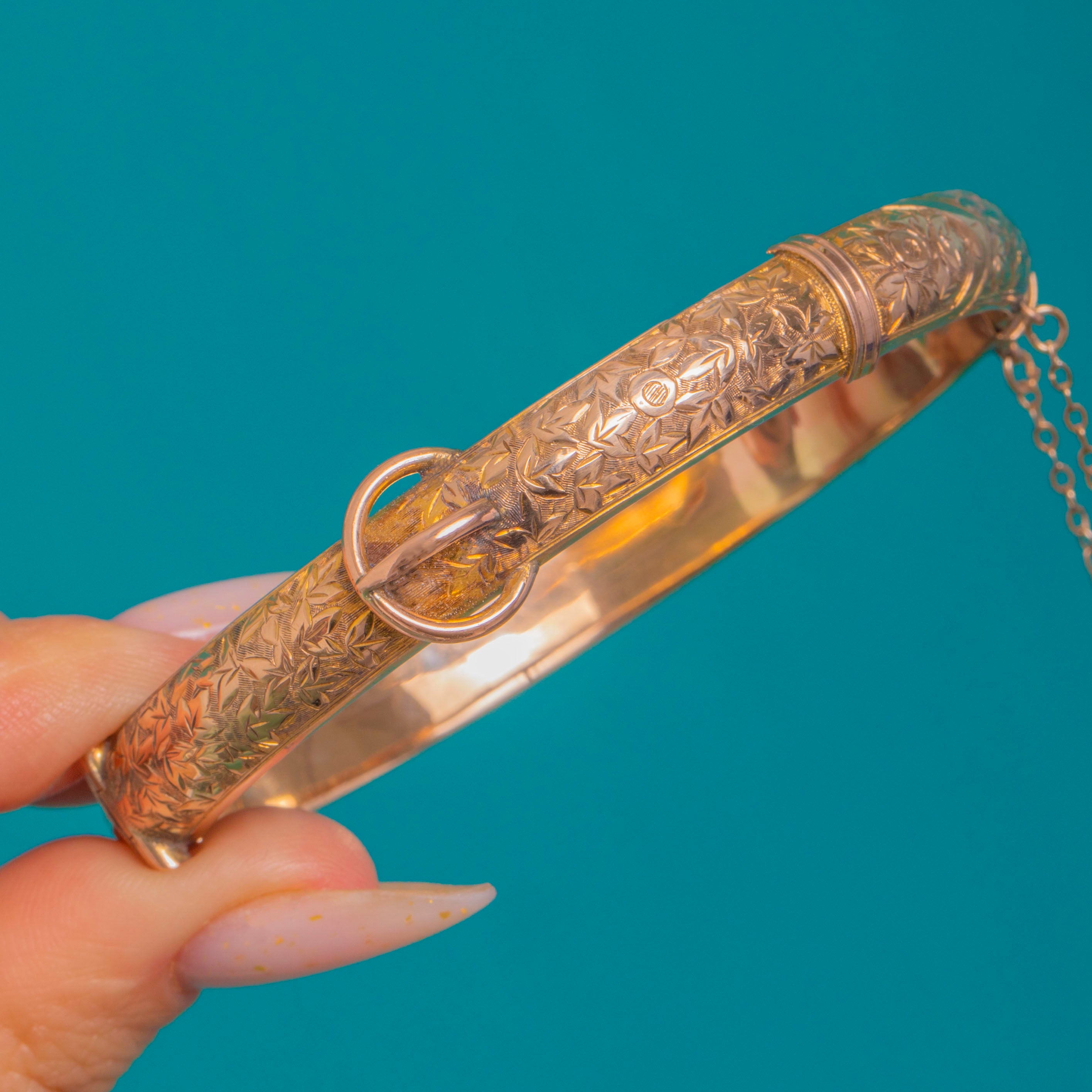 A classic Edwardian buckle bangle in 9ct Gold, hallmarked for Chester 1902. The front is beautifully adorned with a raised belt-and-buckle motif over dense bright-cut foliate engravings, contrasted with a sleek polished section. Its warm rosy hue and domed profile create a refined, elegant presence on the wrist.