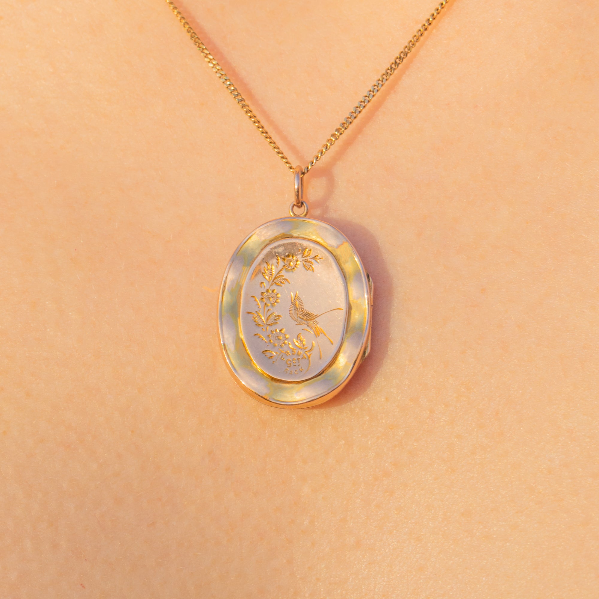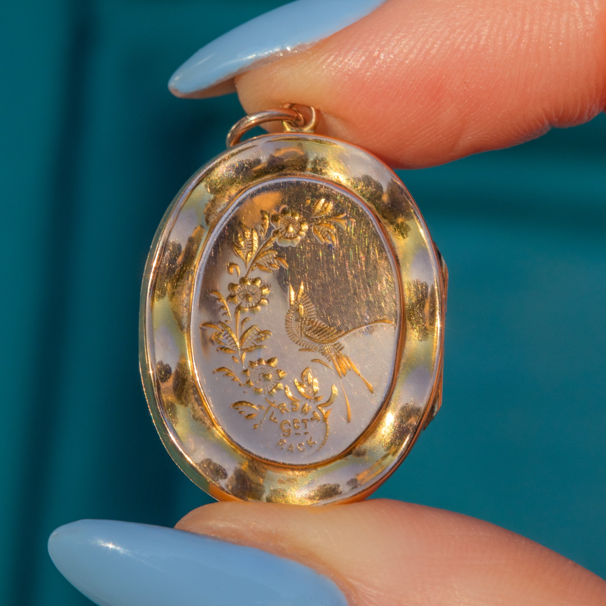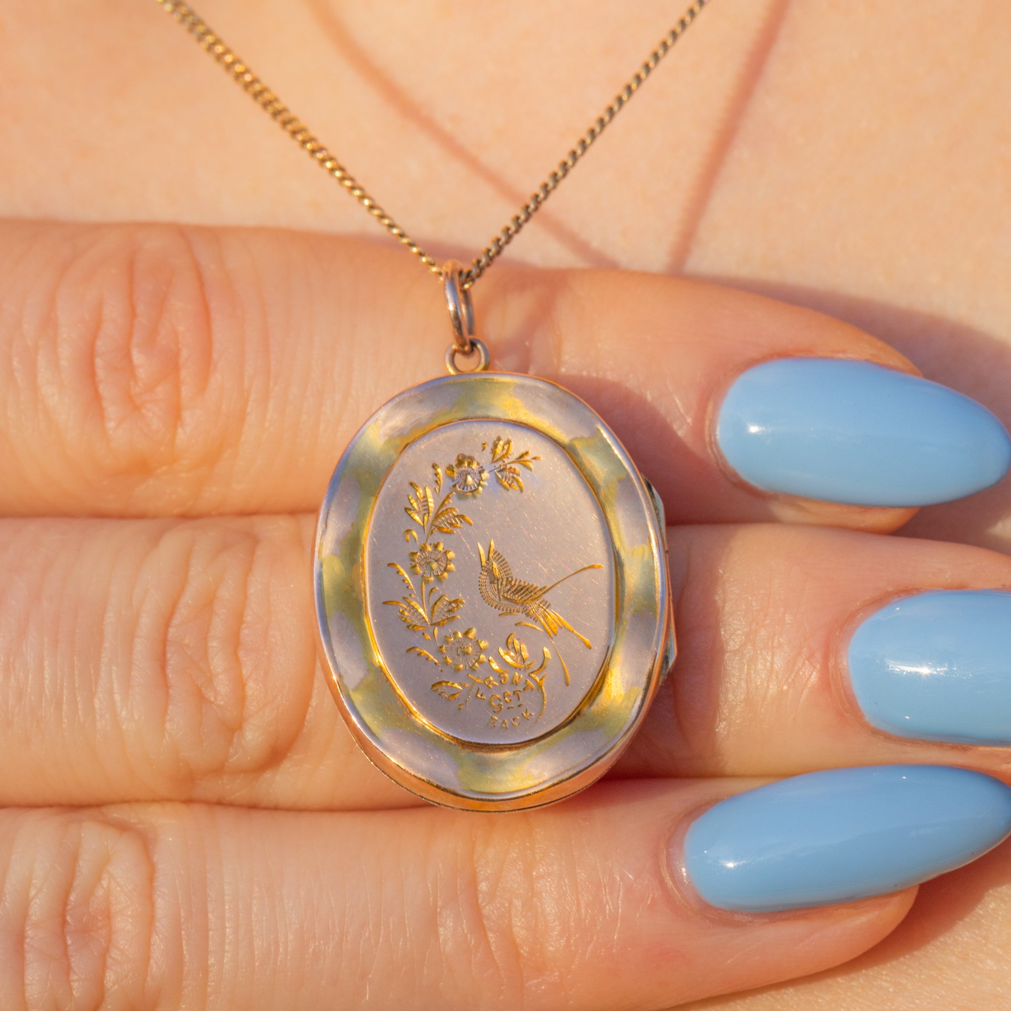 Edwardian 9ct Gold Engraved Swallow Oval Locket