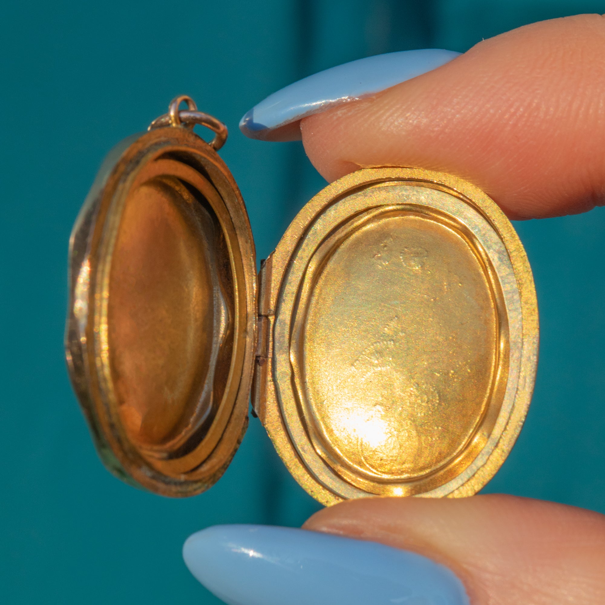 EXCELLENT. This Edwardian 9ct Gold engraved swallow oval locket is in excellent condition. The locket has a soft rosy tone and is beautifully engraved on both its front and back. She shuts tightly meaning she needs some extra oomph to open, but this means you can always rely on the locket to keep your photos safe, and it closes with a click. This is a versatile piece that can be worn on a daily basis.