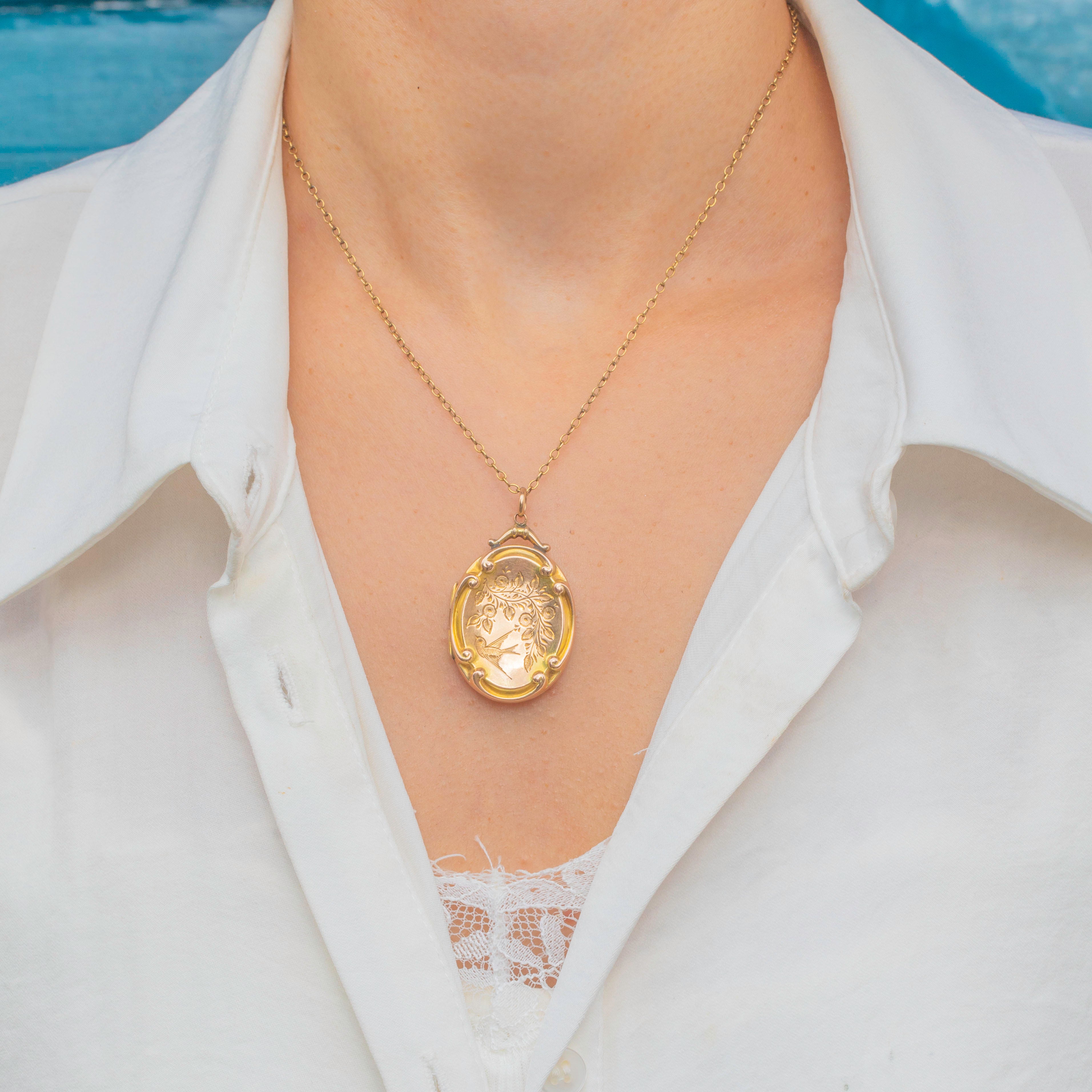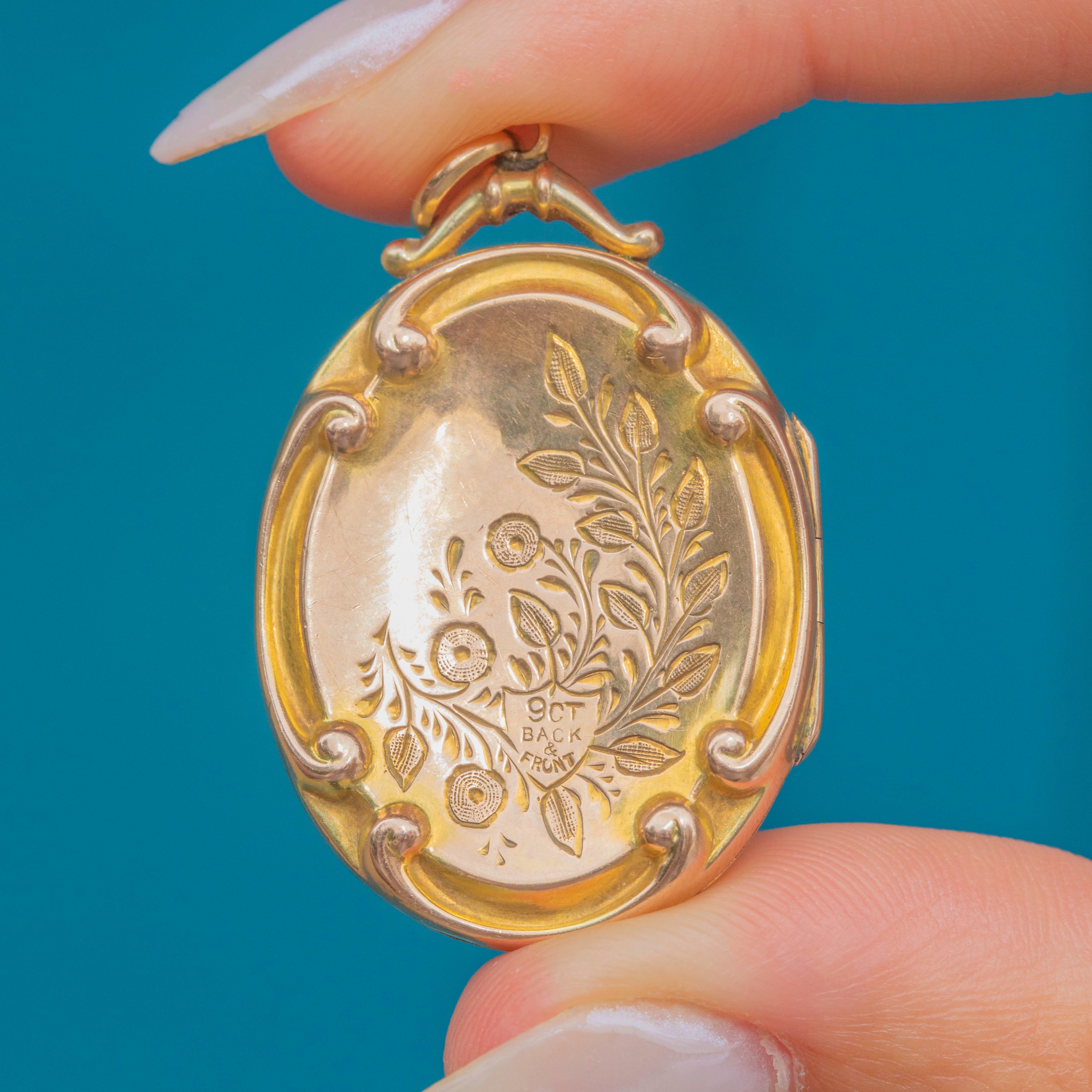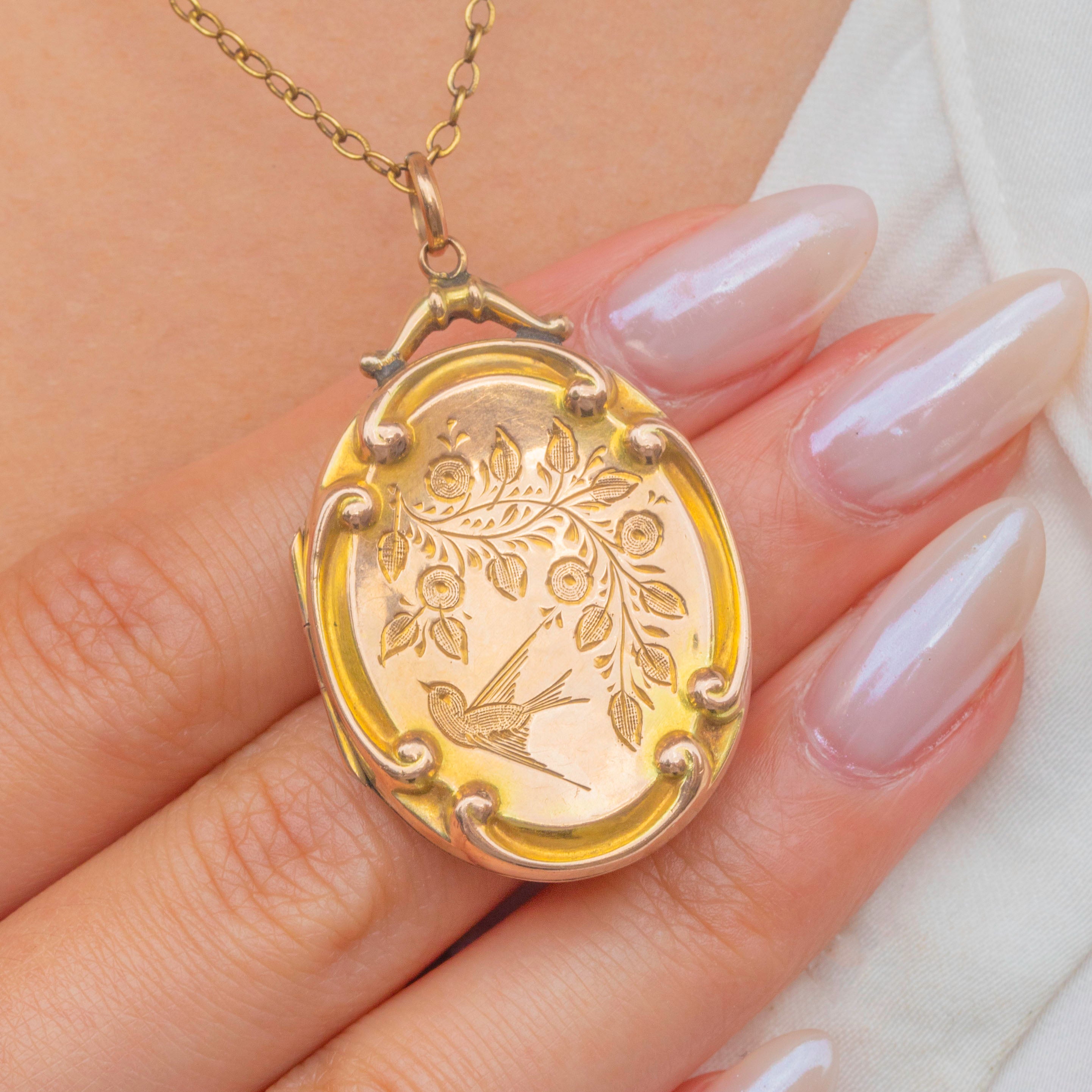 Edwardian 9ct Gold Engraved Swallow Oval Locket