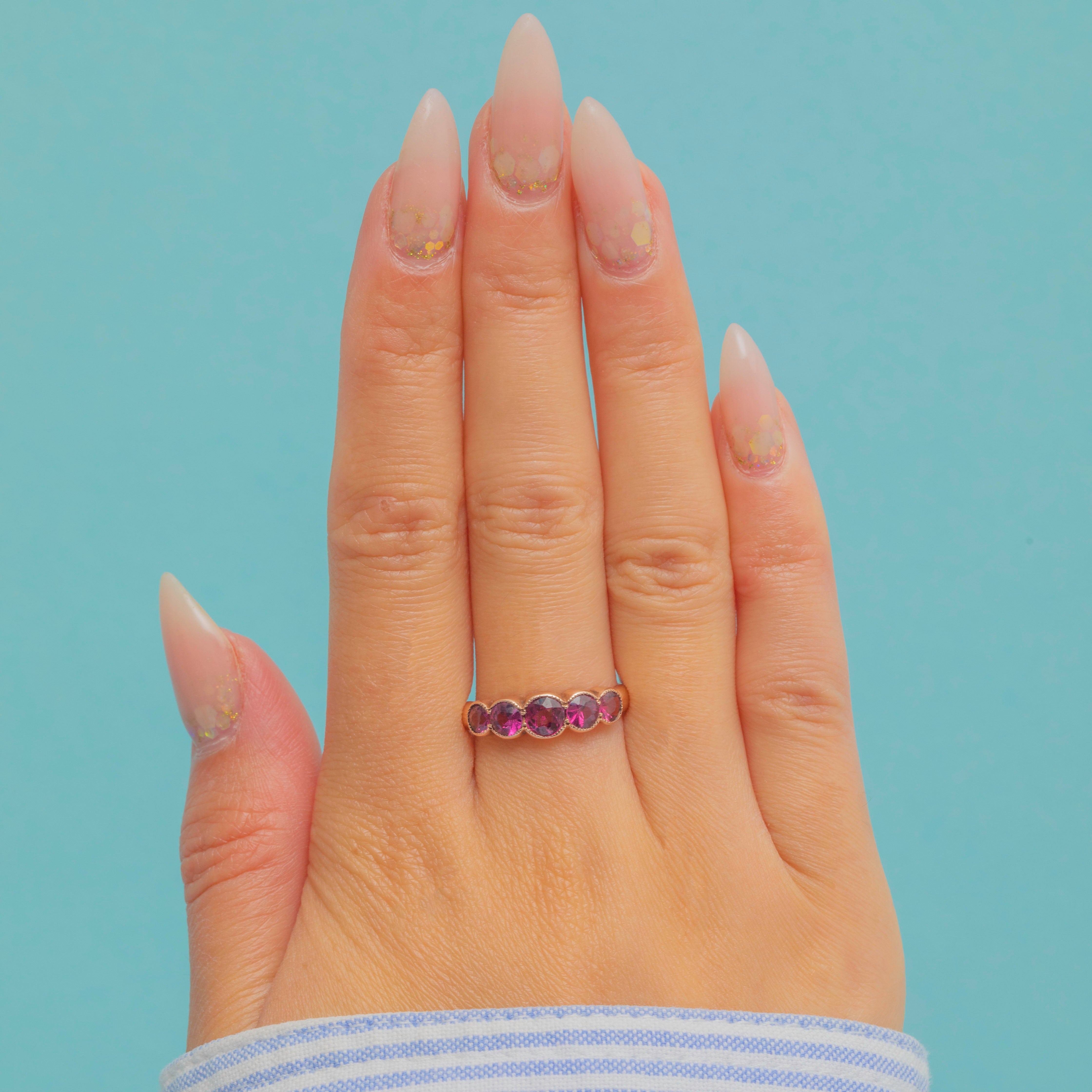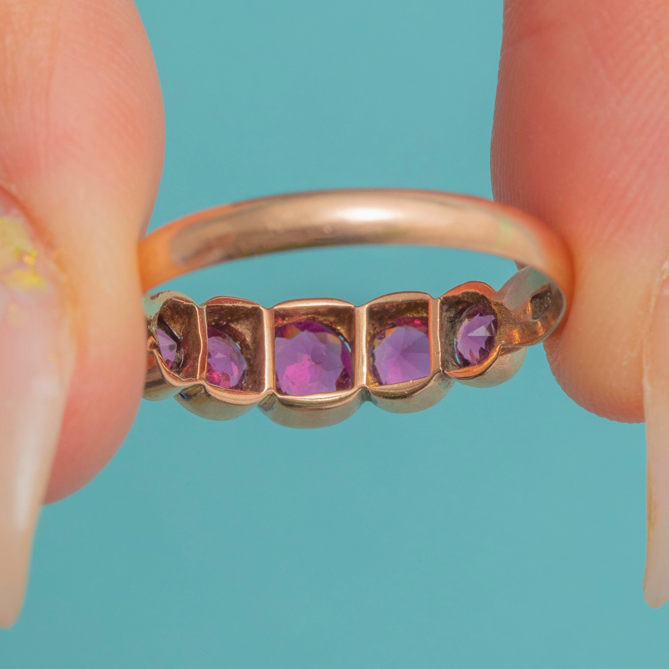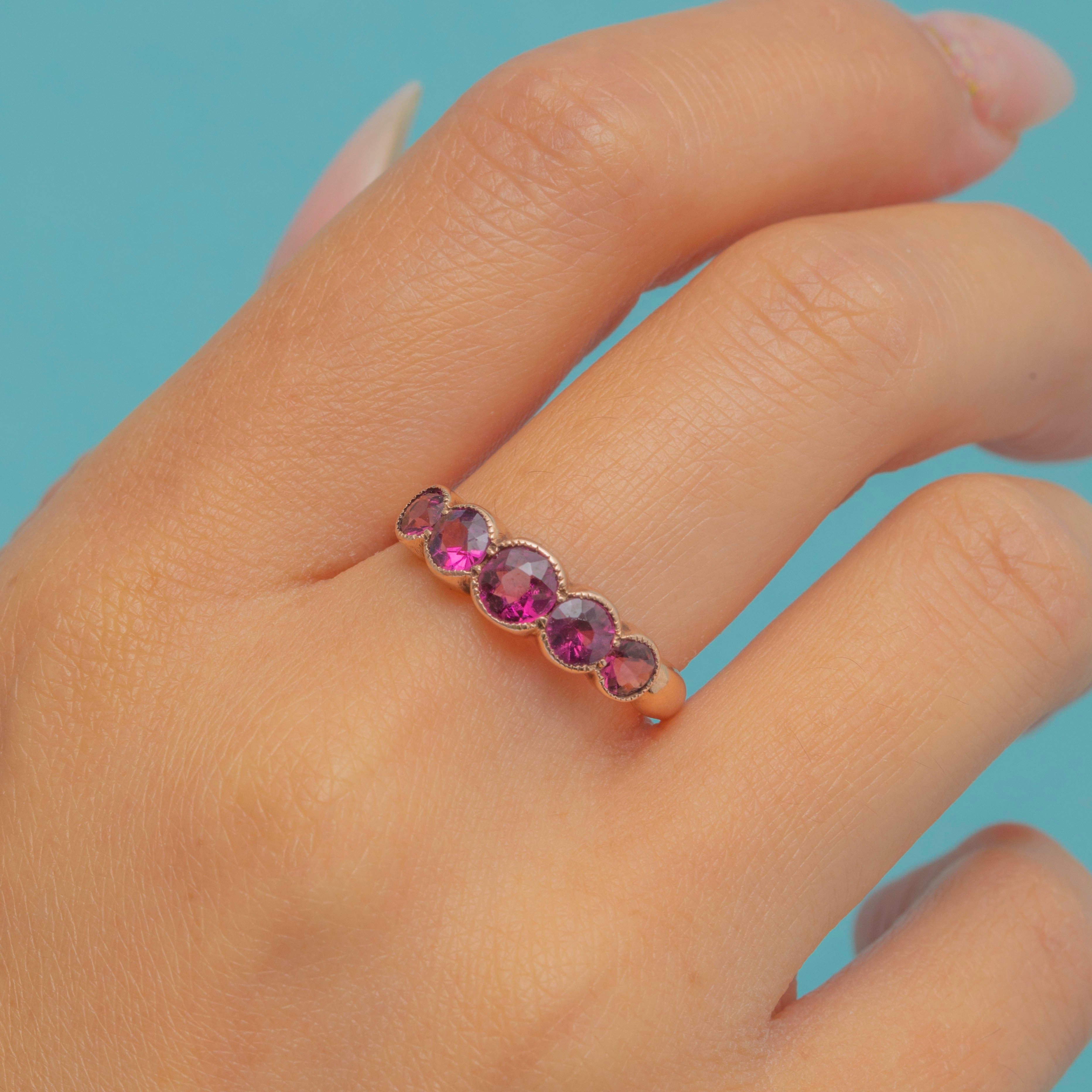 This elegant Edwardian five-stone ring is set with glowing red Garnets in a warm 9ct Gold band. The gemstones graduate in size from the centre outwards, creating a balanced and harmonious look typical of the early 20th century.