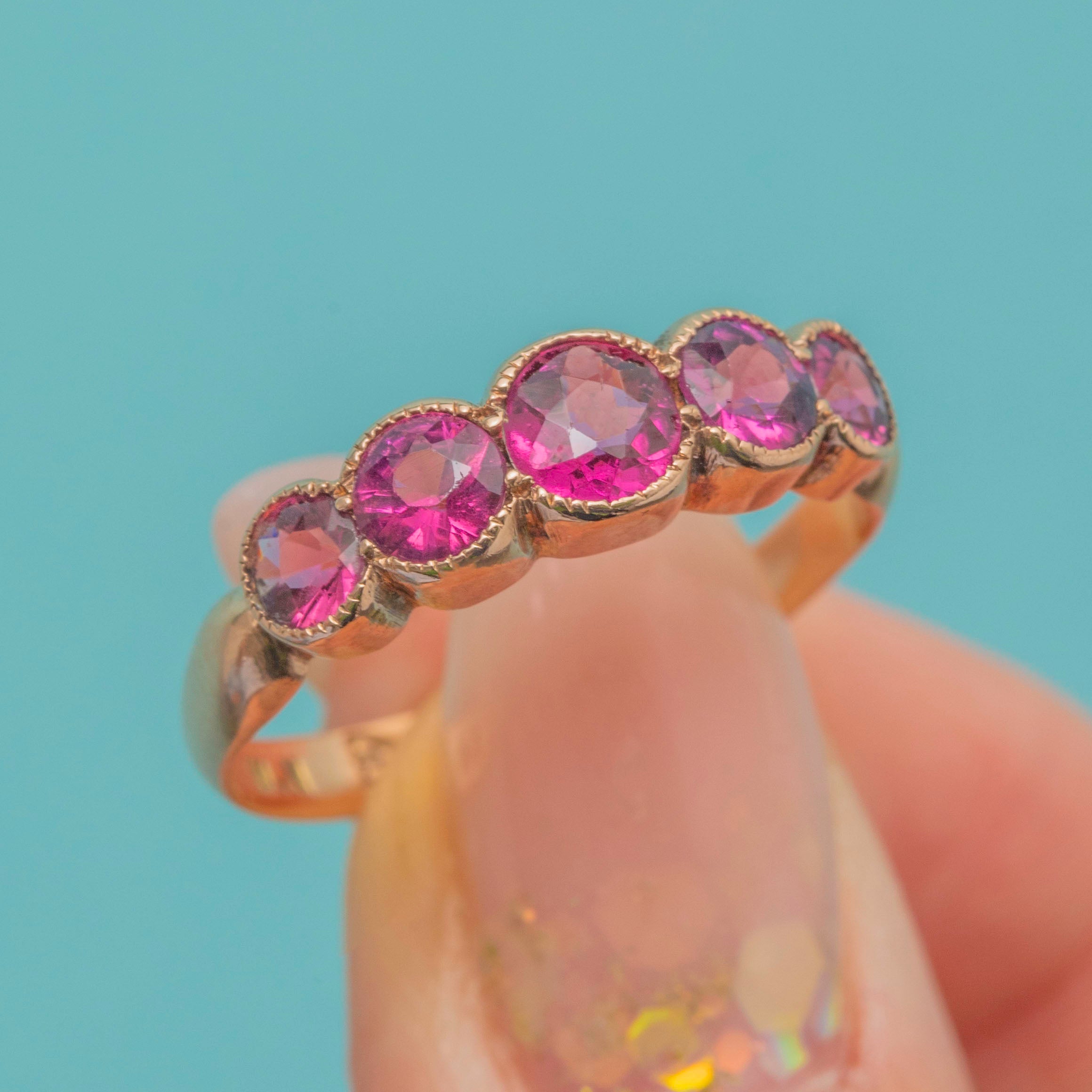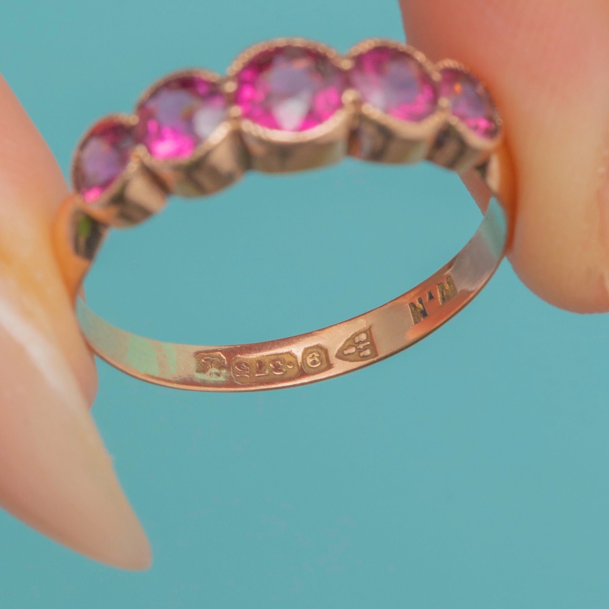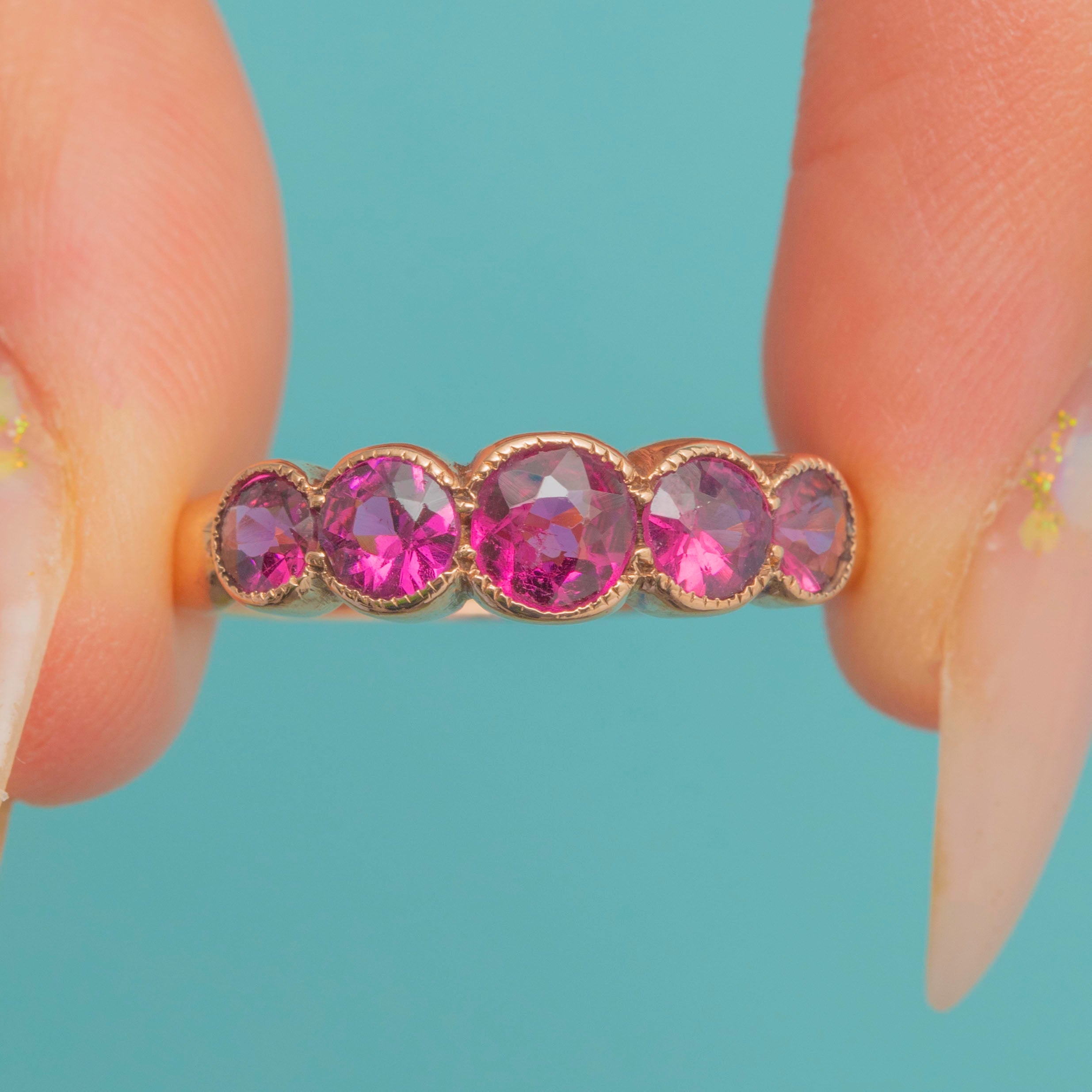 This elegant Edwardian five-stone ring is set with glowing red Garnets in a warm 9ct Gold band. The gemstones graduate in size from the centre outwards, creating a balanced and harmonious look typical of the early 20th century.