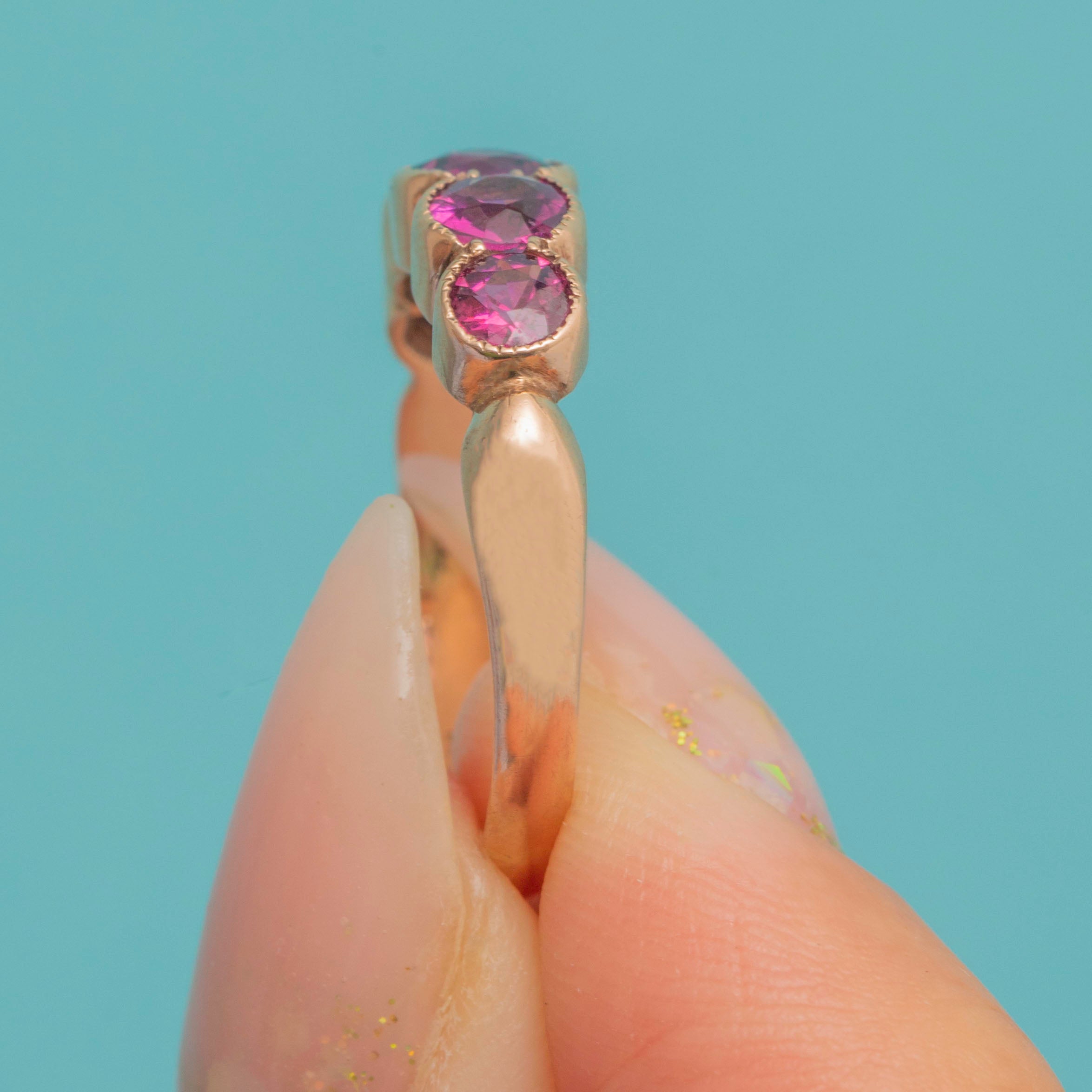 EXCELLENT: The Garnets are bright, securely set, and well-matched in colour. The Gold band is smooth and polished, with hallmarks clear and legible. No damage or repairs are visible, leaving the ring beautifully preserved.