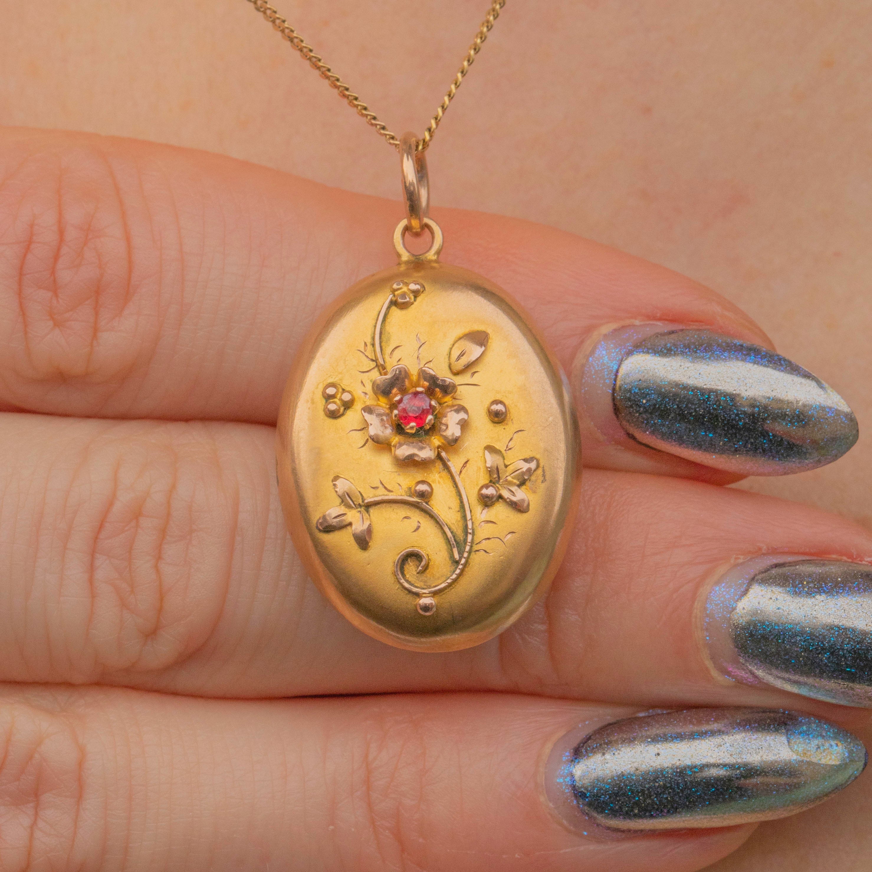 Crafted from buttery 9ct Gold, this antique locket features a gorgeous floral motif on her front panel and is adorned by a deep crimson Garnet in her centre, marrying the warmth of the Gold.