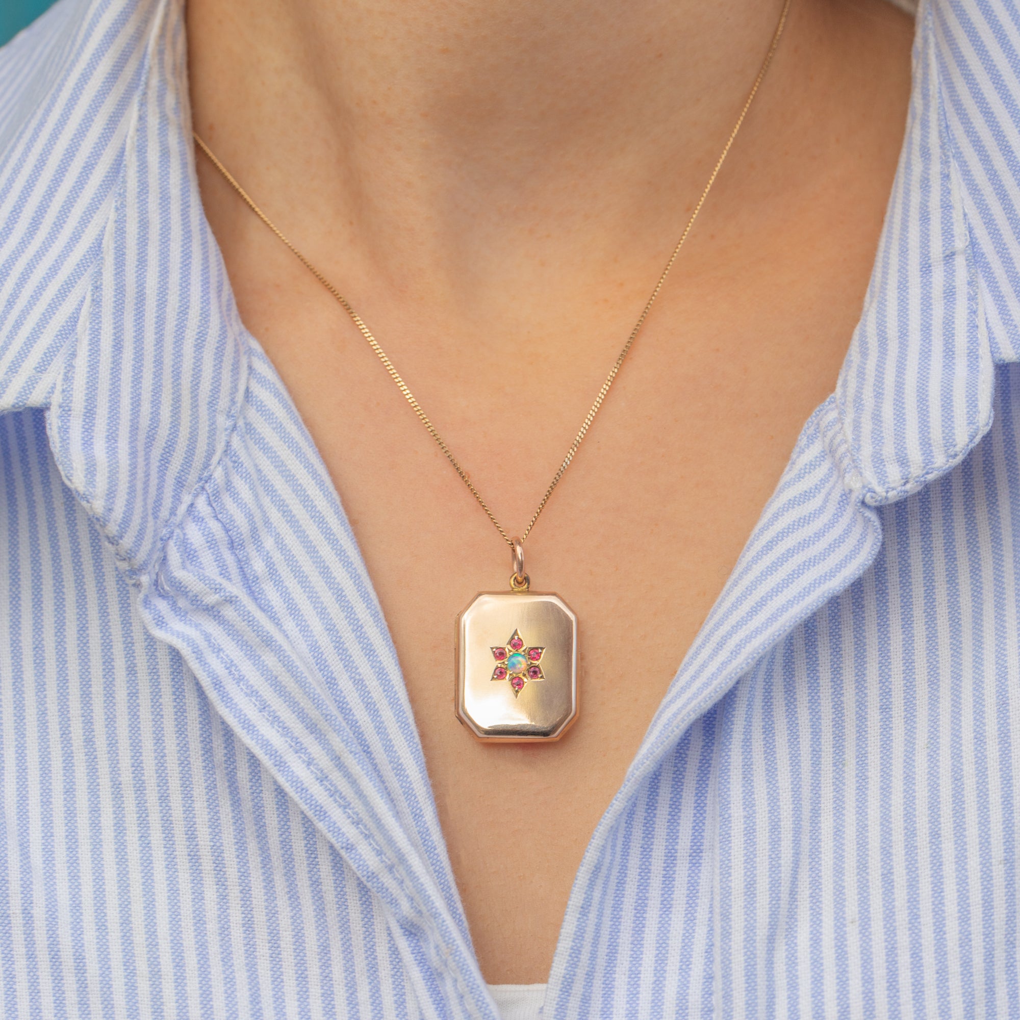 This lovely Edwardian 9ct Gold locket features a charming flower motif set with glowing Garnets haloing a central Opal. The rectangular form gives it a refined silhouette, while the gemstones add a delicate burst of colour and light. The locket opens smoothly to reveal space for two photographs or mementos, a classic expression of Edwardian romance and sentimentality.