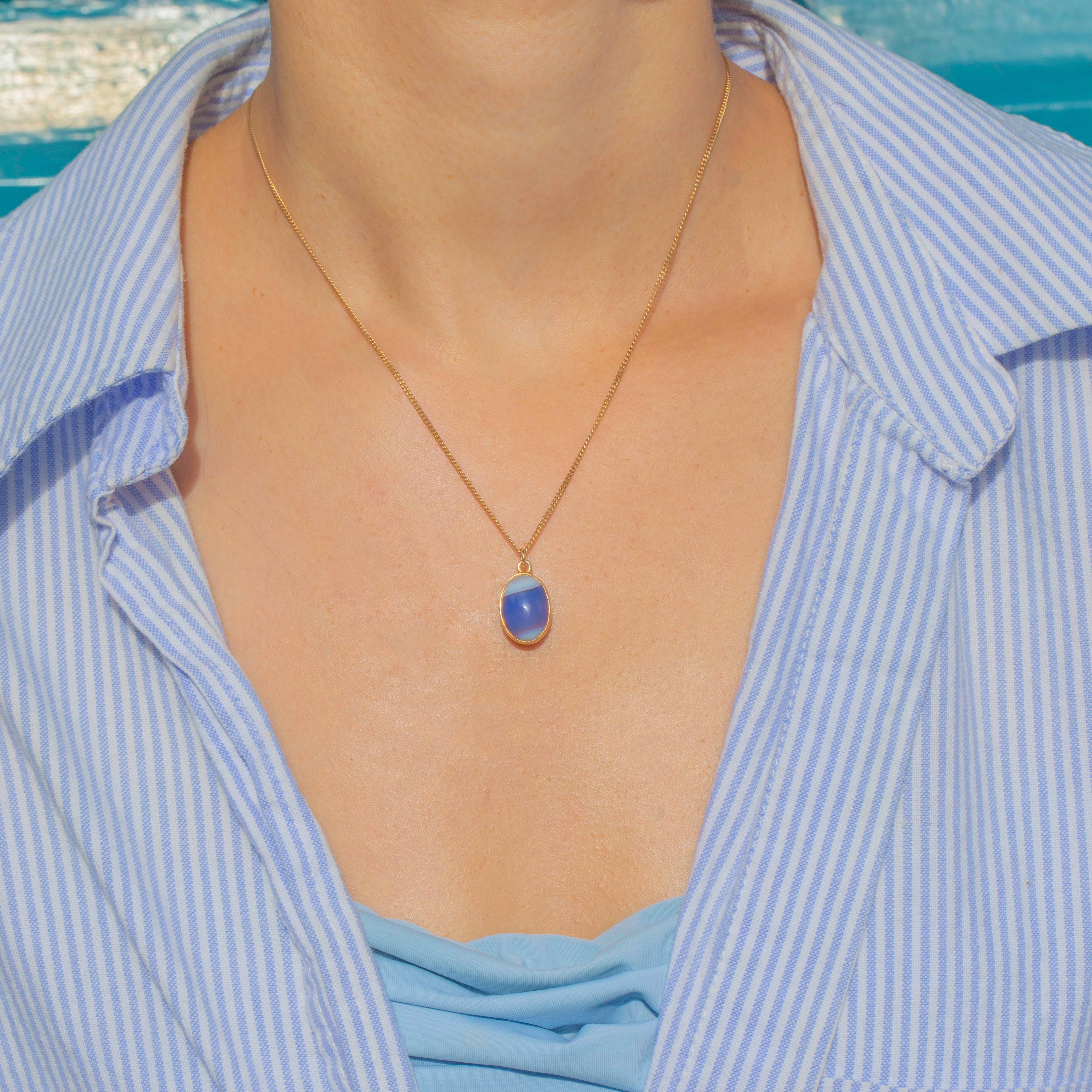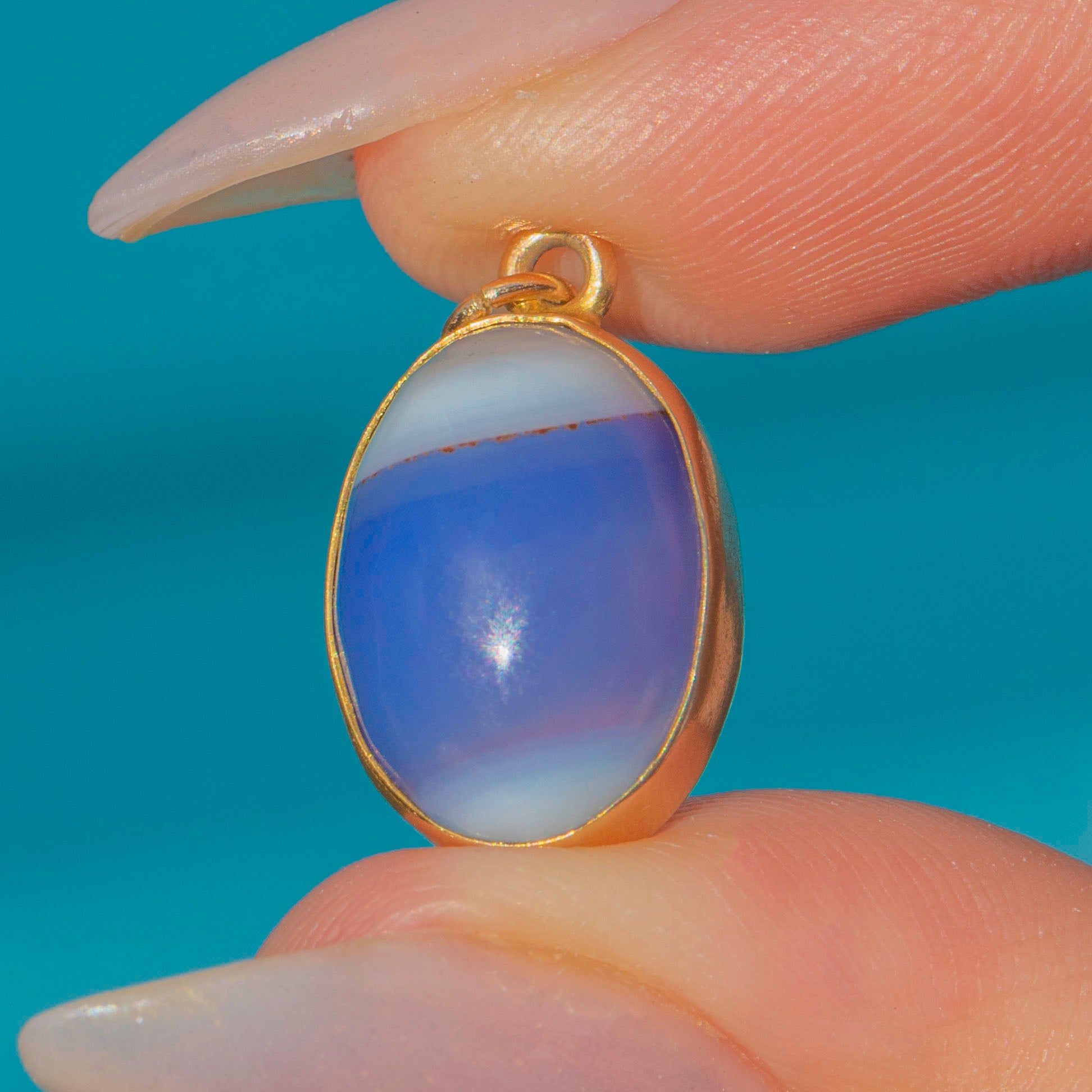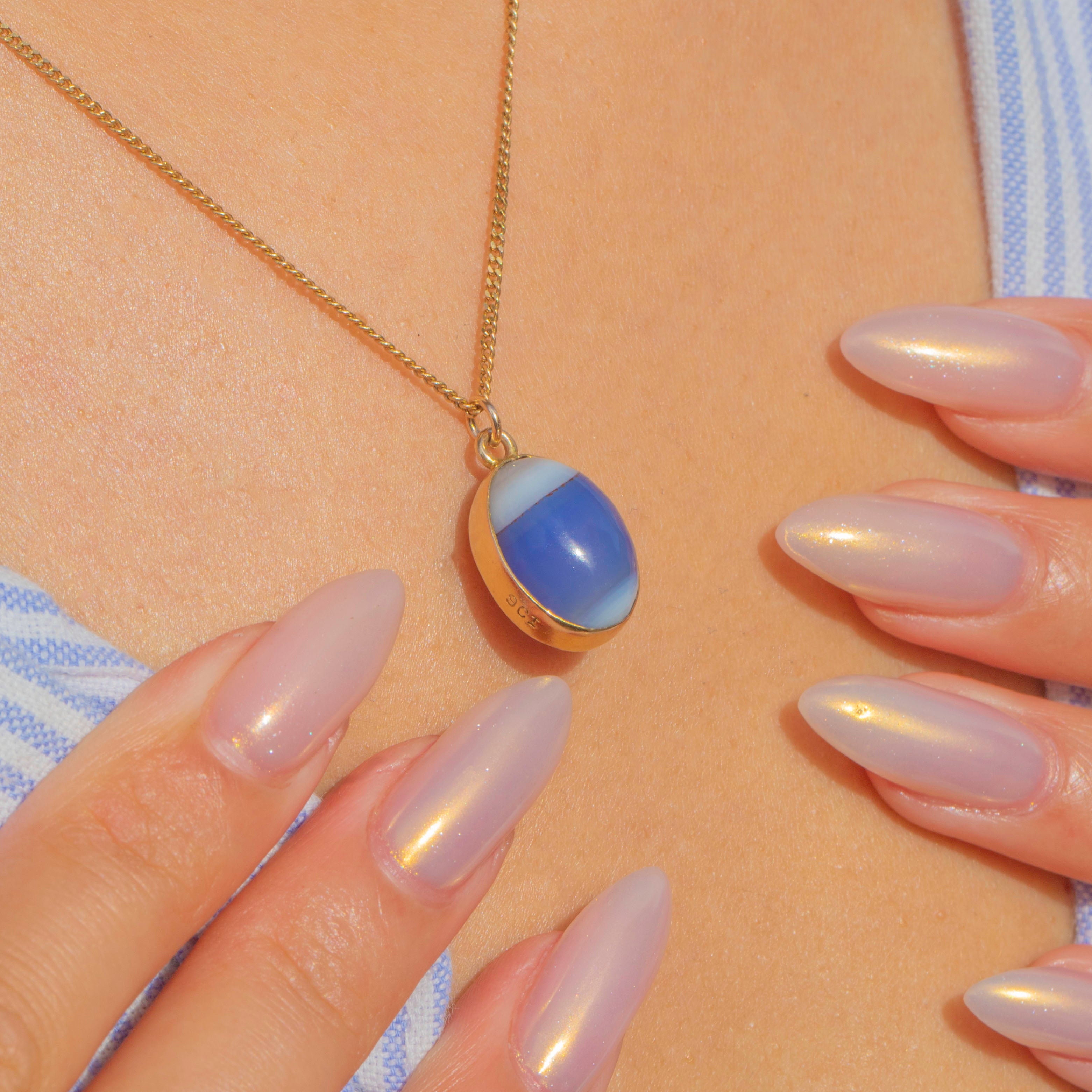 A rare and delightful Edwardian charm, this miniature egg is crafted in solid 9ct Gold and set with two striking cabochons: a reddish-brown Jasper on one side and a blue-and-white banded Chalcedony (Agate) on the other. A simple band of Gold encircles the centre, adding a refined touch to this tactile piece. Smooth to the touch and richly coloured, it’s a charming example of early 20th-century jewellery design.