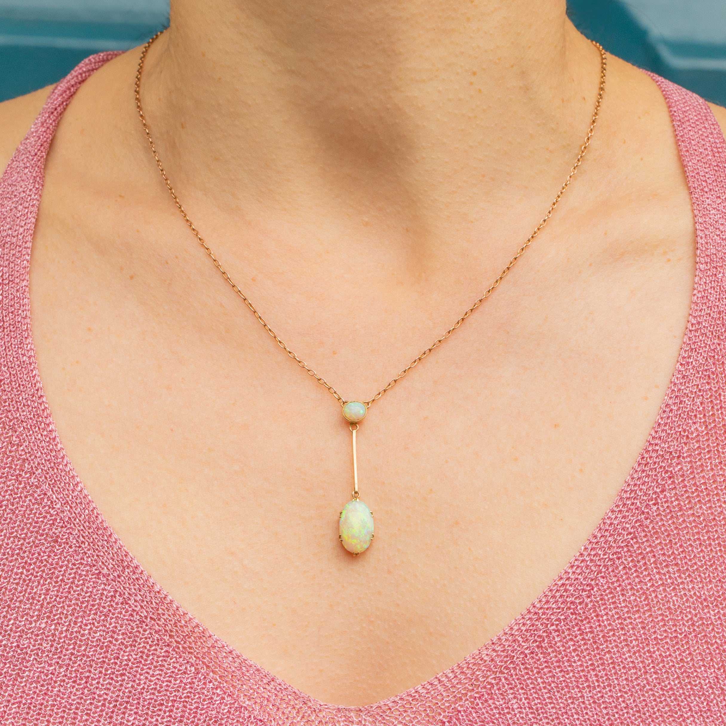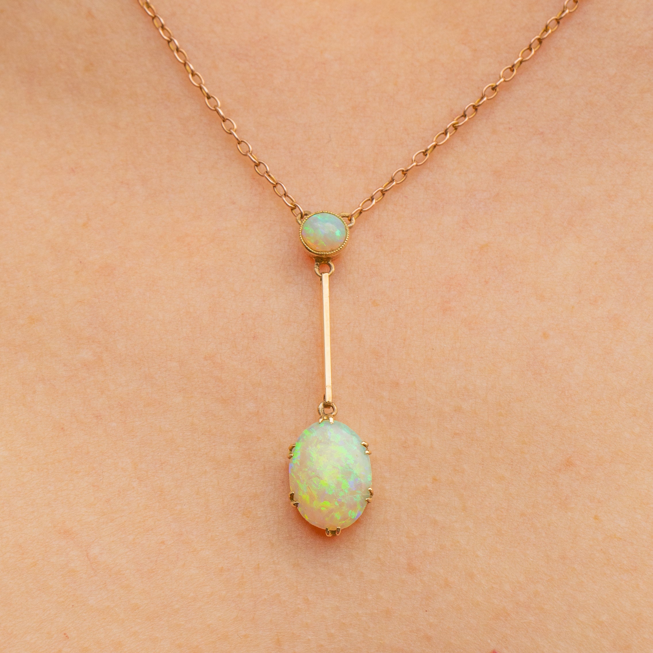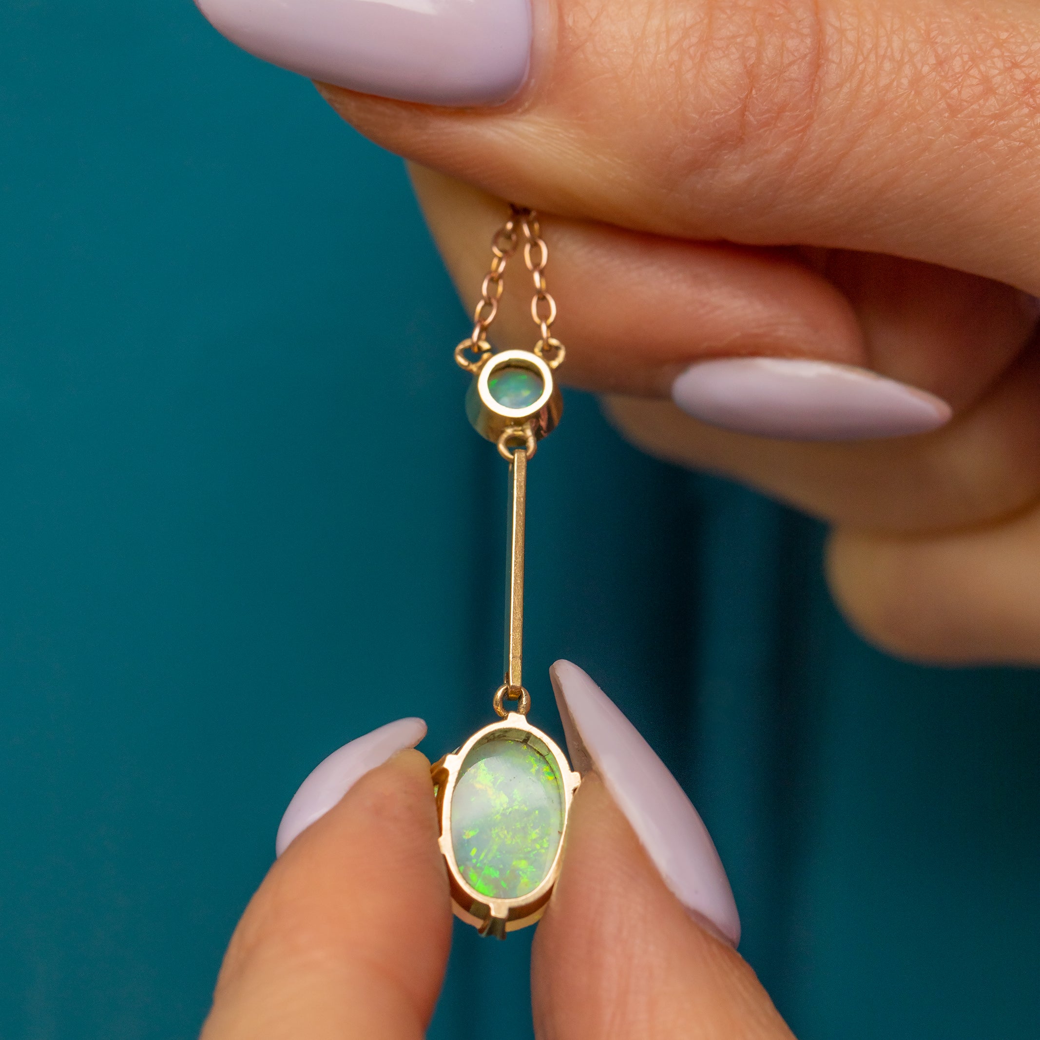 This outstanding Edwardian 9ct Gold Opal drop necklace will add a touch of ethereal charm to any outfit in an instant! The two smoothly domed Opal cabochons shimmer with iridescent flashes of neon green and blue, revealing hints of orange and pink as they catch the light.