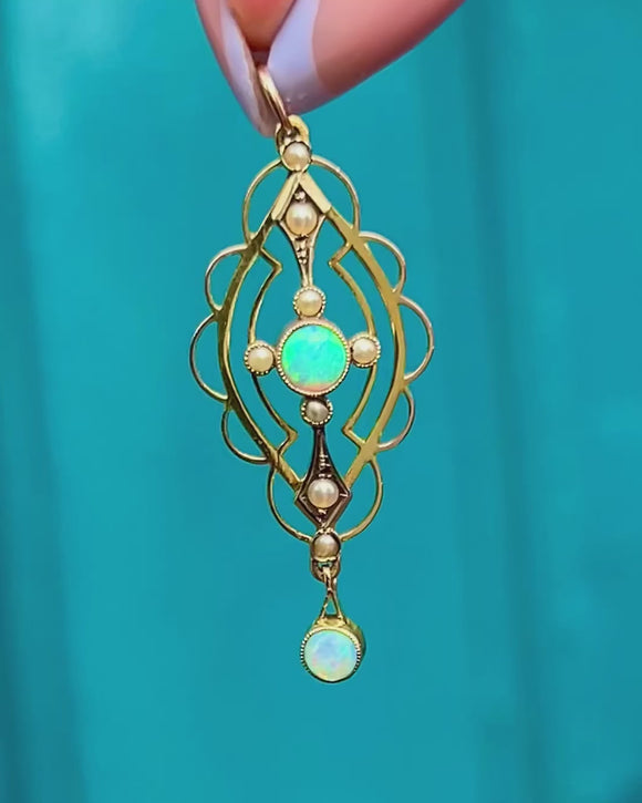 Edwardian 9ct Gold Opal Pearl Drop Pendant