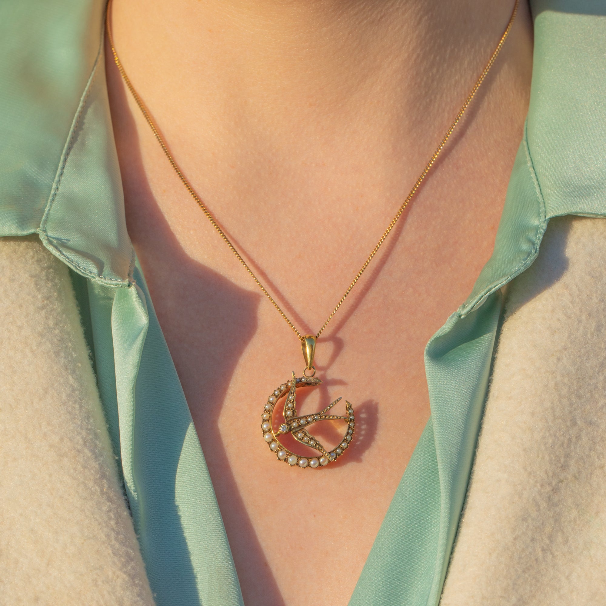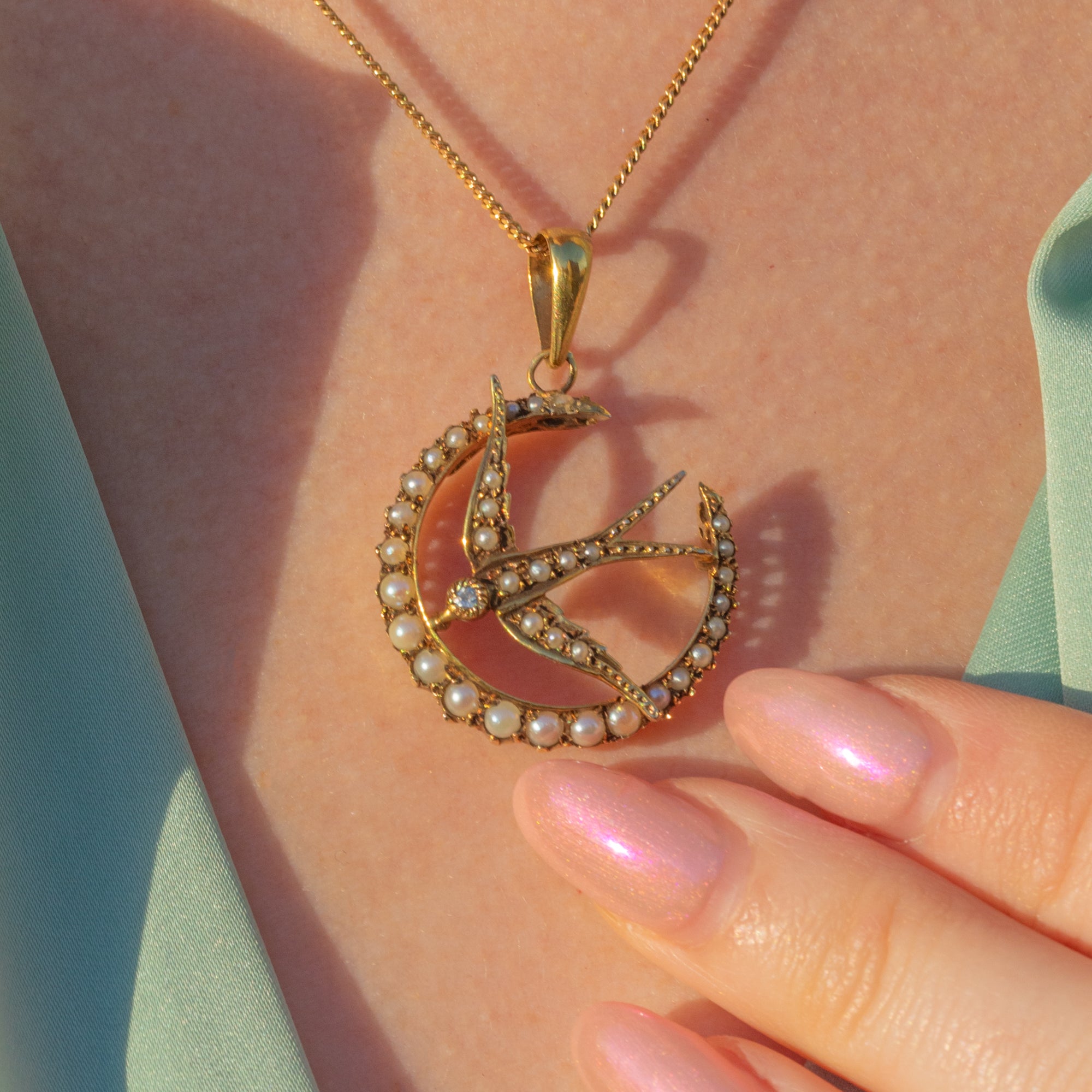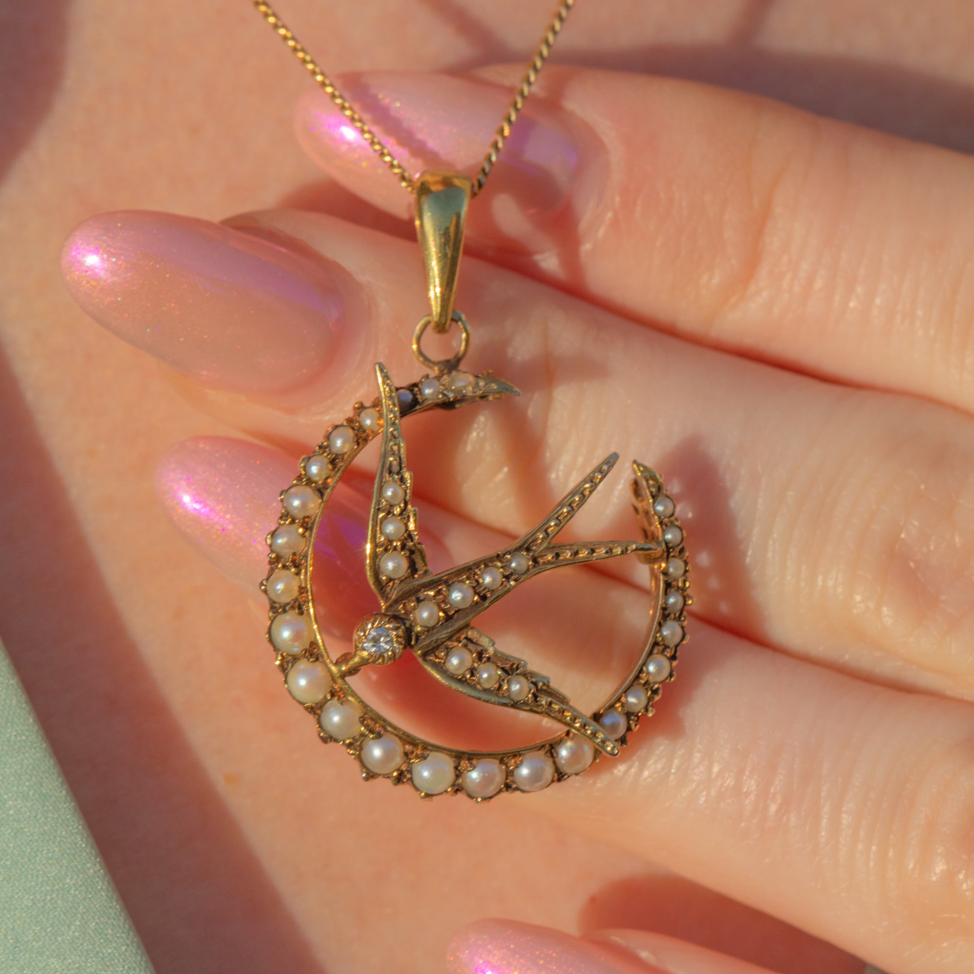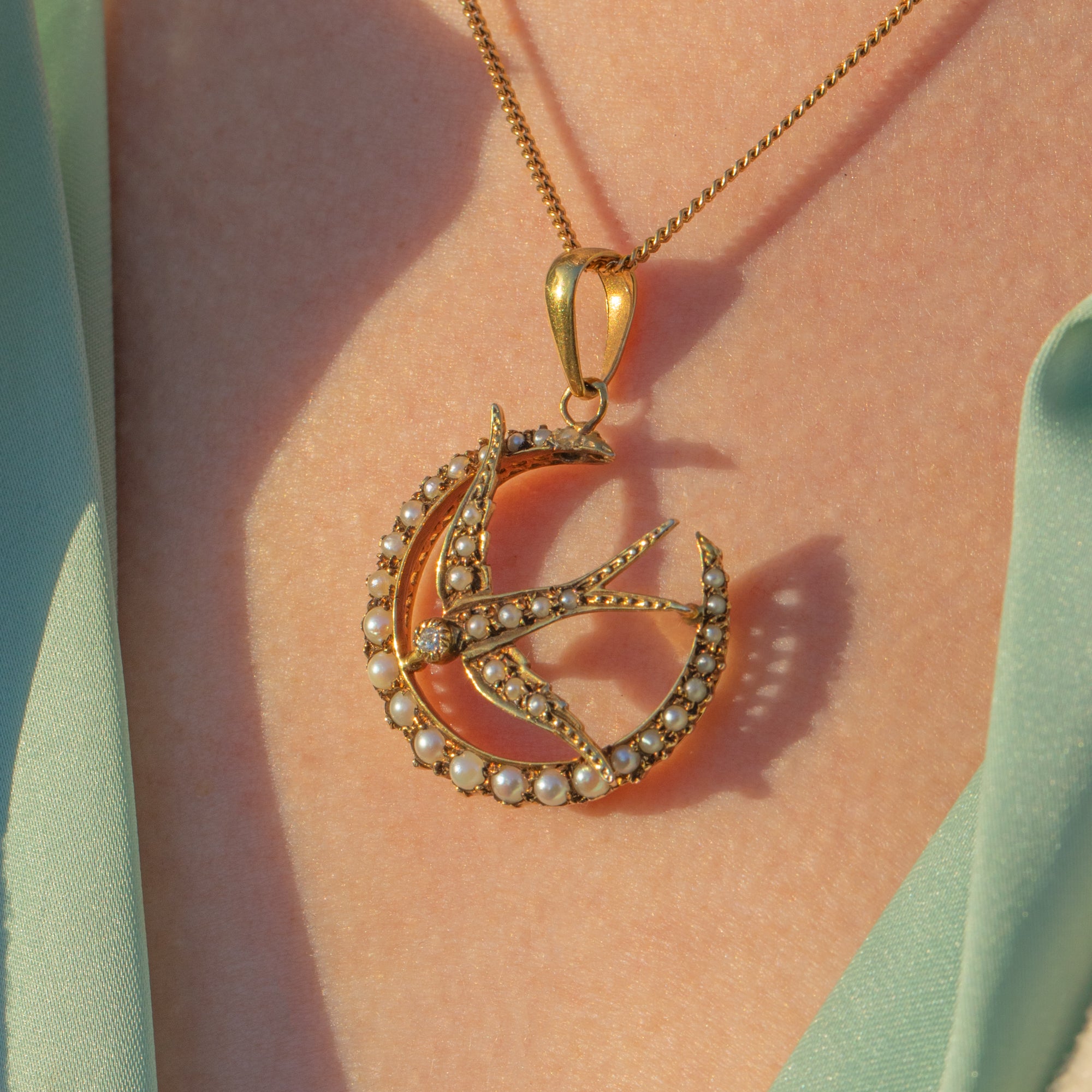 This Edwardian 9ct Gold Pearl Diamond crescent moon & swallow pendant would make a thoughtful gift for a loved one.