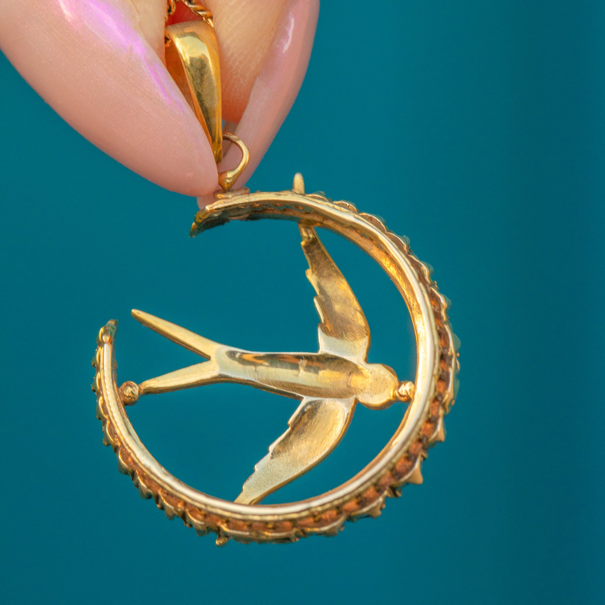 Not only is this a striking pendant, swallows are a symbol of new beginnings, and it can be worn close to the heart when worn with an antique Gold chain!