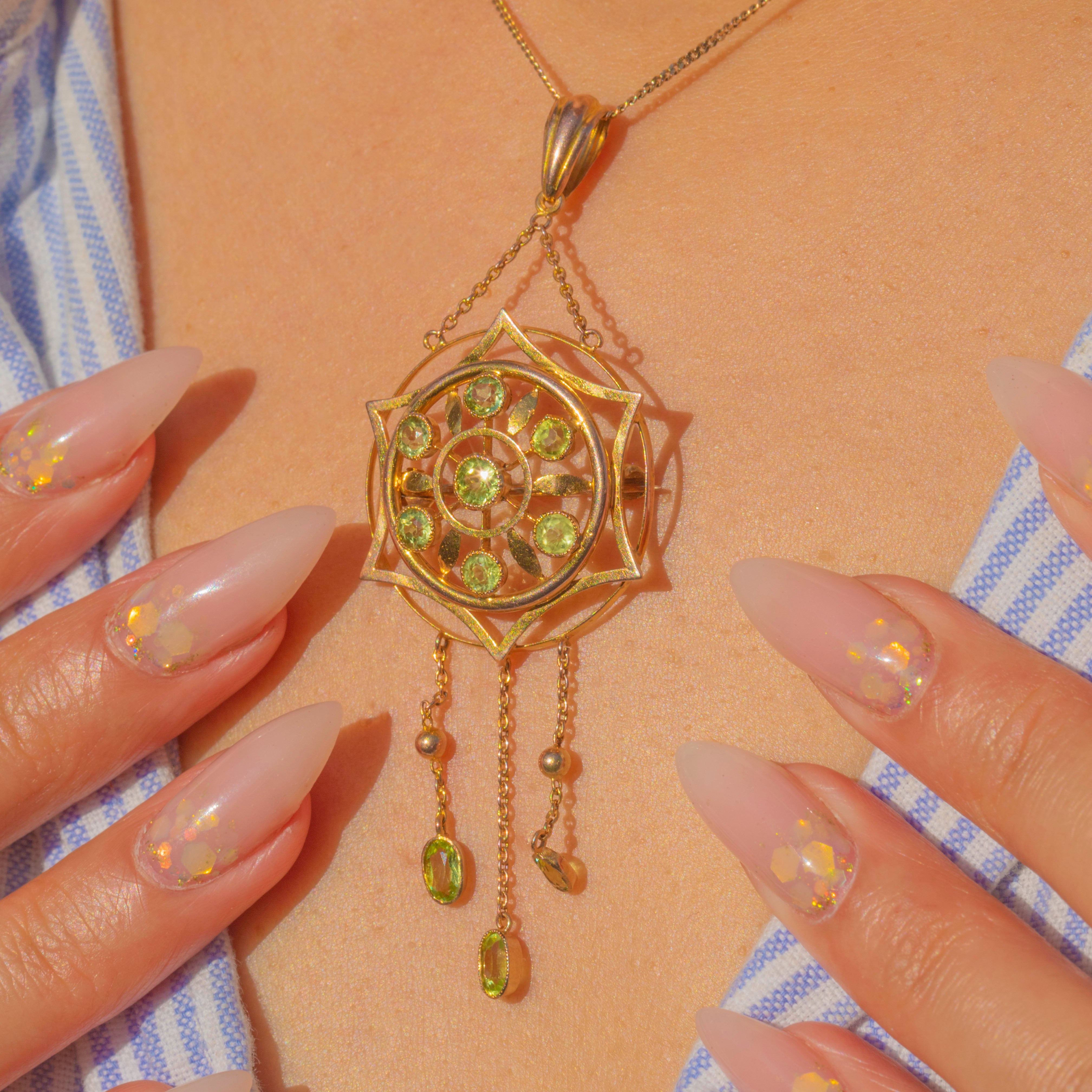 This exquisite Edwardian pendant is crafted in 9ct Yellow Gold and set with zingy green Peridots. Designed with a circular centrepiece resembling a starburst motif, the pendant is set with seven sparkling round Peridots radiating from the middle. From the base hang three delicate Gold chains, each suspending an oval Peridot drop, adding movement and elegance.