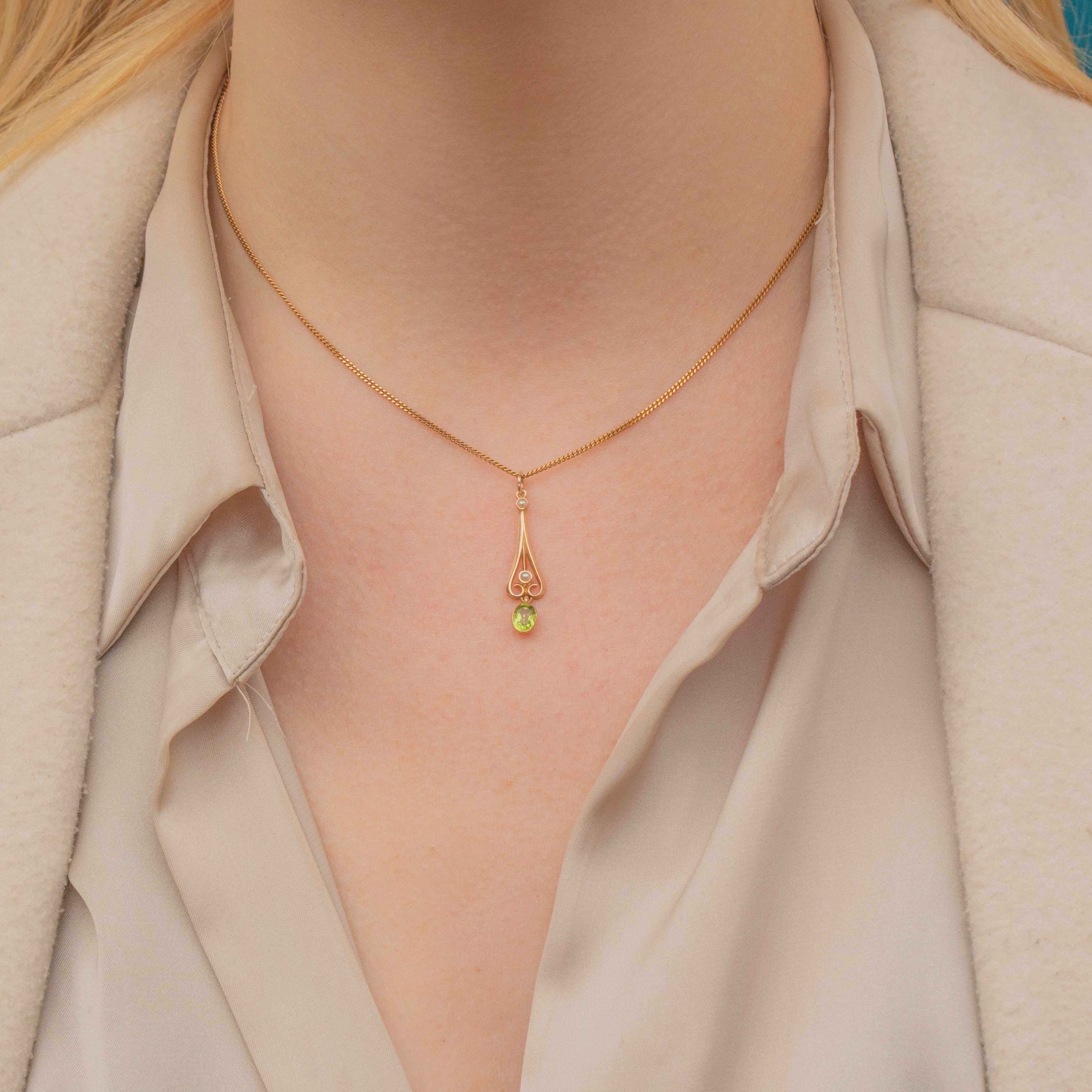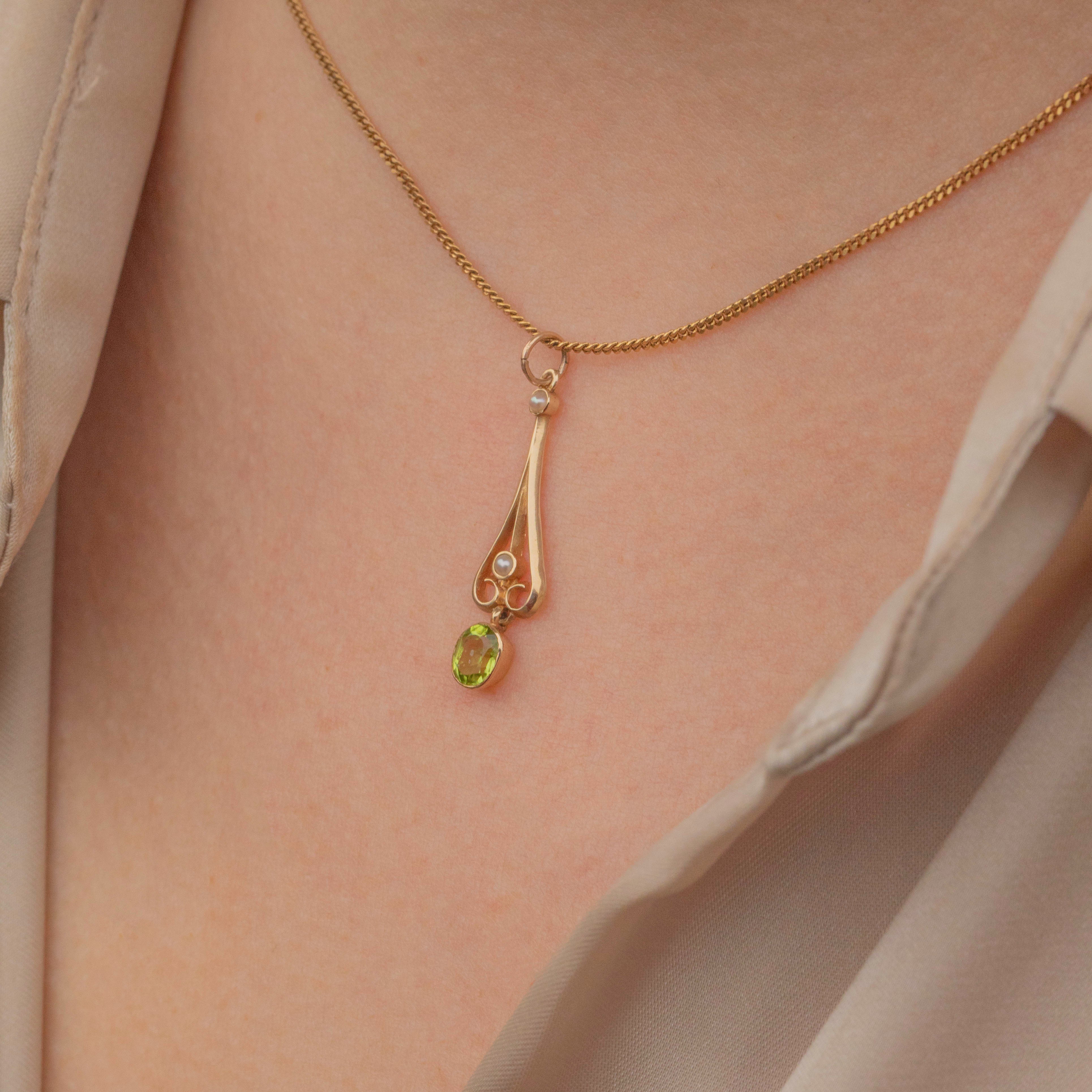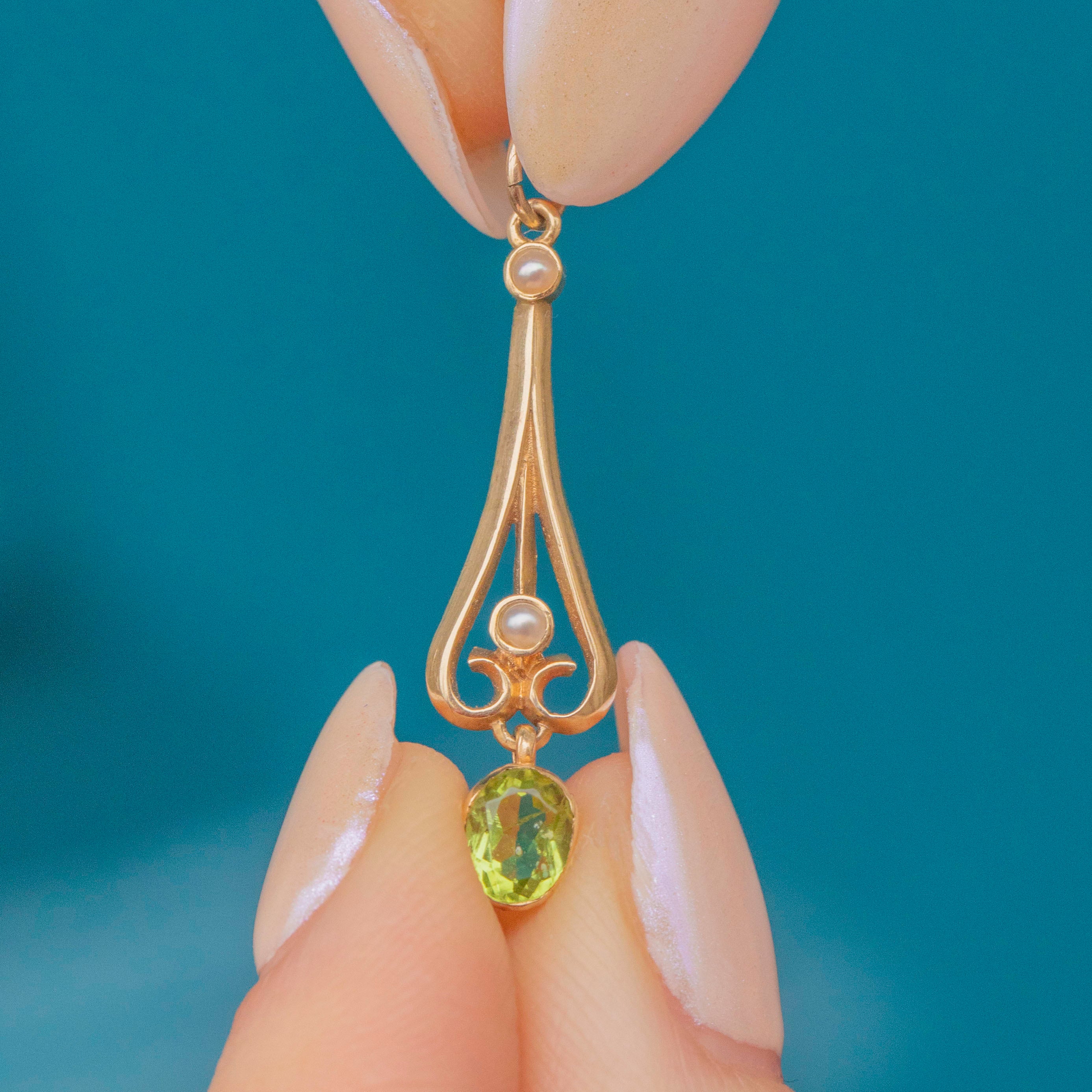 This stunning Edwardian 9ct Gold Peridot Pearl drop pendant features a timeless design that embodies early 20th-century elegance. Two lustrous seed Pearls sit gracefully above a captivating, dangling Peridot gemstone, which showcases a vibrant green hue.
