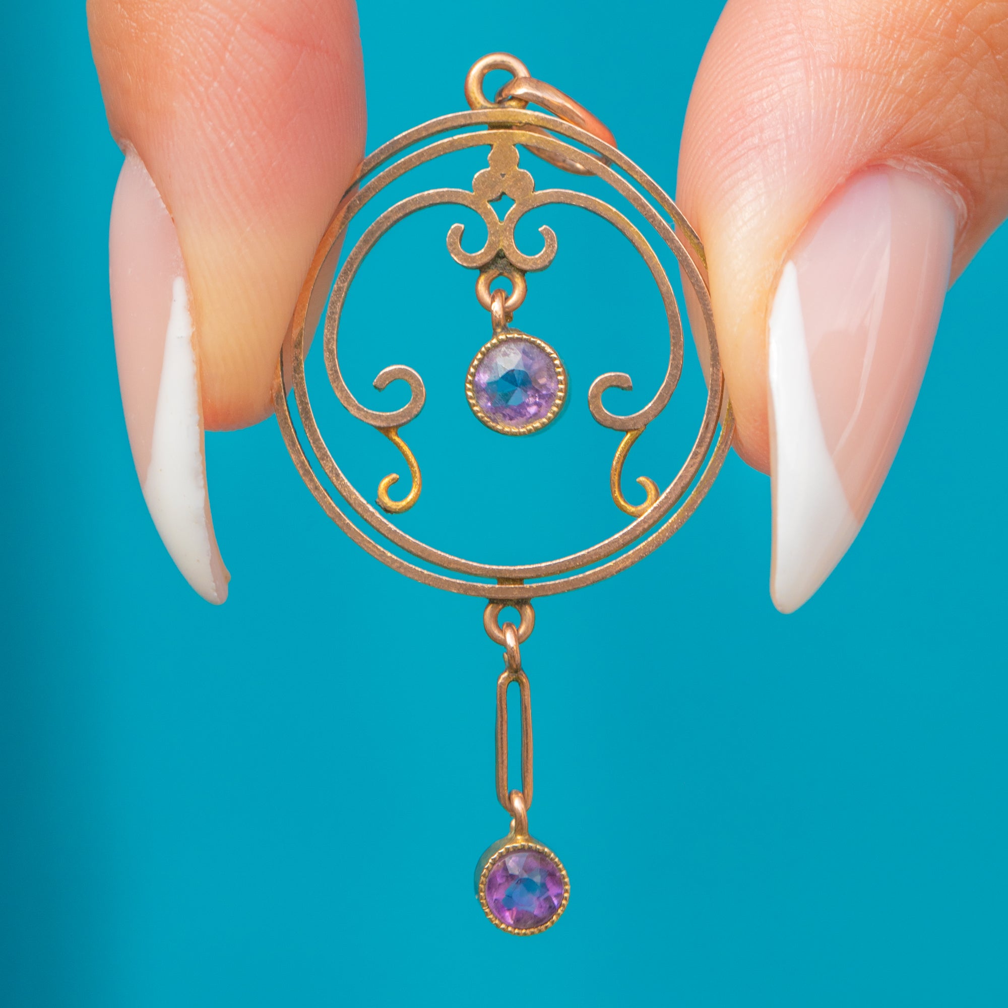 This Edwardian pendant is a fine example of delicate antique design, crafted in 9ct Gold and set with two bright purple Amethysts. The open circular frame is adorned with graceful scrollwork, from which the Amethysts are suspended in articulated drops.